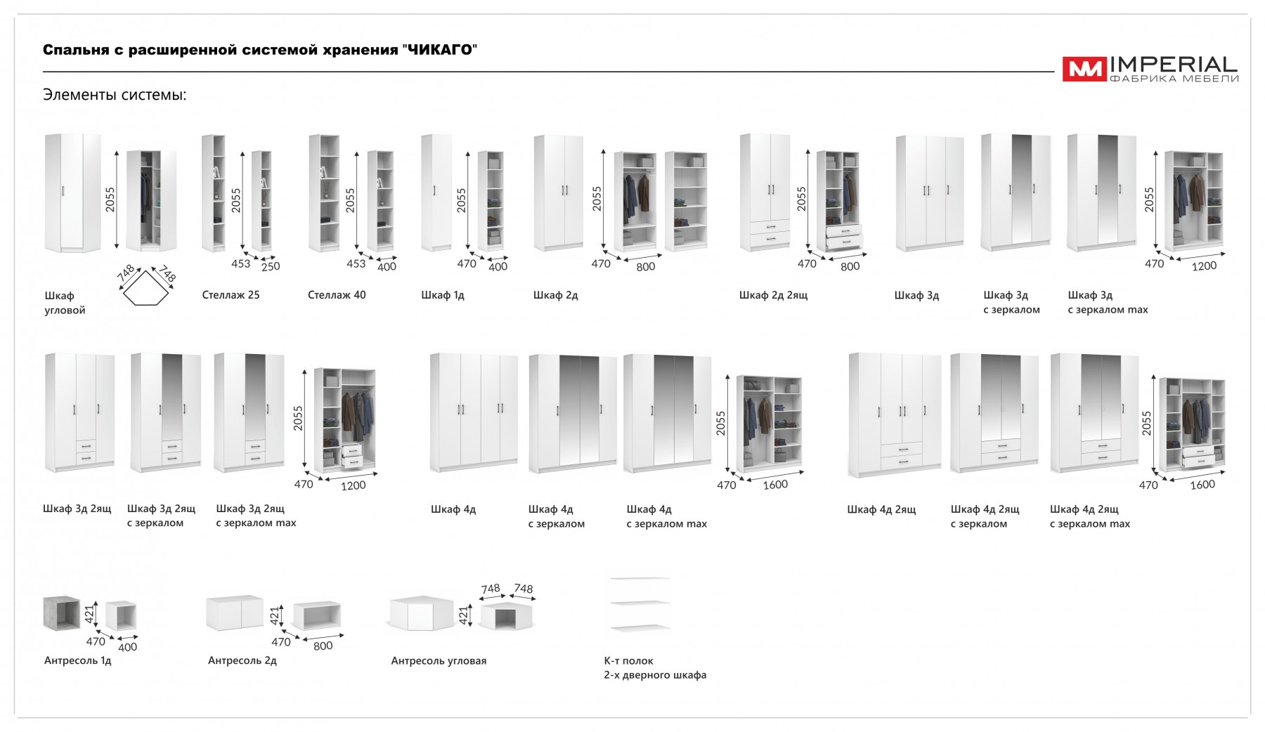 • Шкафы 2,3,4-х дверные с глухими фасадами; с зеркалами и комбинированные; с выдвижными ящиками