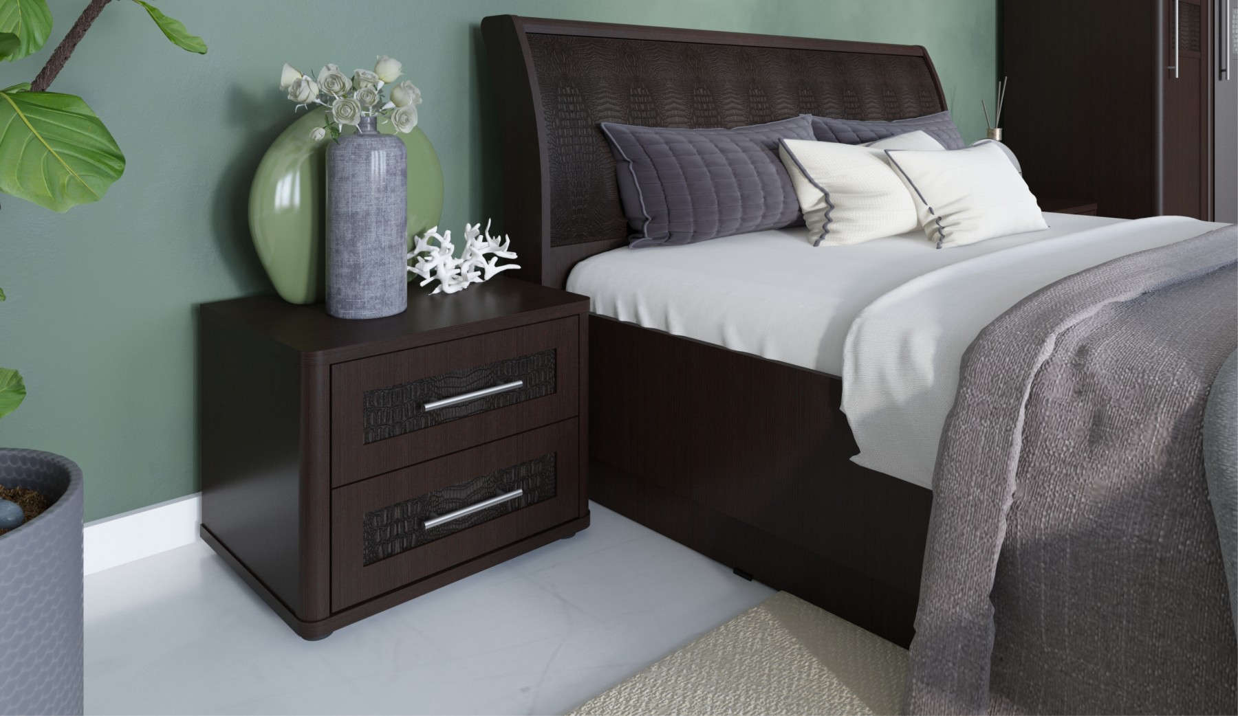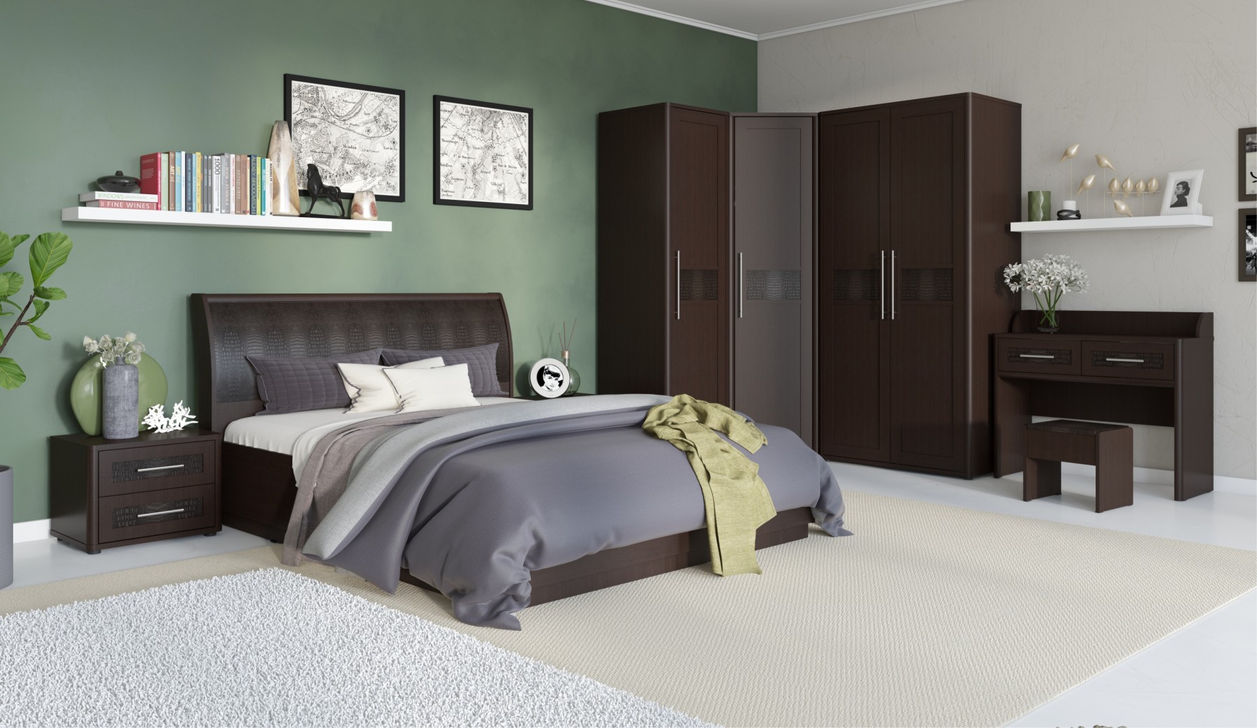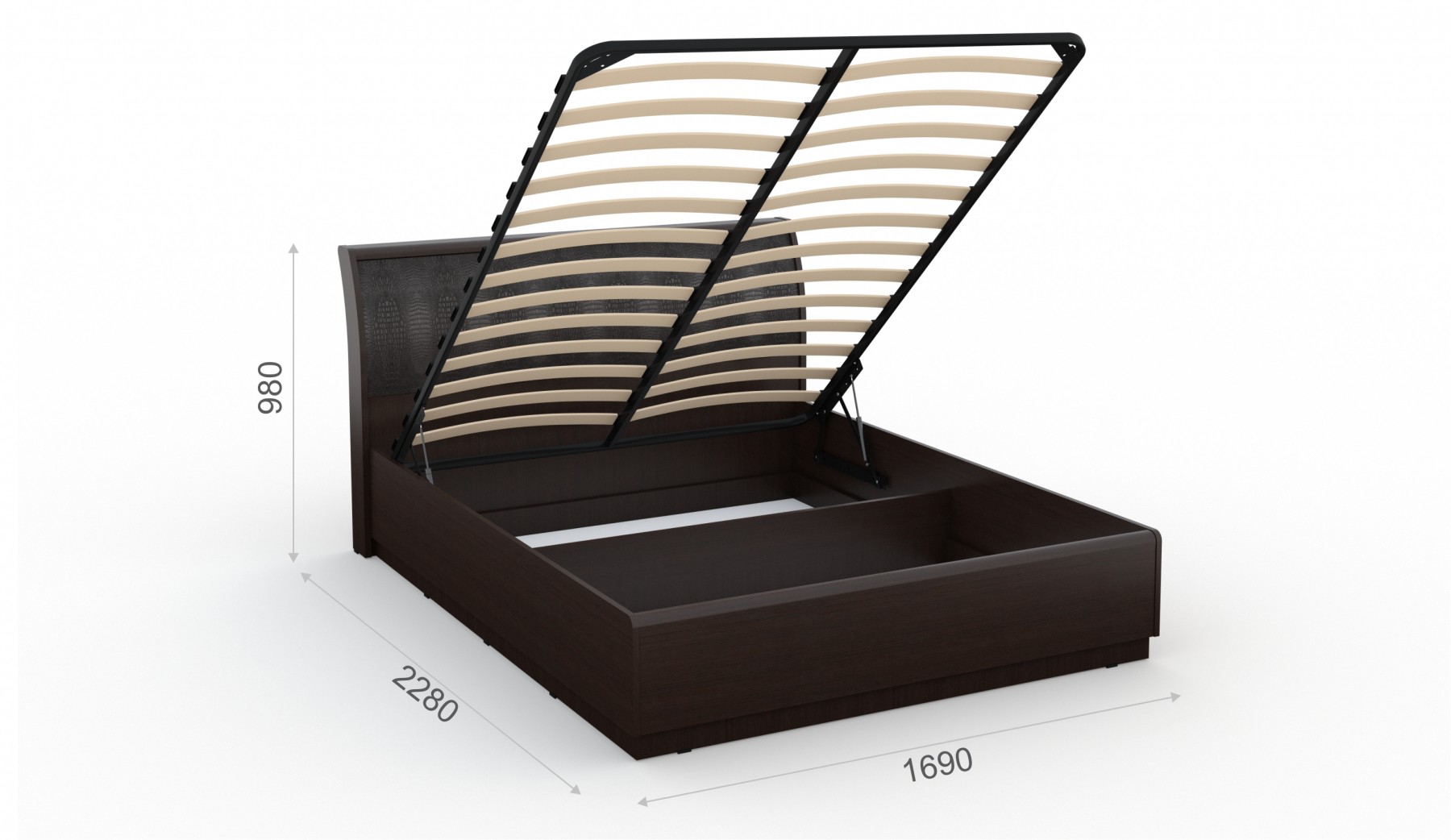 Кровать Токио - выполнена в японском стиле: простая геометрия, лаконичная изысканность форм, благородный цвет венге. Плавный изгиб и мягкое наполнение изголовья обеспечивают комфорт в использовании, а обивка из экокожи крокодила станет дорогим украшением интерьера спальни. Изголовье кровати прочное и устойчивое: две фигурные опорные стойки из утолщенной плиты придают жесткость конструкции, а сверху установлена система профилей из МДФ 32мм - удобно, практично и красиво. Кровать можно ставить не только у стены – изголовье сзади обито листом ХДФ в цвет корпуса. Кровать Токио с ортопедическим основанием на металлическом стальном каркасе и газовых лифтах, надежно фиксируется в открытом и закрытом положении. Две секции для хранения без ограничения по весу - можно складывать подушки, одеяла и любые другие вещи.