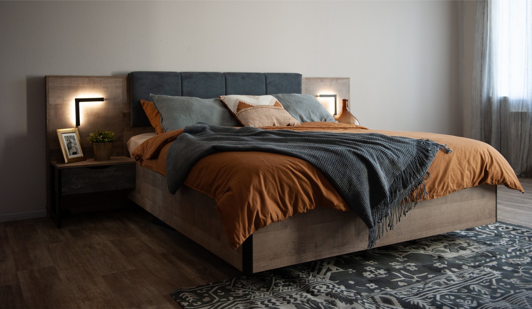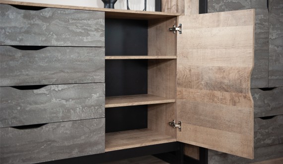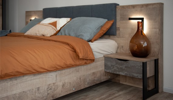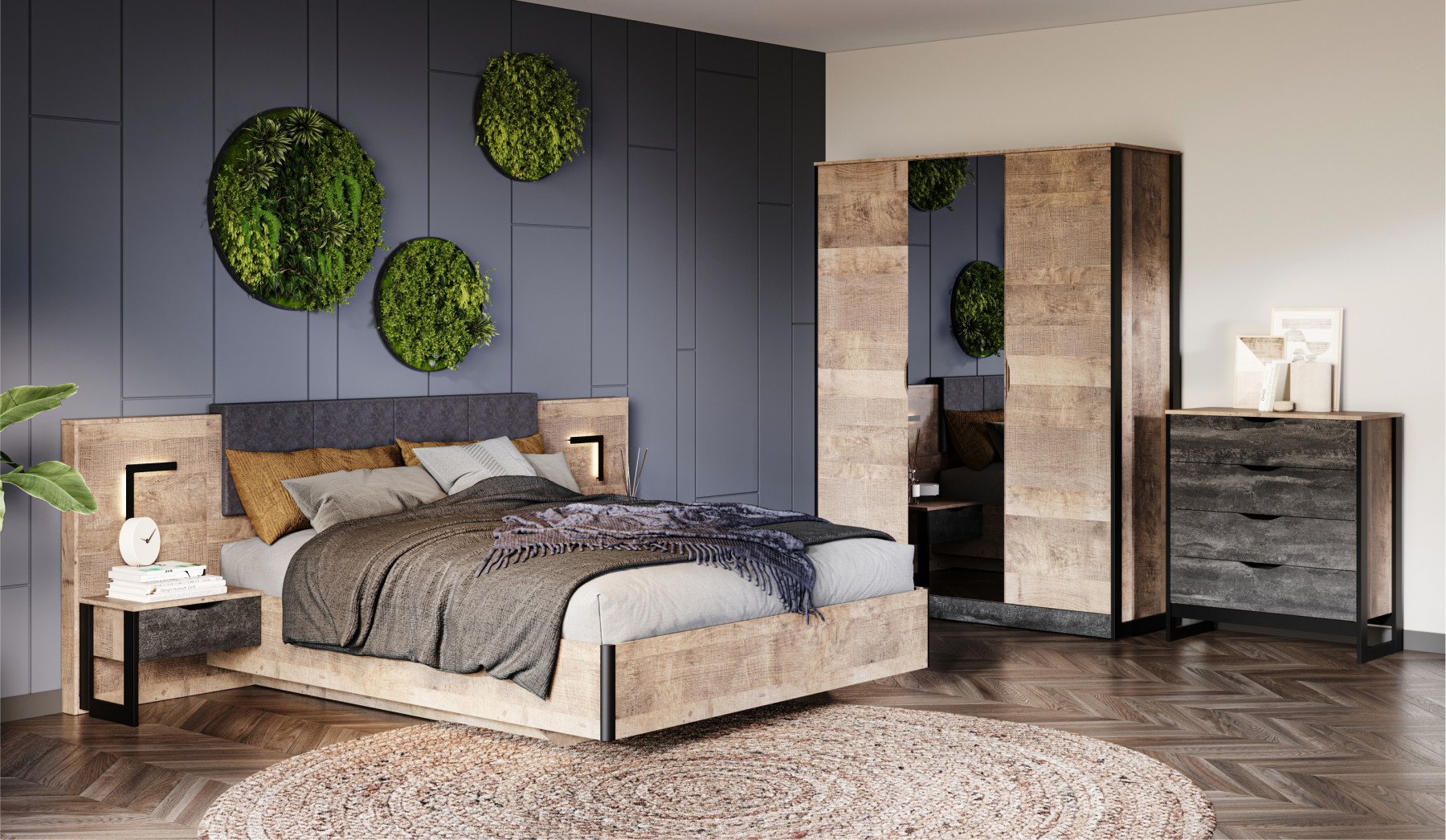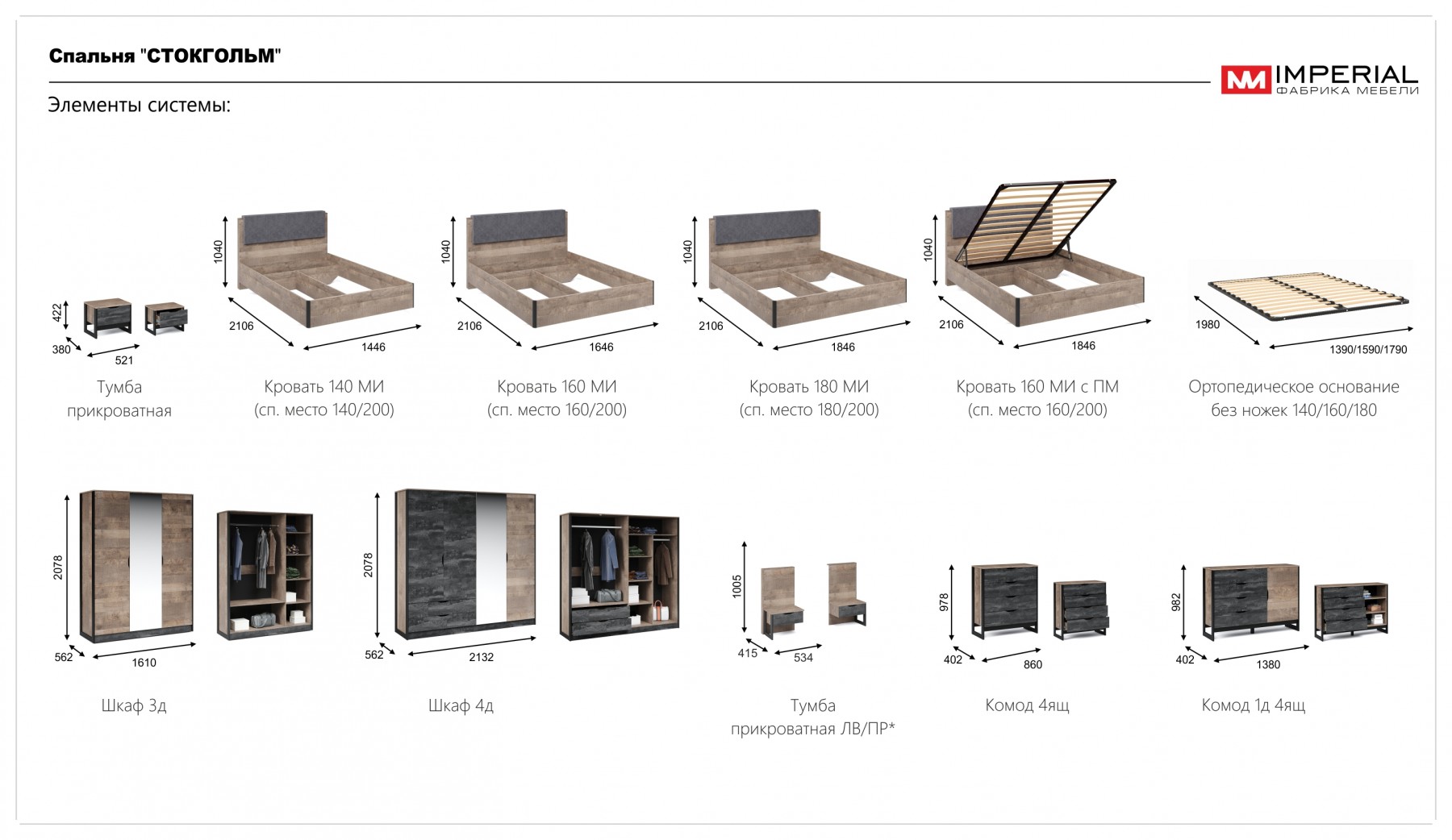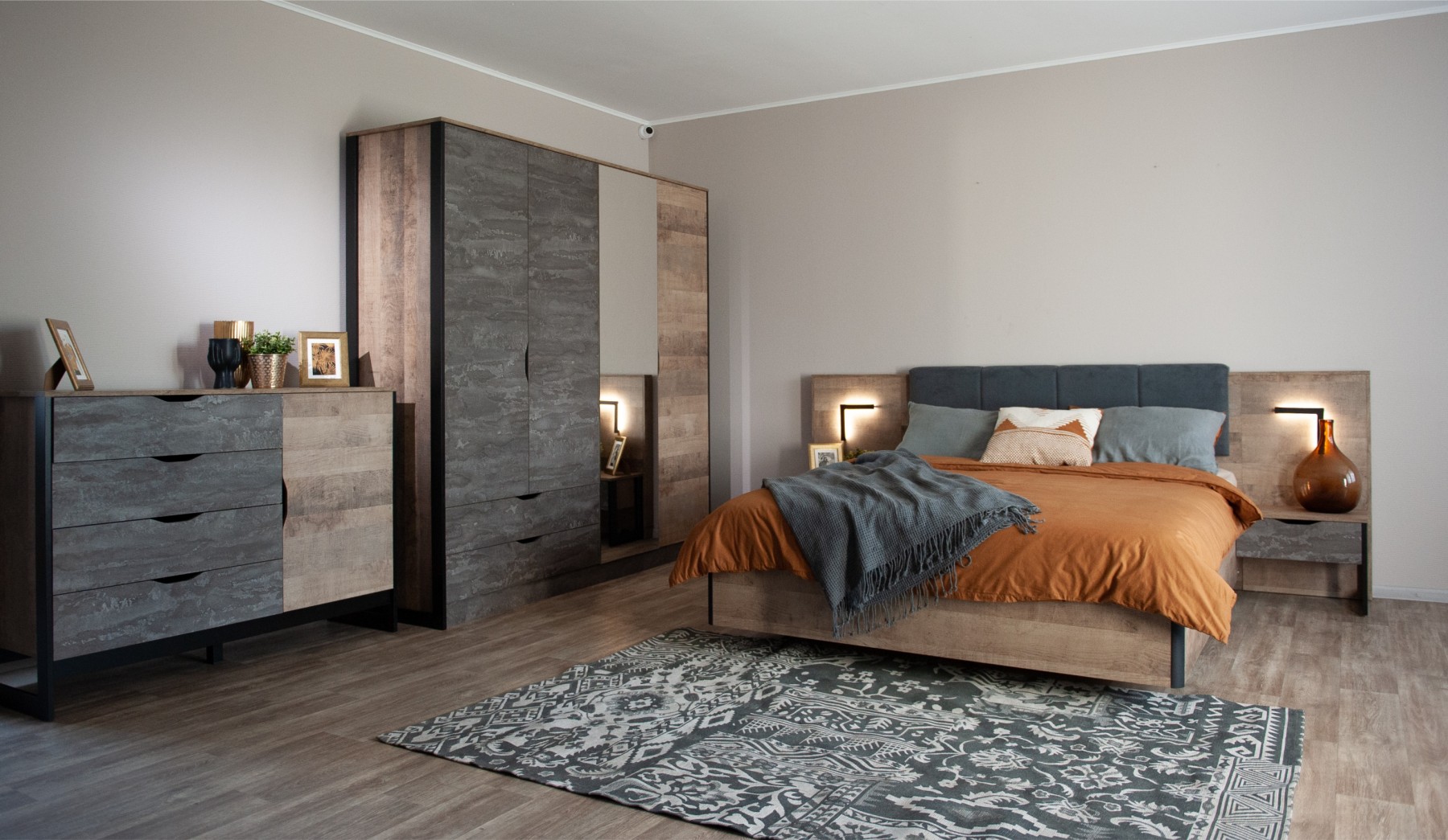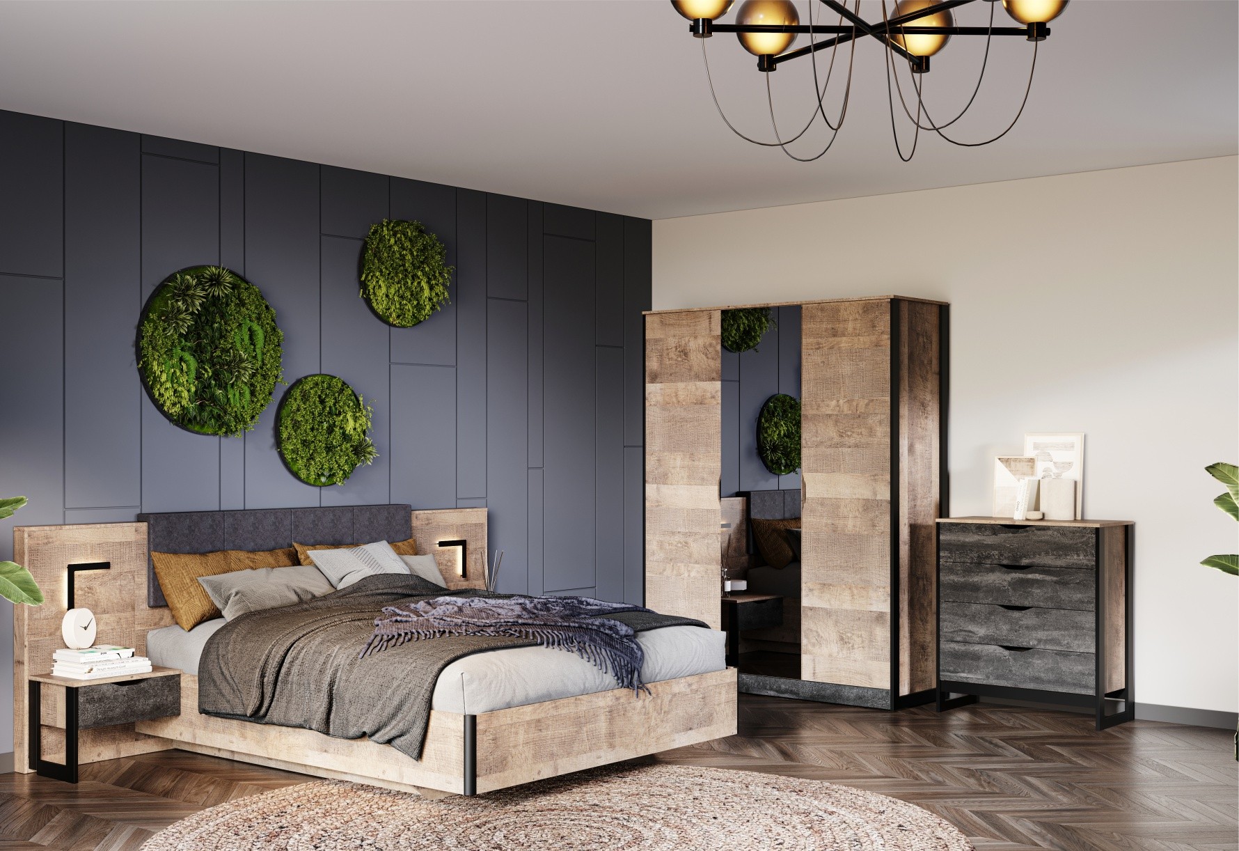 Спальня "Стокгольм" - это современная функциональная система, которая станет главным украшением лофтового интерьера. Особенность дизайна - это сочетание реалистичных по цвету и тактильности трендовых декоров, которые соответствуют последним городским тенденциям. "Дуб Гранж" привлекает имитацией вручную обработанного дерева с выразительной зернистой текстурой, характерной формой досок. Стильный серый цвет "Железного камня" с металлическими разводами и новая текстура состаренной штукатурки в сочетании с гладкостью металла вносят индустриальный колорит. Оригинальные ножки-опоры из контрастного профиля МДФ, расположенные по бокам модулей, имитируют металл и подчеркивают стиль коллекции. Кровать выполнена в простых и лаконичных формах, мягкая накладка с вертикальной прострочкой комфортно поддерживает спину во время отдыха. Скрытые опоры основания придают эффект парения, создают завораживающий футуристический интерьер.