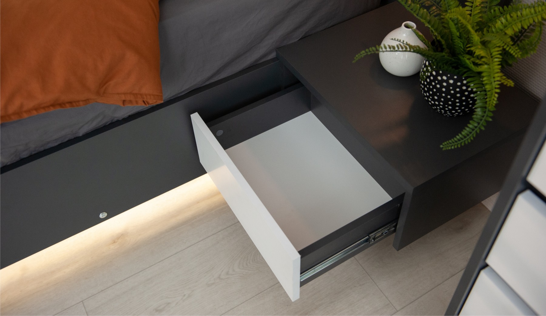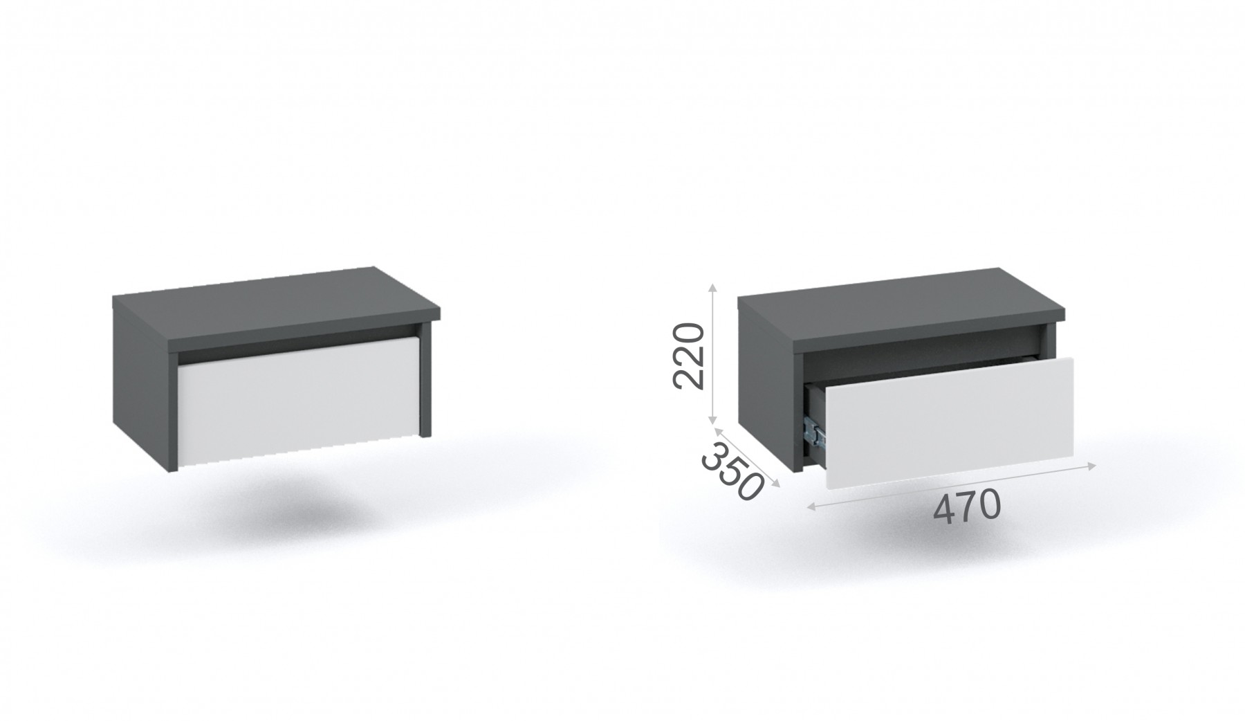 Современная прикроватная тумба Мишель с креплением к кровати создает визуальную целостность и «иллюзию парения». На столешнице поместятся небольшой светильник и необходимые аксессуары, а в ящике с направляющими полного выдвижения удобно хранить личные вещи. Идеально компонуются со всеми модулями системы Мишель.