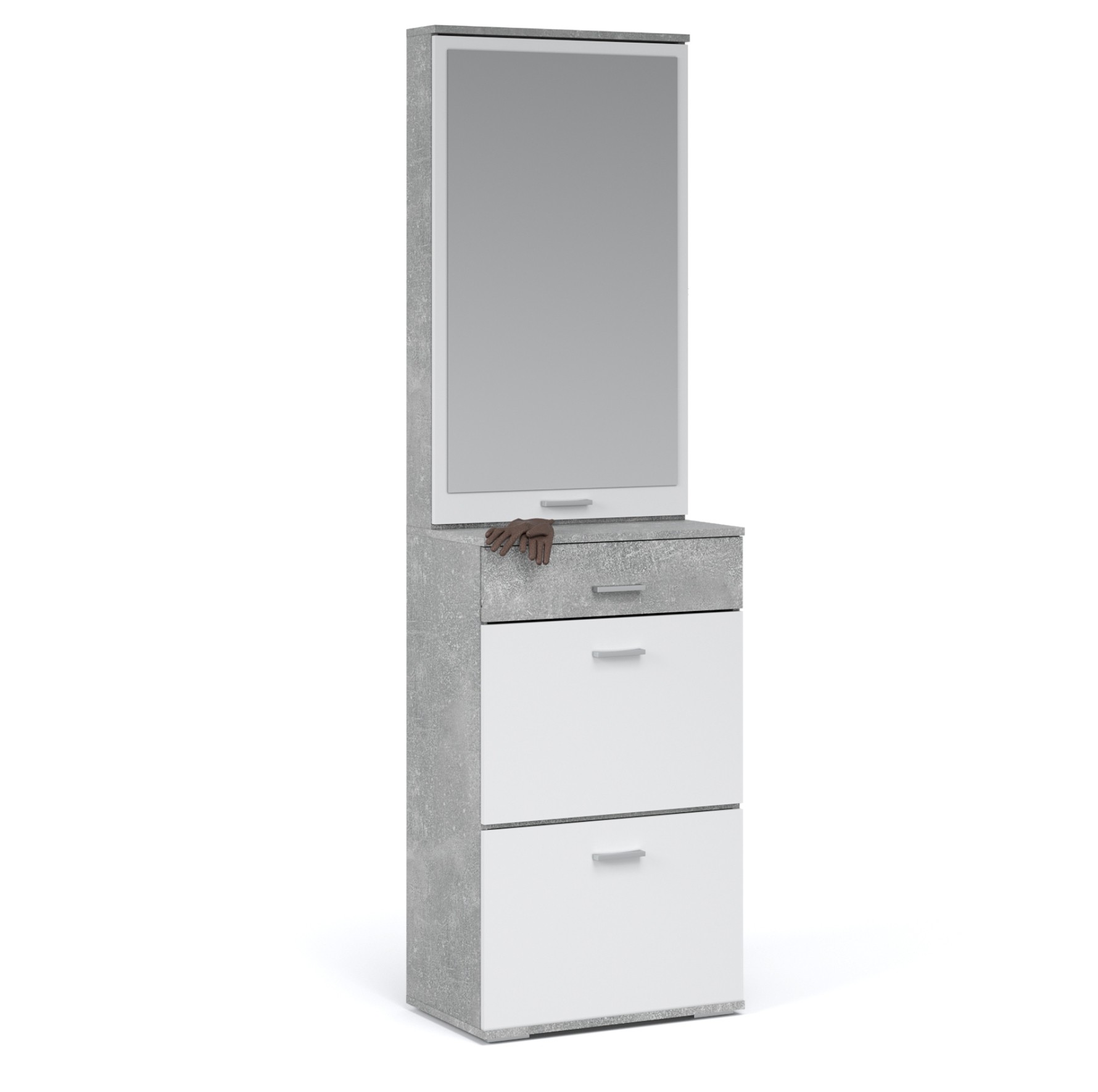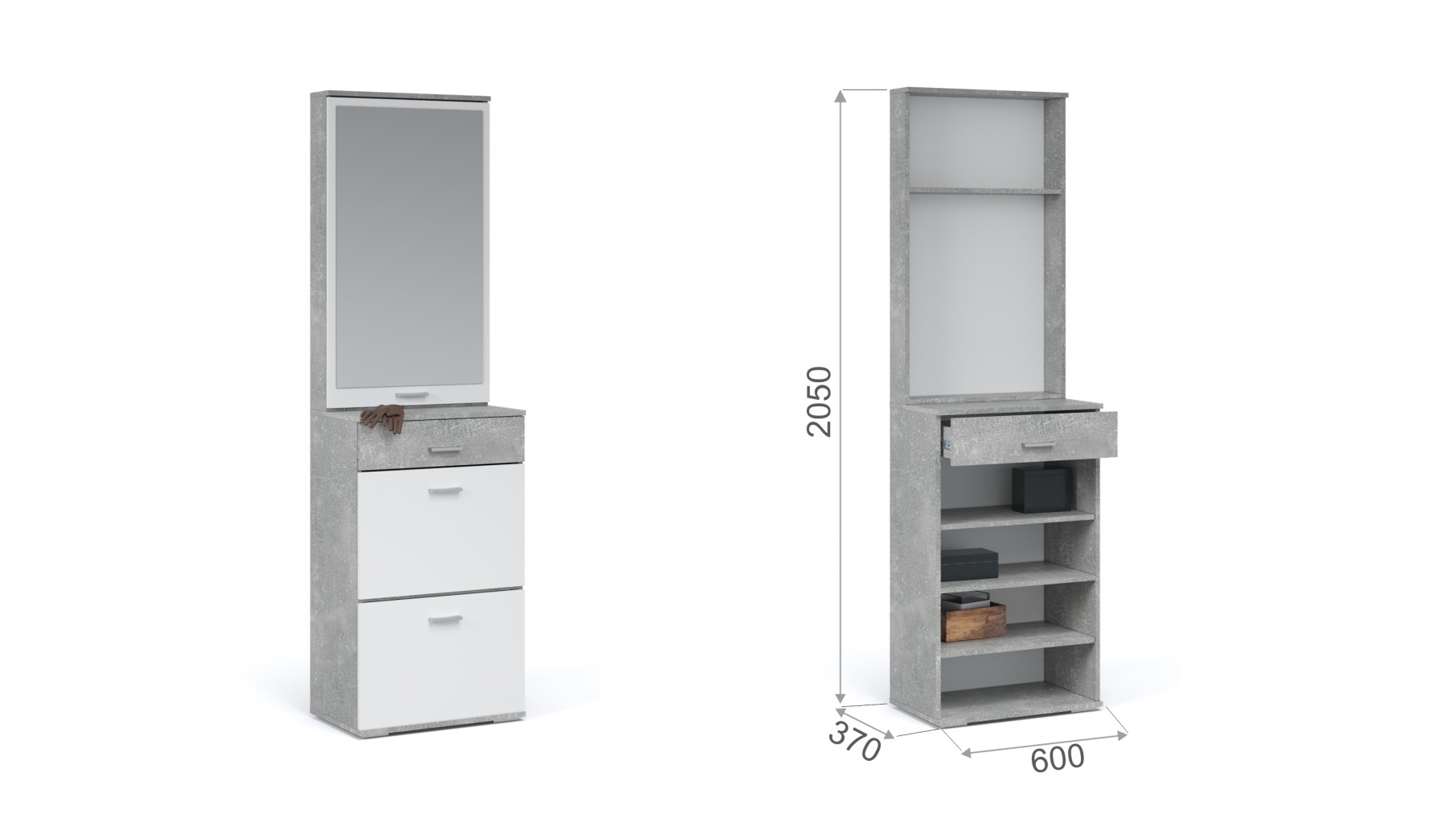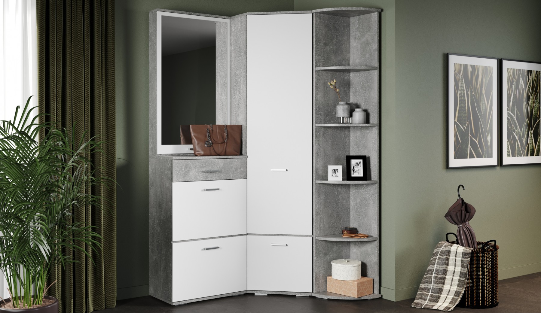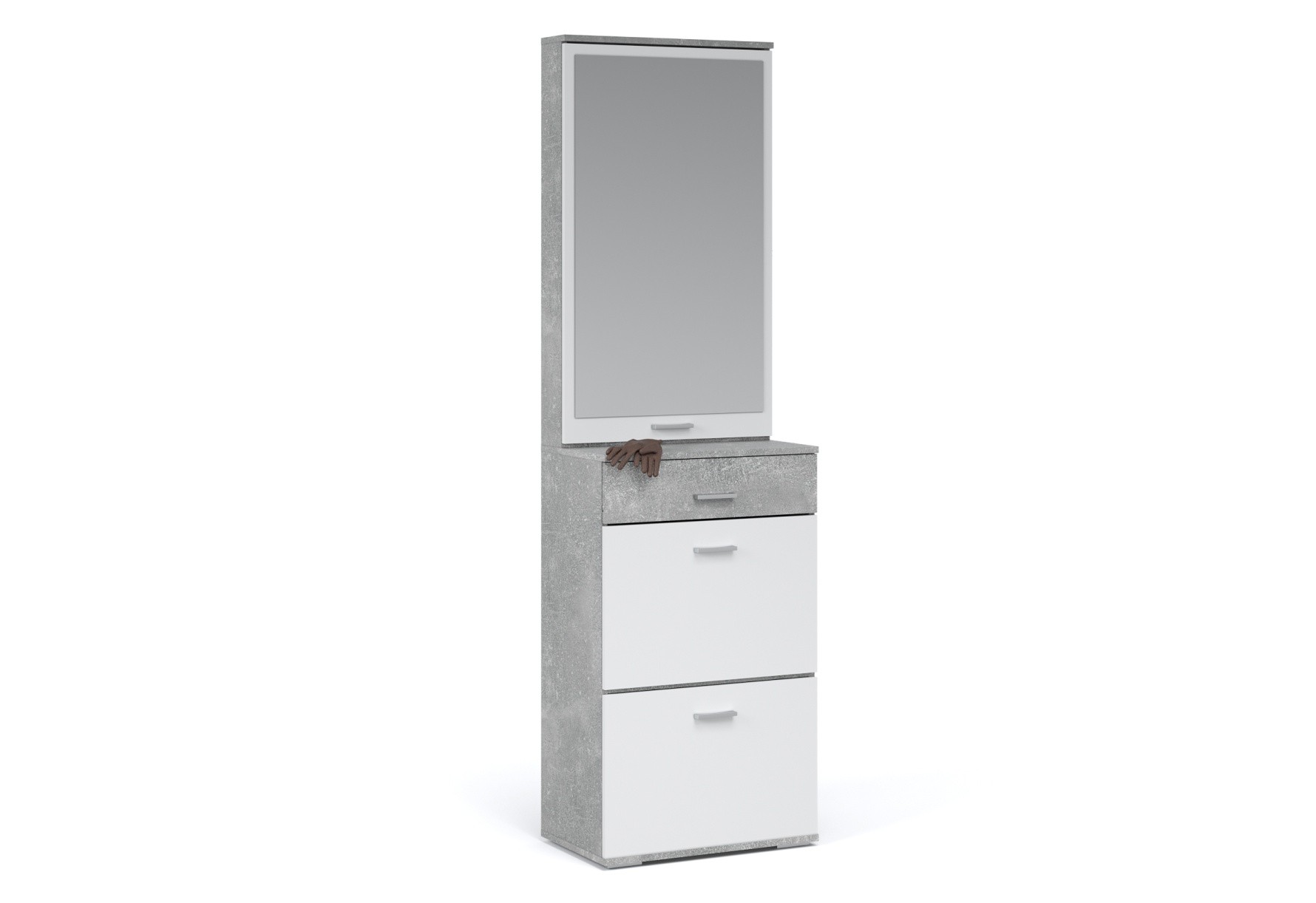 Функциональный модуль вмещает в себя зеркало-шкаф и обувницу с выдвижным ящиком на телескопических направляющих. Зеркало зрительно увеличивает пространство и количество отражённого света, полки за распашным фасадом поместят необходимые вещи – косметику, расчески. Компактная обувница удобна для хранения сезонной и домашней обуви, а выдвижной ящик для ключей или документов. Нейтральные цвета корпуса и фасадов всегда будут актуальны, создают особый комфорт и уют. Идеально компонуется со всеми модулями системы Виола.