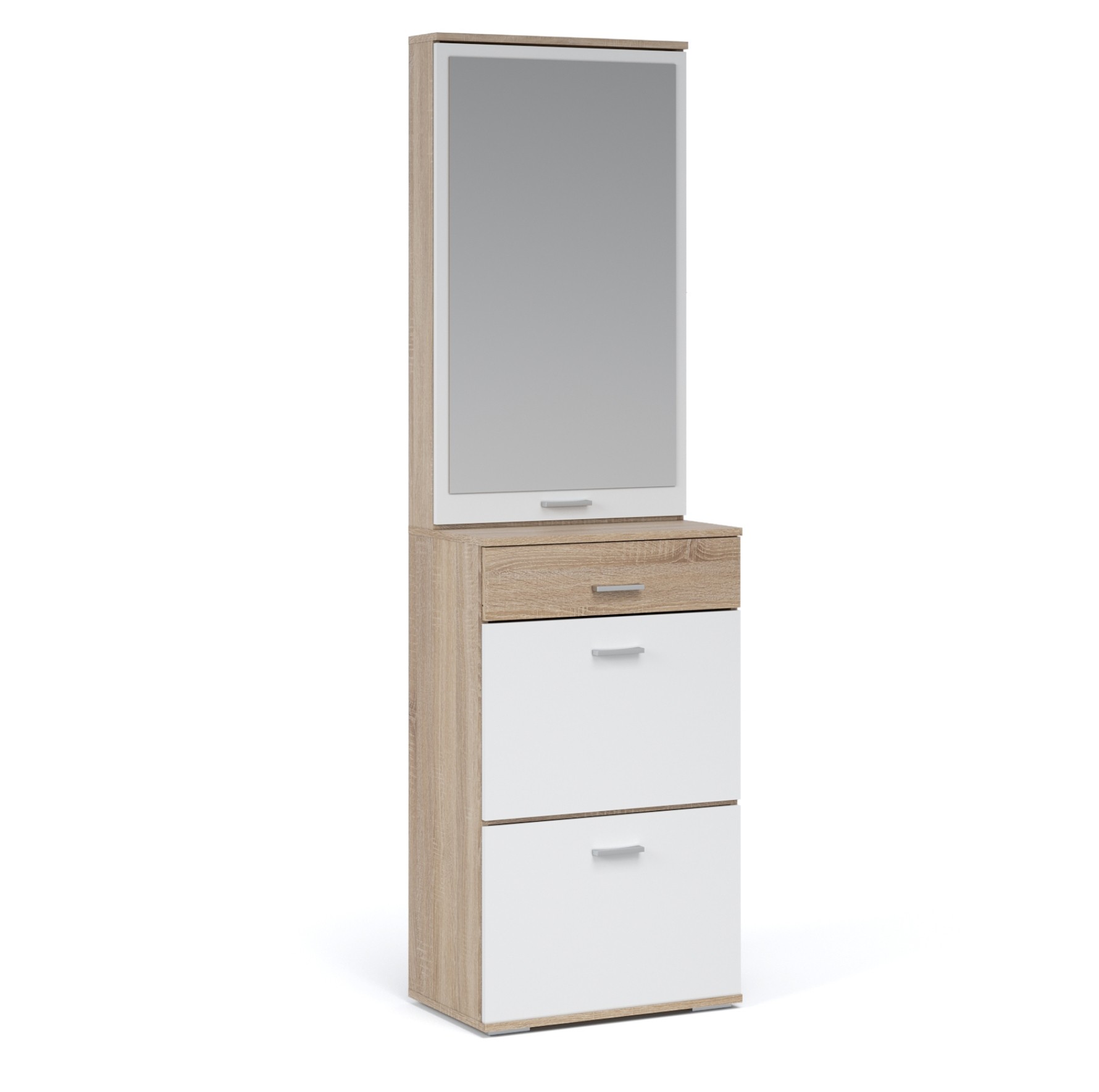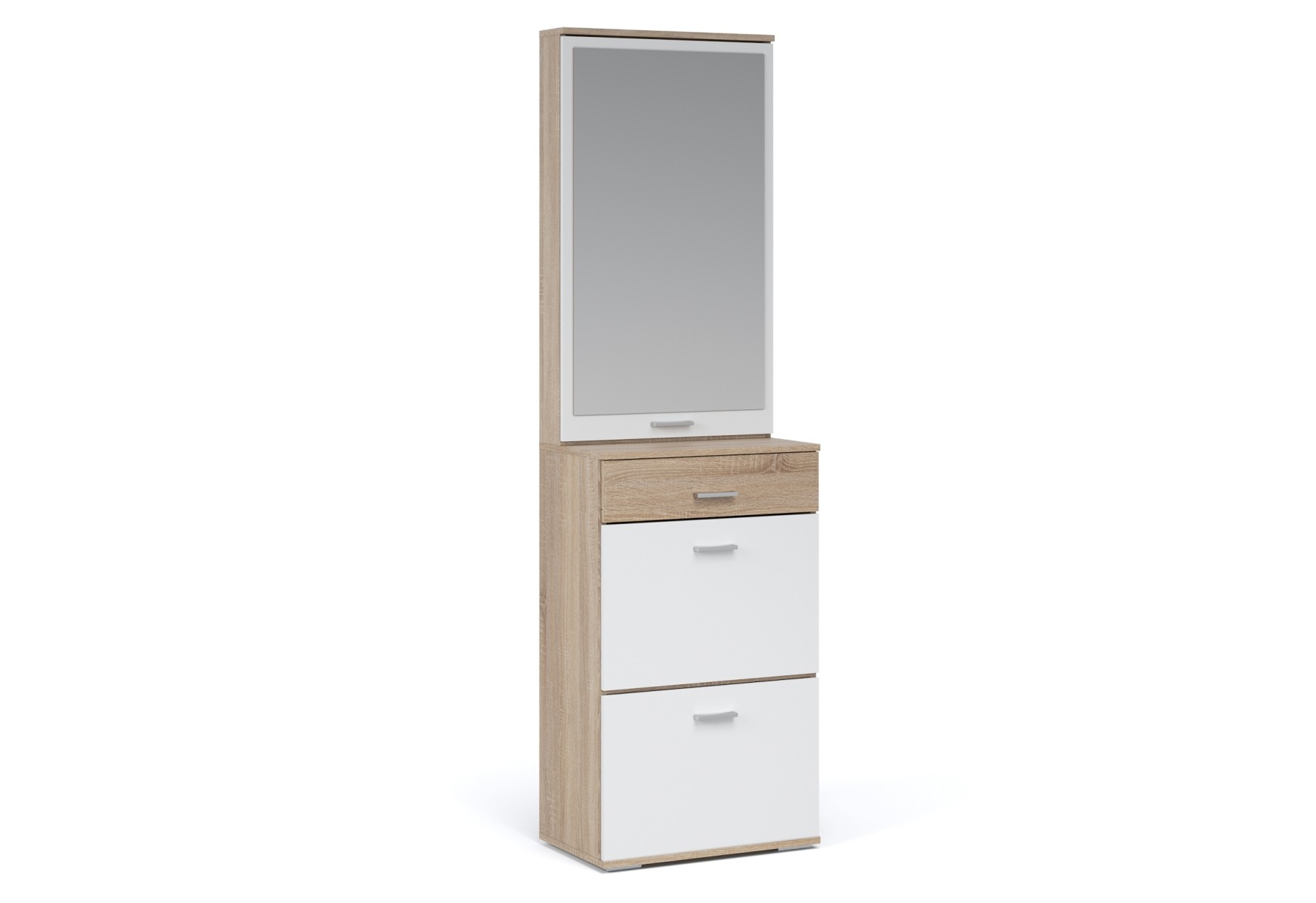 Функциональный модуль вмещает в себя зеркало-шкаф и обувницу с выдвижным ящиком на телескопических направляющих. Зеркало зрительно увеличивает пространство и количество отражённого света, полки за распашным фасадом поместят необходимые вещи – косметику, расчески. Компактная обувница удобна для хранения сезонной и домашней обуви, а выдвижной ящик для ключей или документов. Нейтральные цвета корпуса и фасадов всегда будут актуальны, создают особый комфорт и уют. Идеально компонуется со всеми модулями системы Виола.