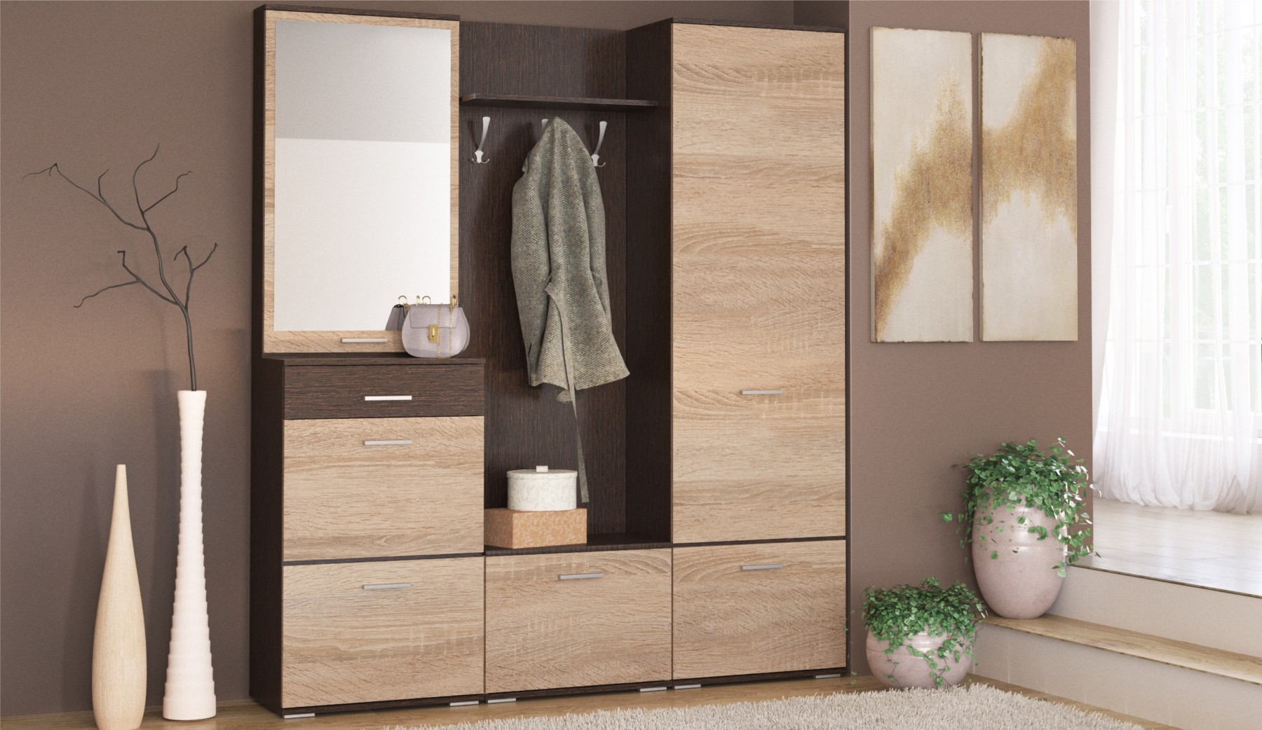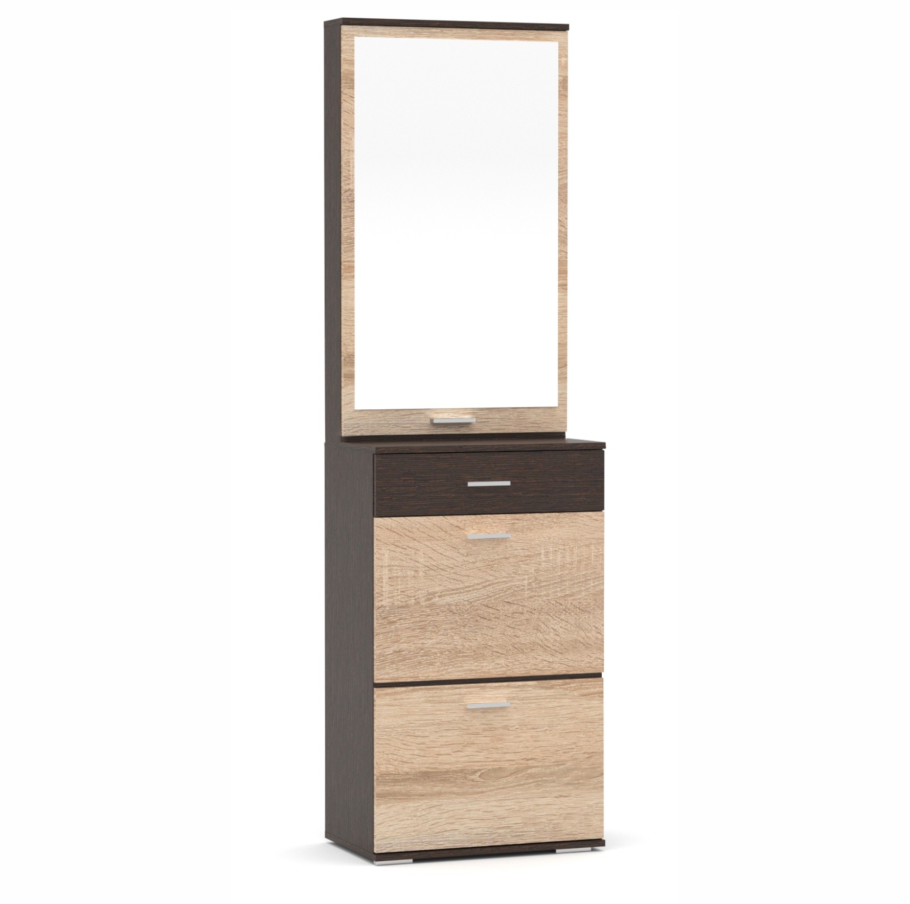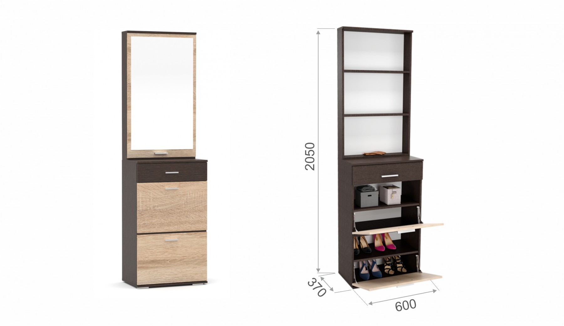 Функциональный модуль вмещает в себя зеркало-шкаф и обувницу с выдвижным ящиком на телескопических направляющих. Зеркало зрительно увеличивает пространство и количество отражённого света, полки за распашным фасадом поместят необходимые вещи – косметику, расчески. Компактная обувница удобна для хранения сезонной и домашней обуви, а выдвижной ящик для ключей или документов. Нейтральные цвета корпуса и фасадов всегда будут актуальны, создают особый комфорт и уют. Идеально компонуется со всеми модулями системы Виола.