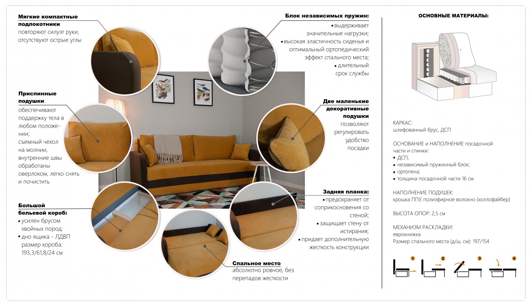 • В основании дивана — полноценный ортопедический матрас с независимым пружинным блоком, что делает его отличным выбором для ежедневного сна