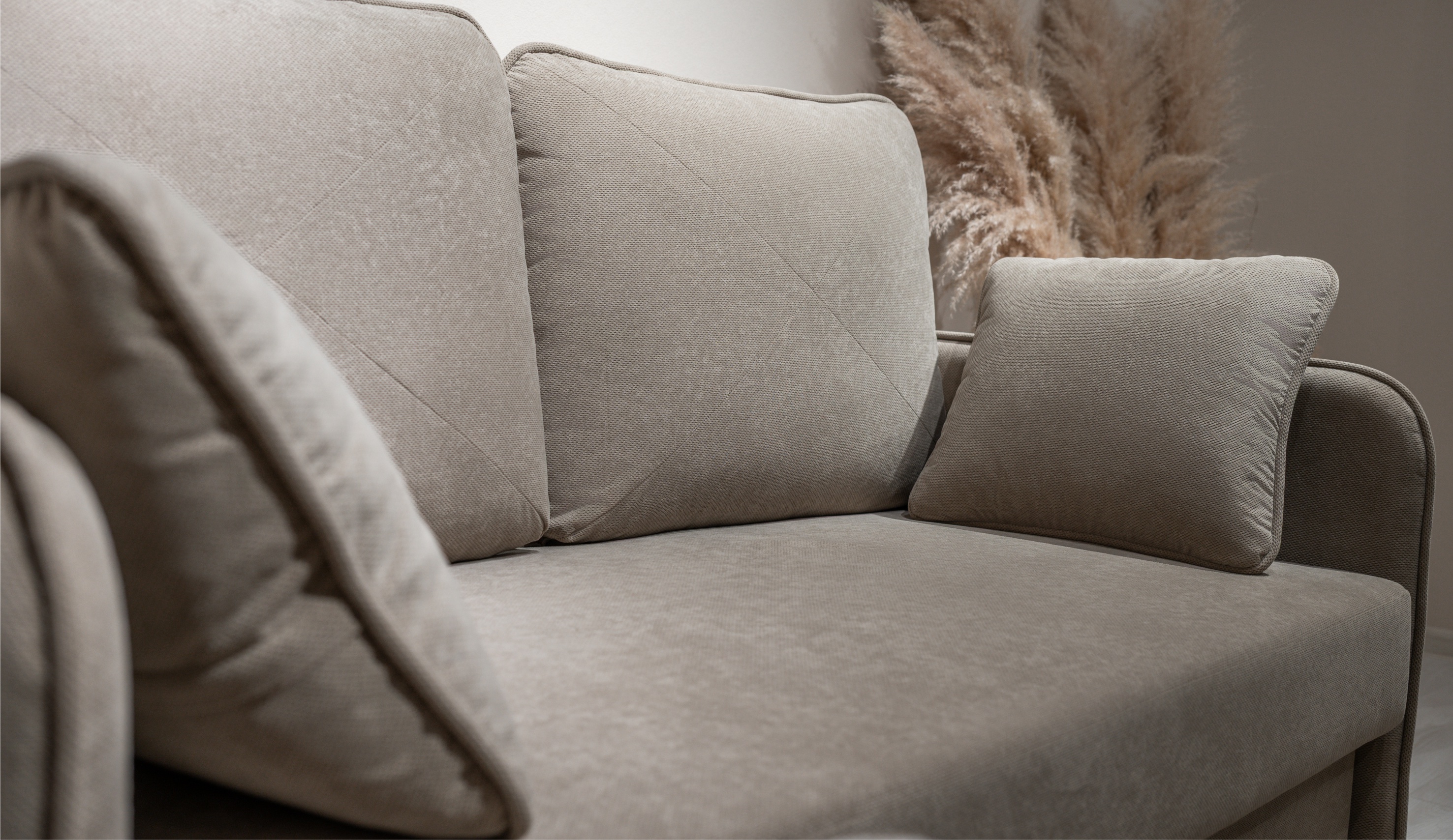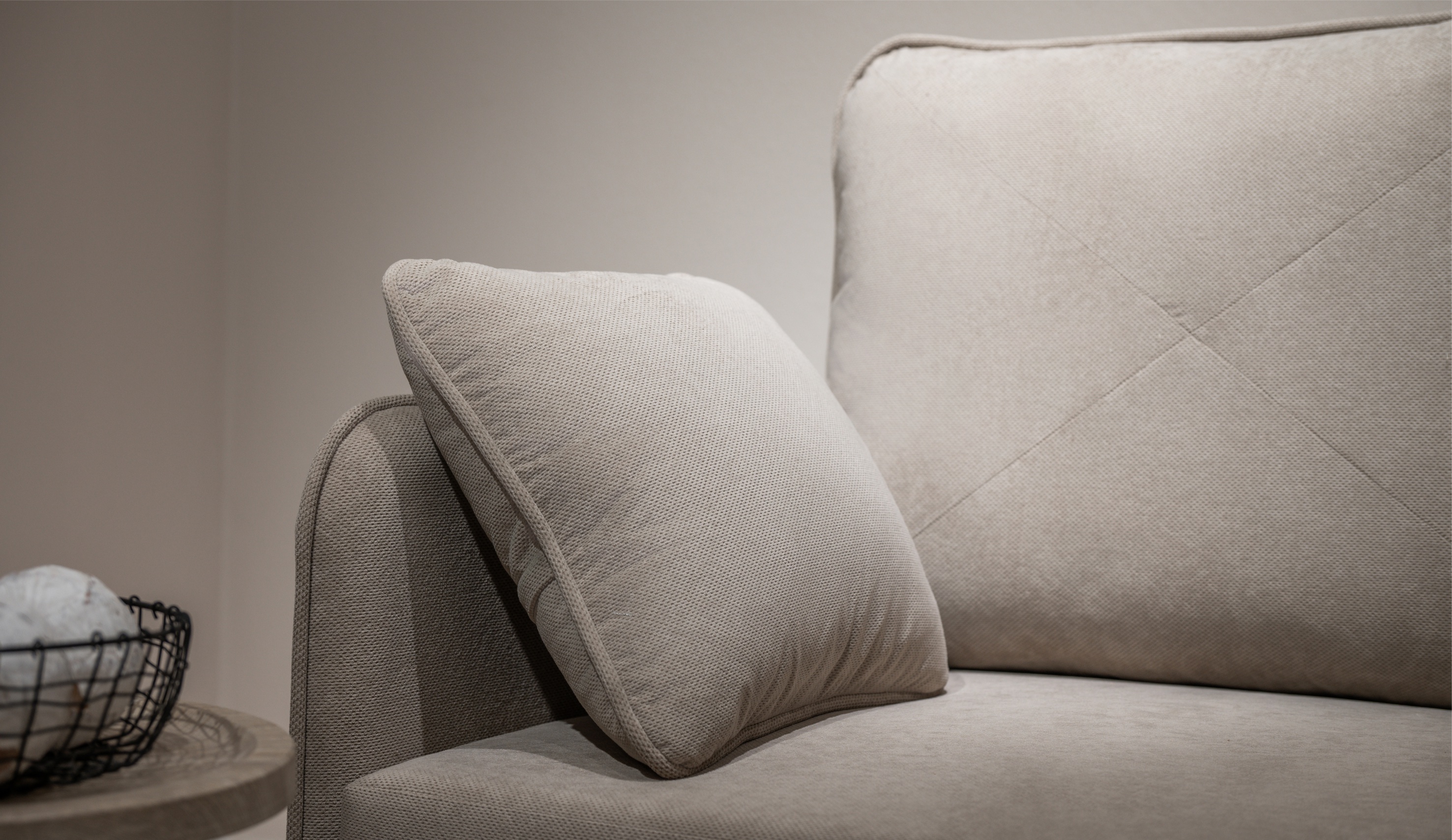 • Фактурная обивка с выраженной структурой придаёт дивану стильный и объёмный внешний вид, подчёркивая его современный характер