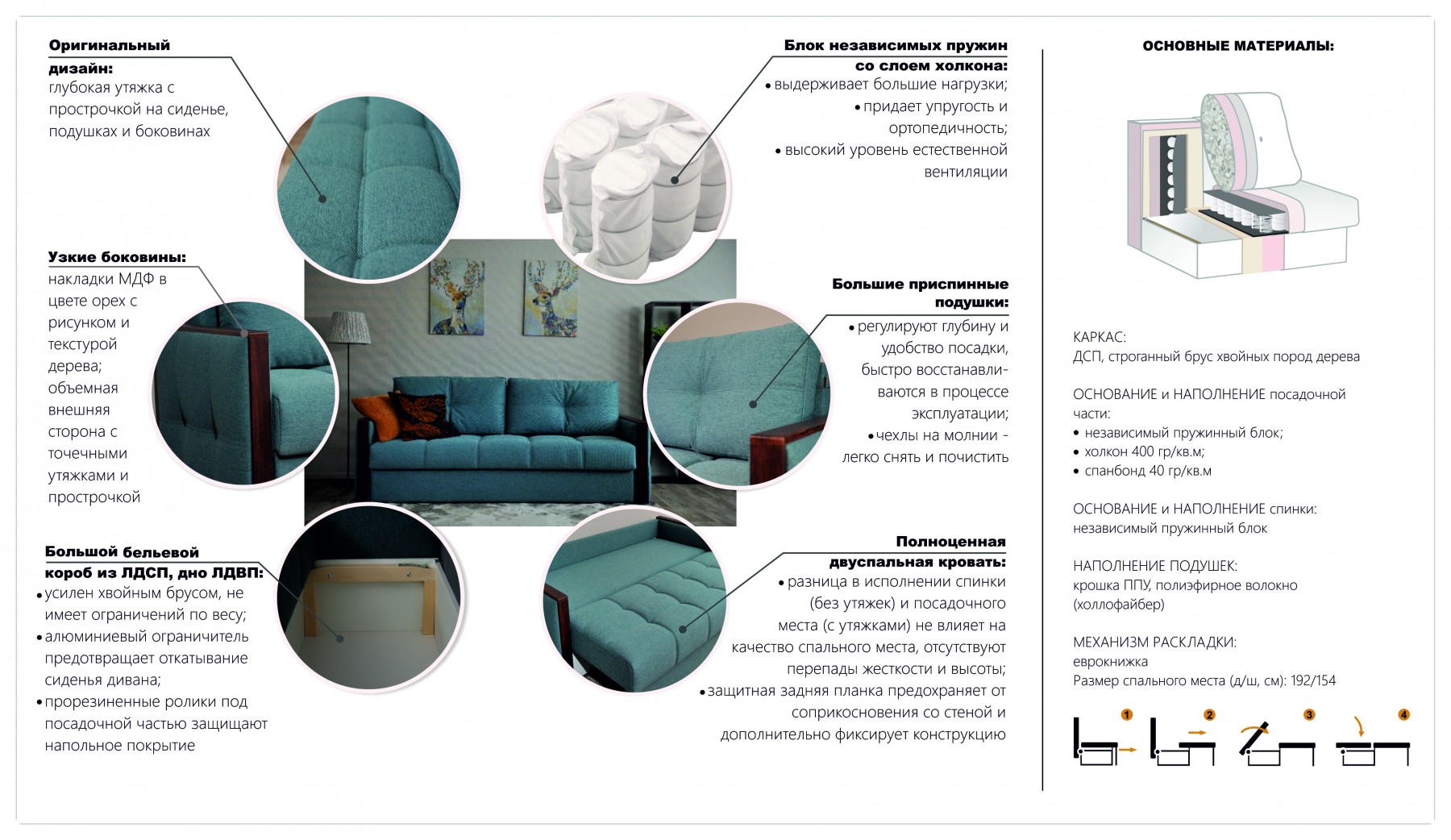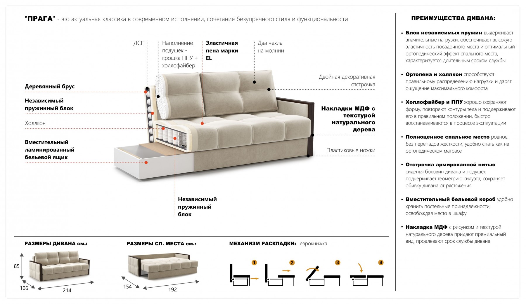 Стильный и современный диван "Прага" с декоративными элементами МДФ гармонично сочетает в себе эстетику и практичность. Благодаря узким подлокотникам он подходит для небольших комнат, сохраняя при этом полноценный функционал комфортного дивана и двухспальной кровати с матрасом на независимом пружинном блоке. Задняя планка дивана обеспечивает его устойчивость и защищает стену от истирания, а также защищает от контакта с холодной стеной во время сна.