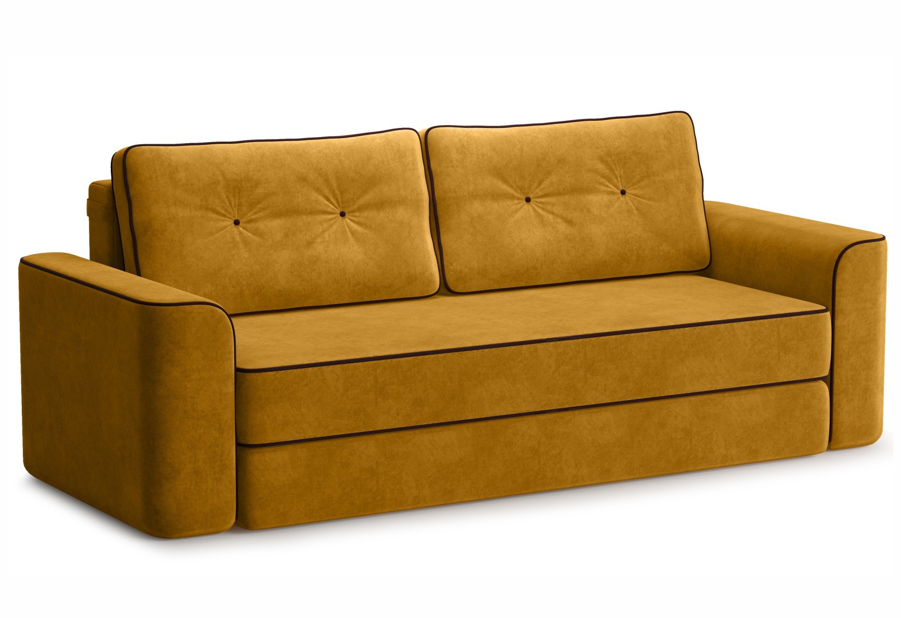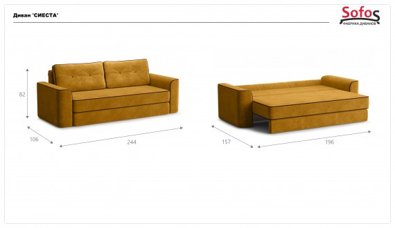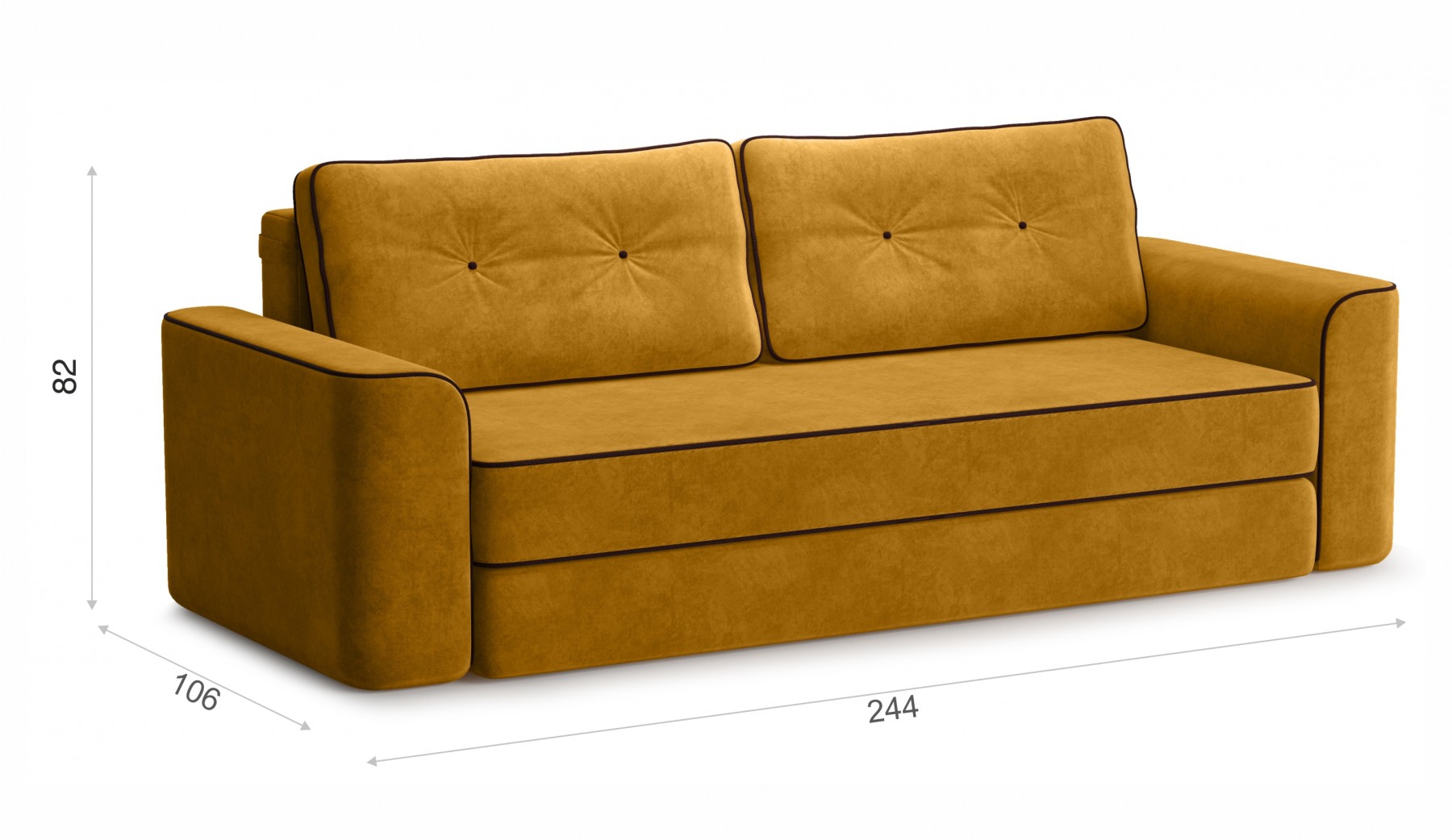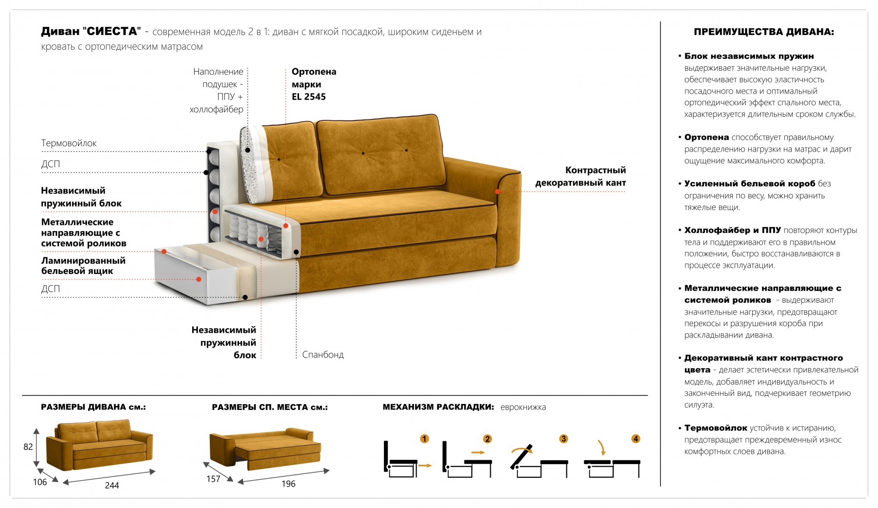 Сиеста" - это диван, который гармонично сочетает классическую элегантность с современным комфортом. Изысканные декоративные пуговицы на подушках и контрастный кант подчеркивают его утонченный стиль. Широкое посадочное место, мягкие приспинные подушки и бархатистая обивка, создают комфортное и уютное место для отдыха. Функциональность дивана дополняется его способностью легко трансформироваться в просторную двуспальную кровать с помощью механизма раскладки "еврокнижка", в то время как ортопедический матрас обеспечивает здоровый и крепкий сон.