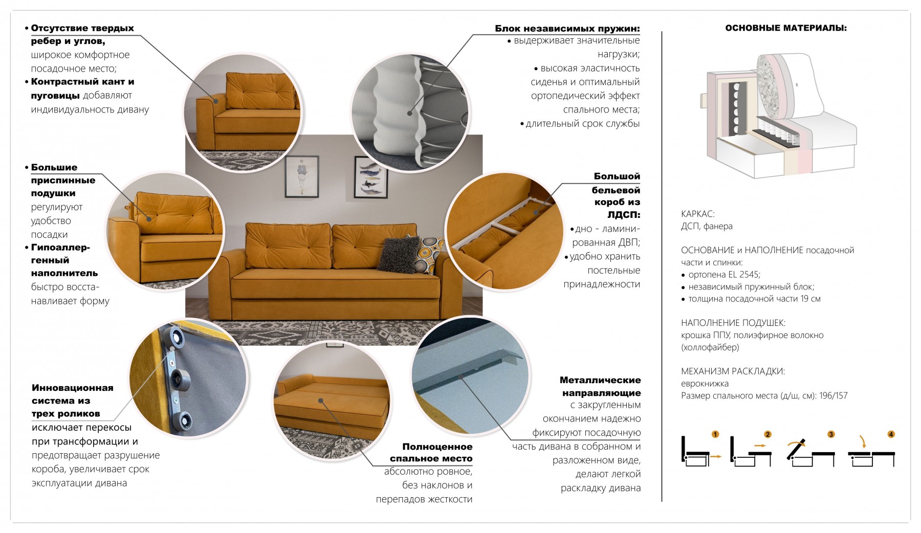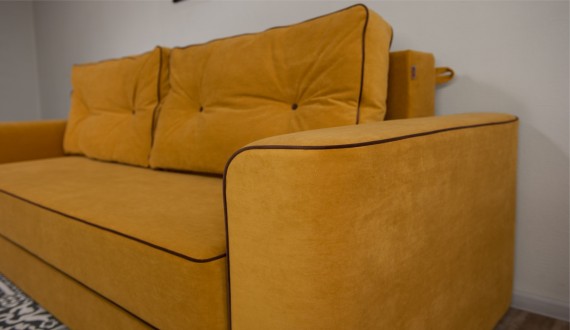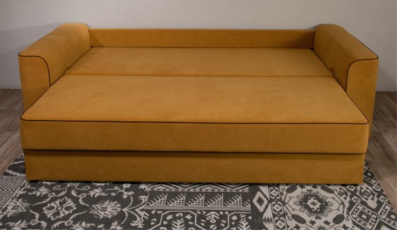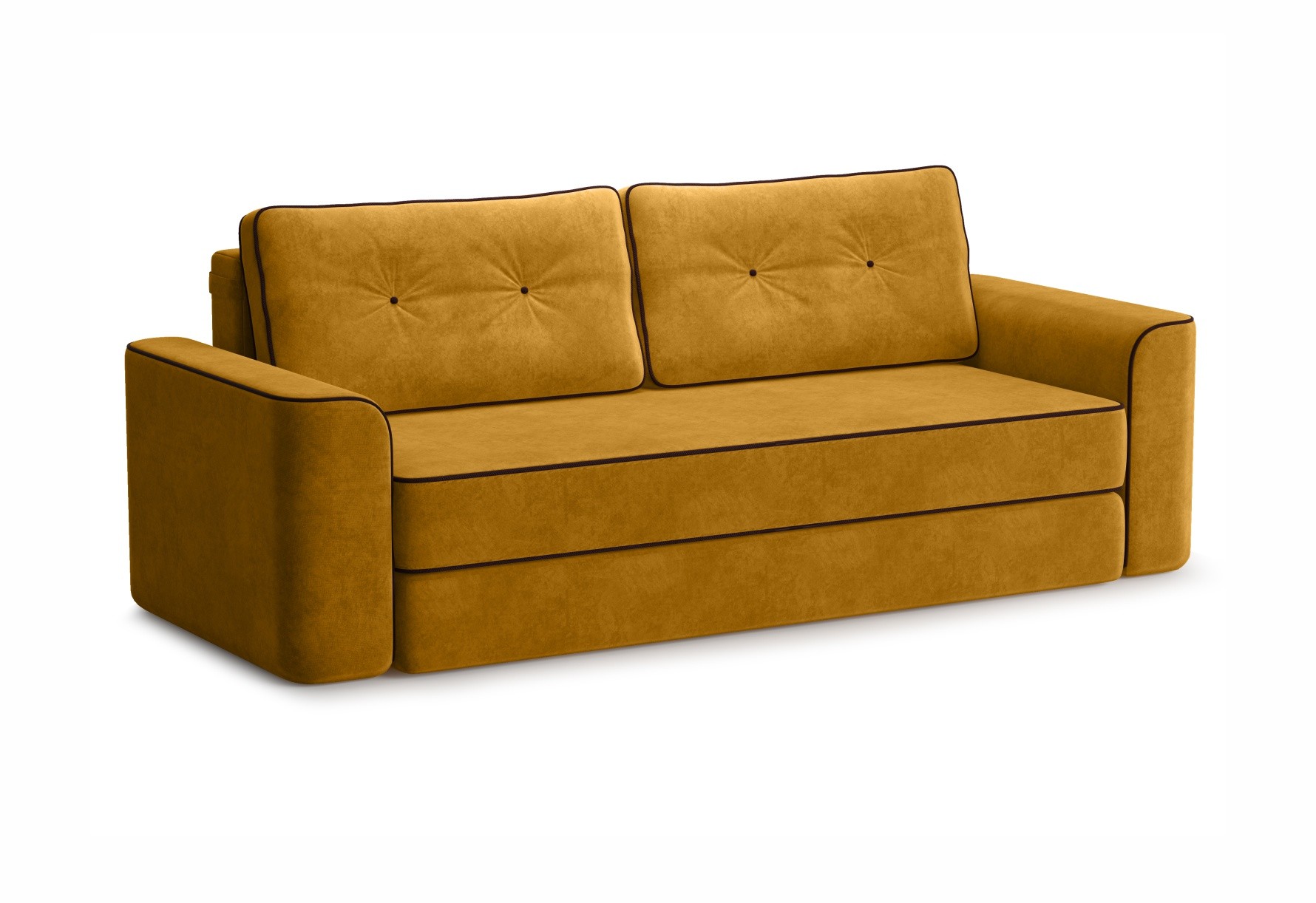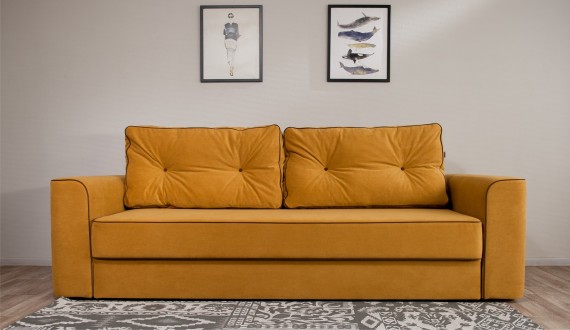 Сиеста" - это диван, который гармонично сочетает классическую элегантность с современным комфортом. Изысканные декоративные пуговицы на подушках и контрастный кант подчеркивают его утонченный стиль. Широкое посадочное место, мягкие приспинные подушки и бархатистая обивка, создают комфортное и уютное место для отдыха. Функциональность дивана дополняется его способностью легко трансформироваться в просторную двуспальную кровать с помощью механизма раскладки "еврокнижка", в то время как ортопедический матрас обеспечивает здоровый и крепкий сон.