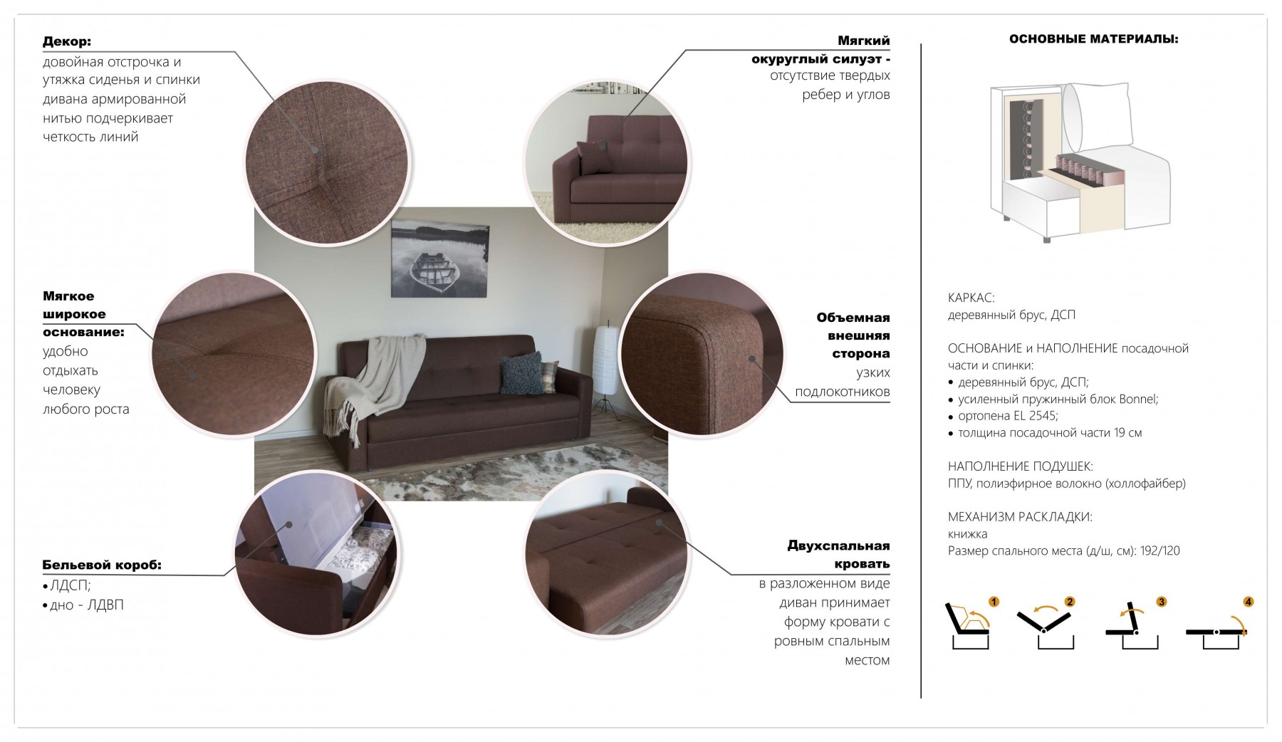 Диван "Твист" представляет собой компактную и удобную модель, подходящую для разных стилей интерьера. Он легко трансформируется в комфортное спальное место, делая его практичным выбором для дома или квартиры с ограниченным пространством. Бельевой короб предлагает дополнительное место для хранения вещей.