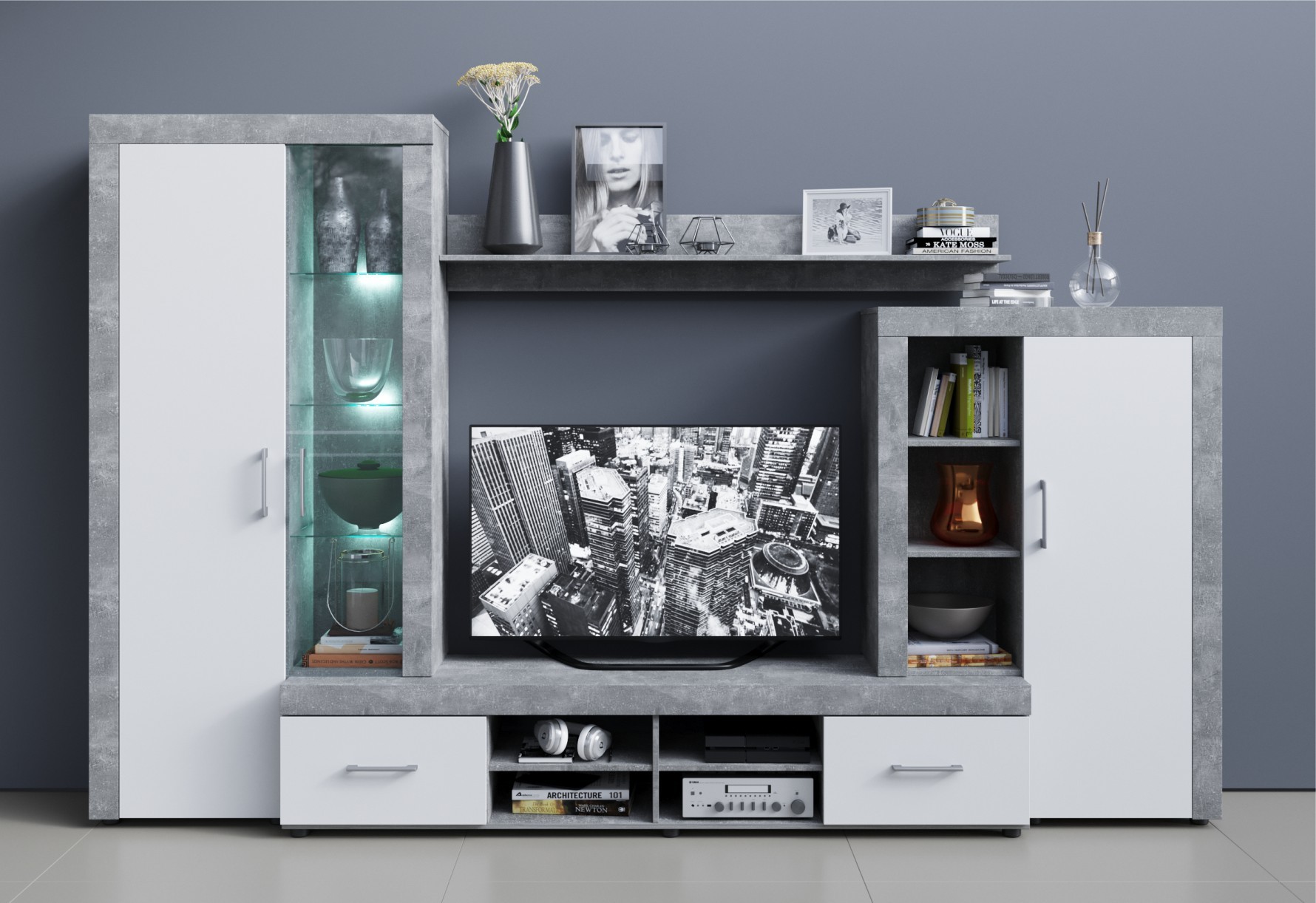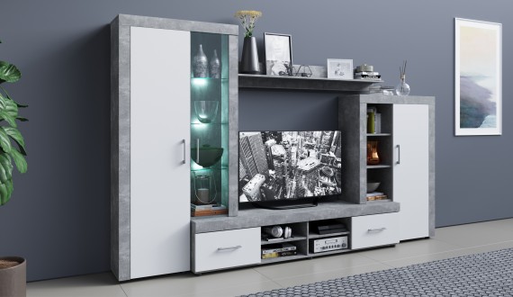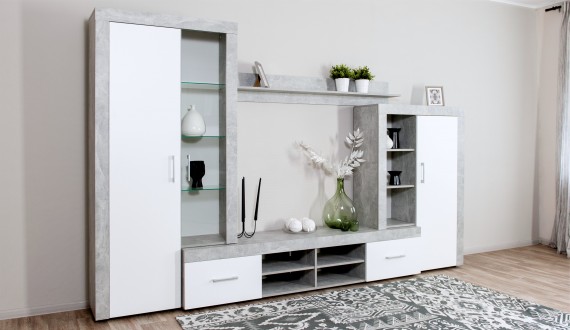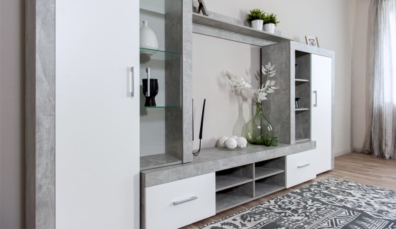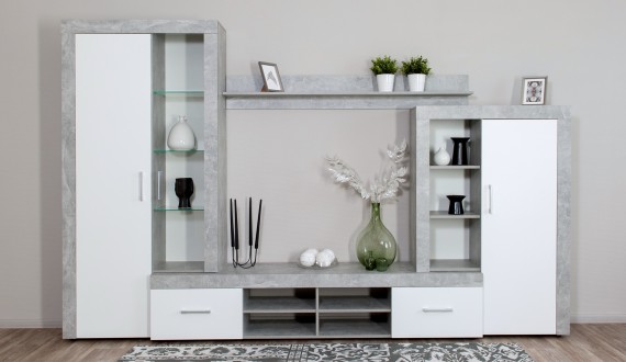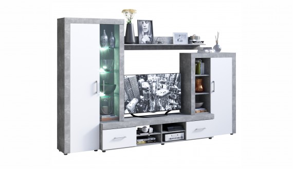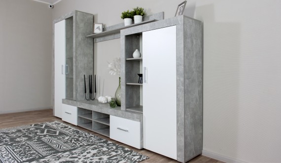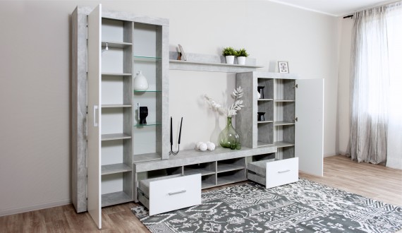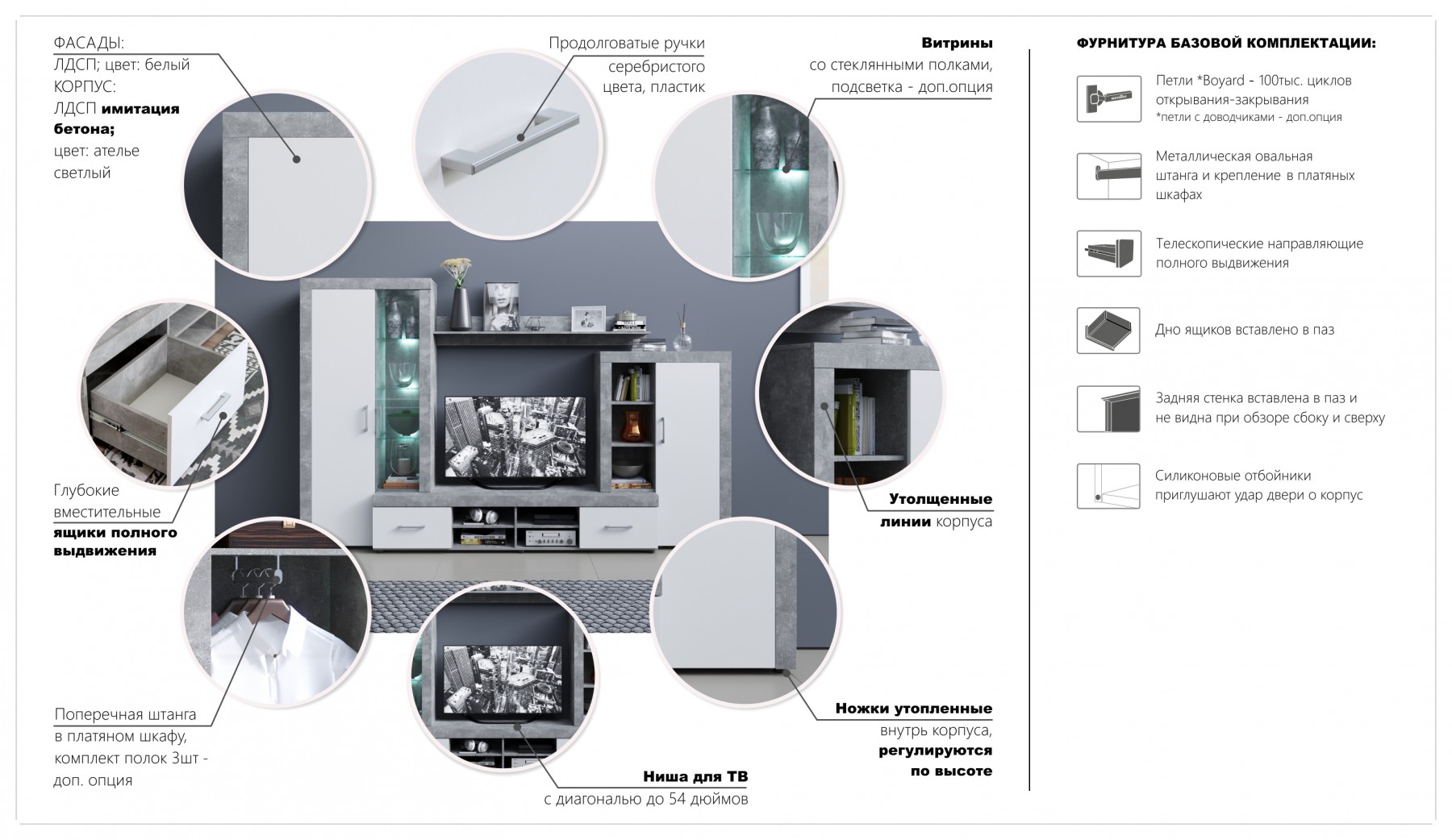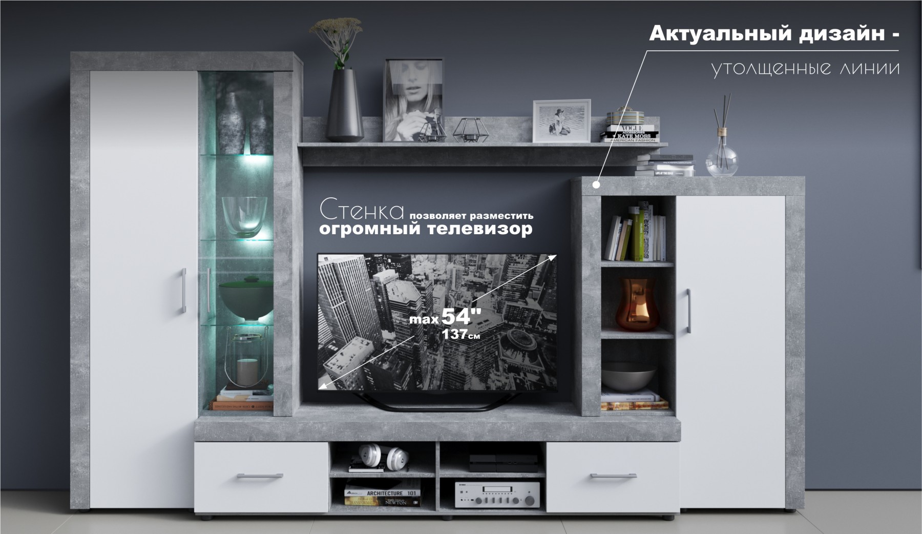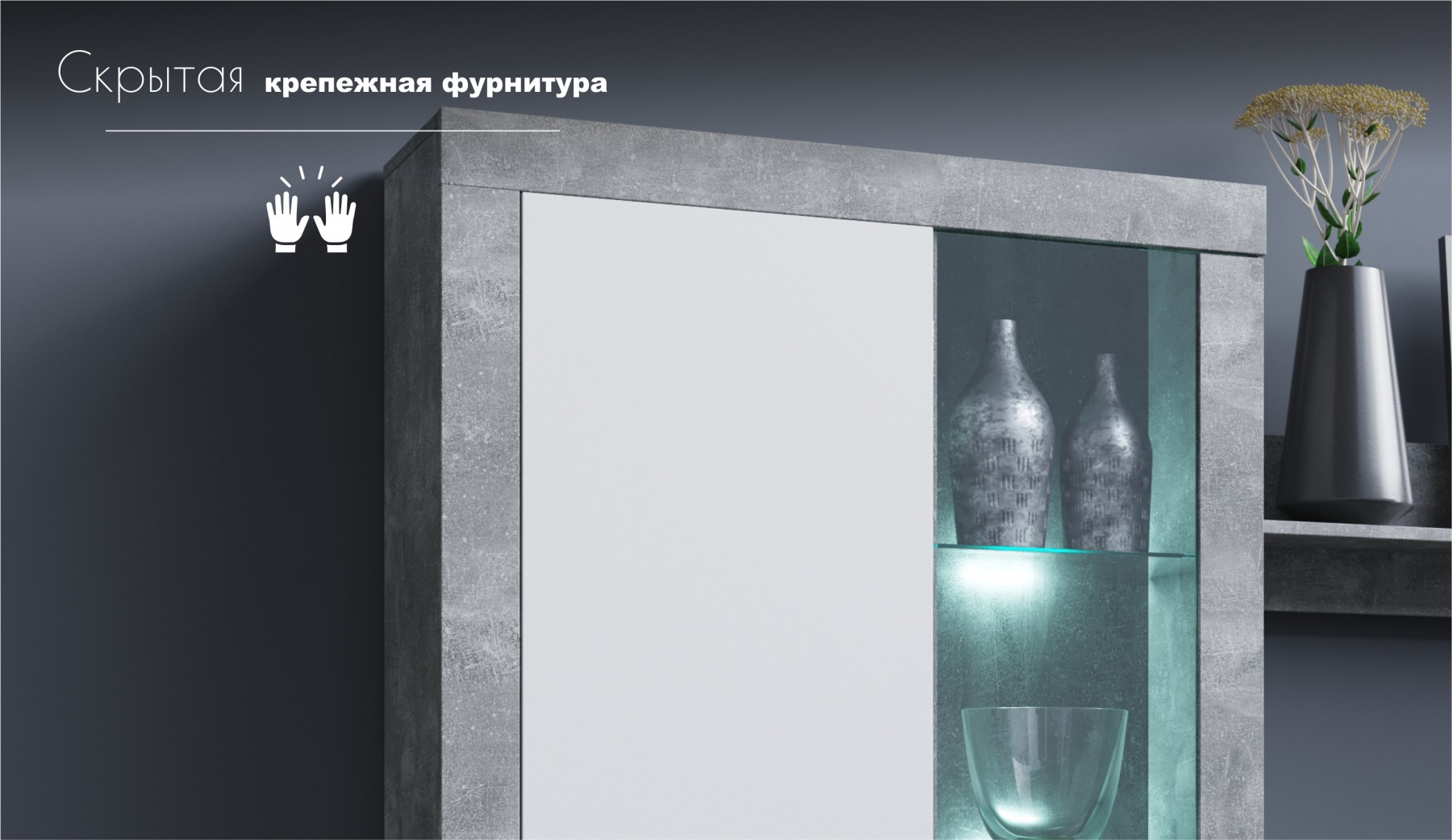 Компактная стенка Джерси подойдет даже для небольшой квартиры, сохраняя при этом стильный современный вид и функциональность. Модель выполнена в соответствии с последними тенденциями дизайна - природные цвета декоров дерева и бетона. Утолщенные линии корпуса придают изделию дополнительную массивность и выразительность. Внутреннее пространство стенки включает в себя вместительные полки, где легко разместятся техника, книги и другие предметы. Стеклянные витрины с подсветкой станут местом для хранения сервизов и декора. Использование экологически чистых материалов гарантирует безопасность и долговечность покупки.