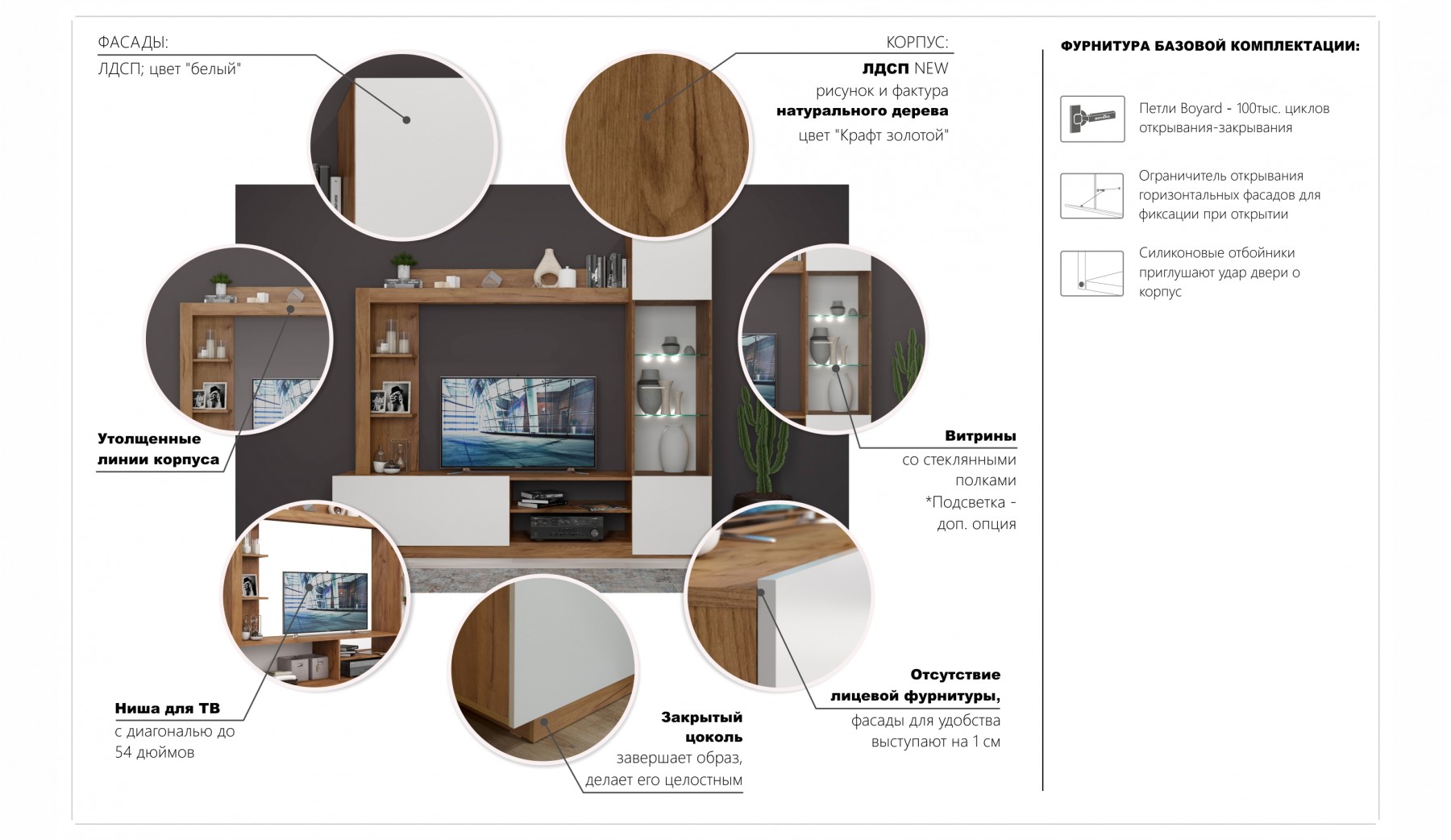 Компактная стенка Флекс сочетает в себе лучшие черты современного стиля. Изготовленная из ламинированной плиты в благородном цвете крафт золото от австрийского бренда Кроношпан, она демонстрирует искусную имитацию рисунка и структуры натуральной древесины. Утолщенные линии корпуса, витрина и невидимая крепежная система придают изделию легкость и воздушность, а выступающие фасады позволяют обходиться без ручек. Модель прекрасно комбинируется с различными предметами интерьера, создавая интересные миксы: добавьте несколько деталей белого или теплого древесного оттенка, чтобы подчеркнуть индивидуальность пространства. Экологичные материалы обеспечивают высокое качество и безопасность изделия.