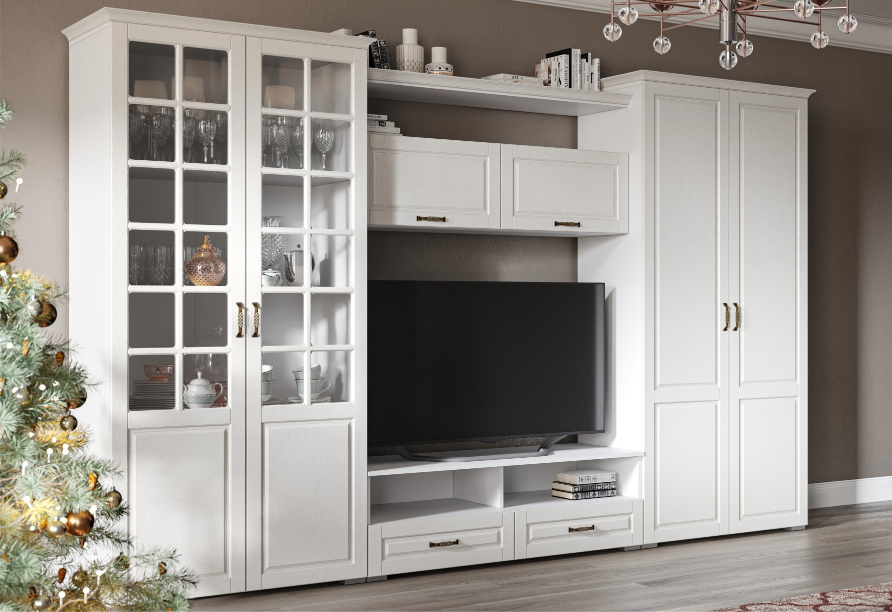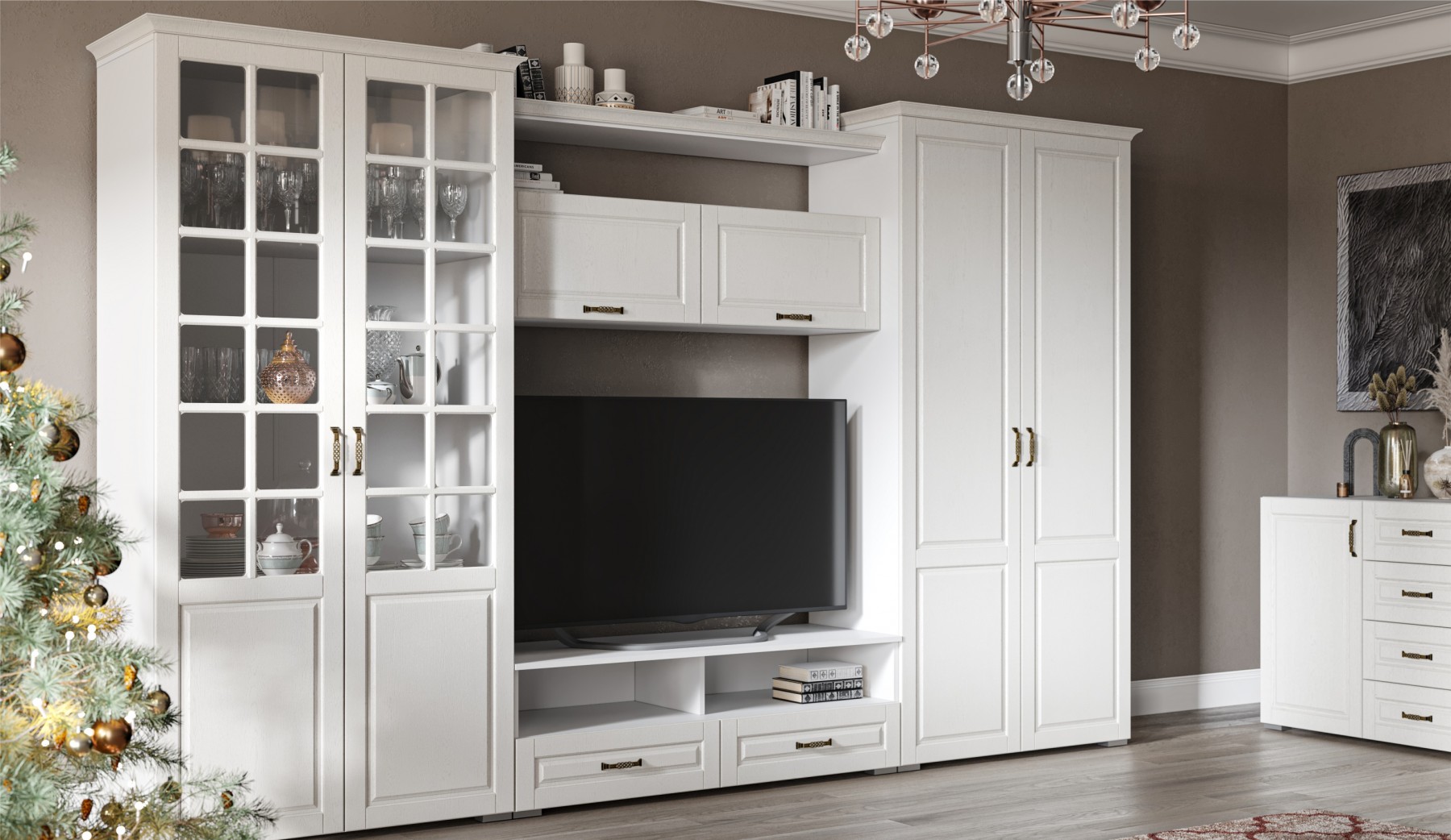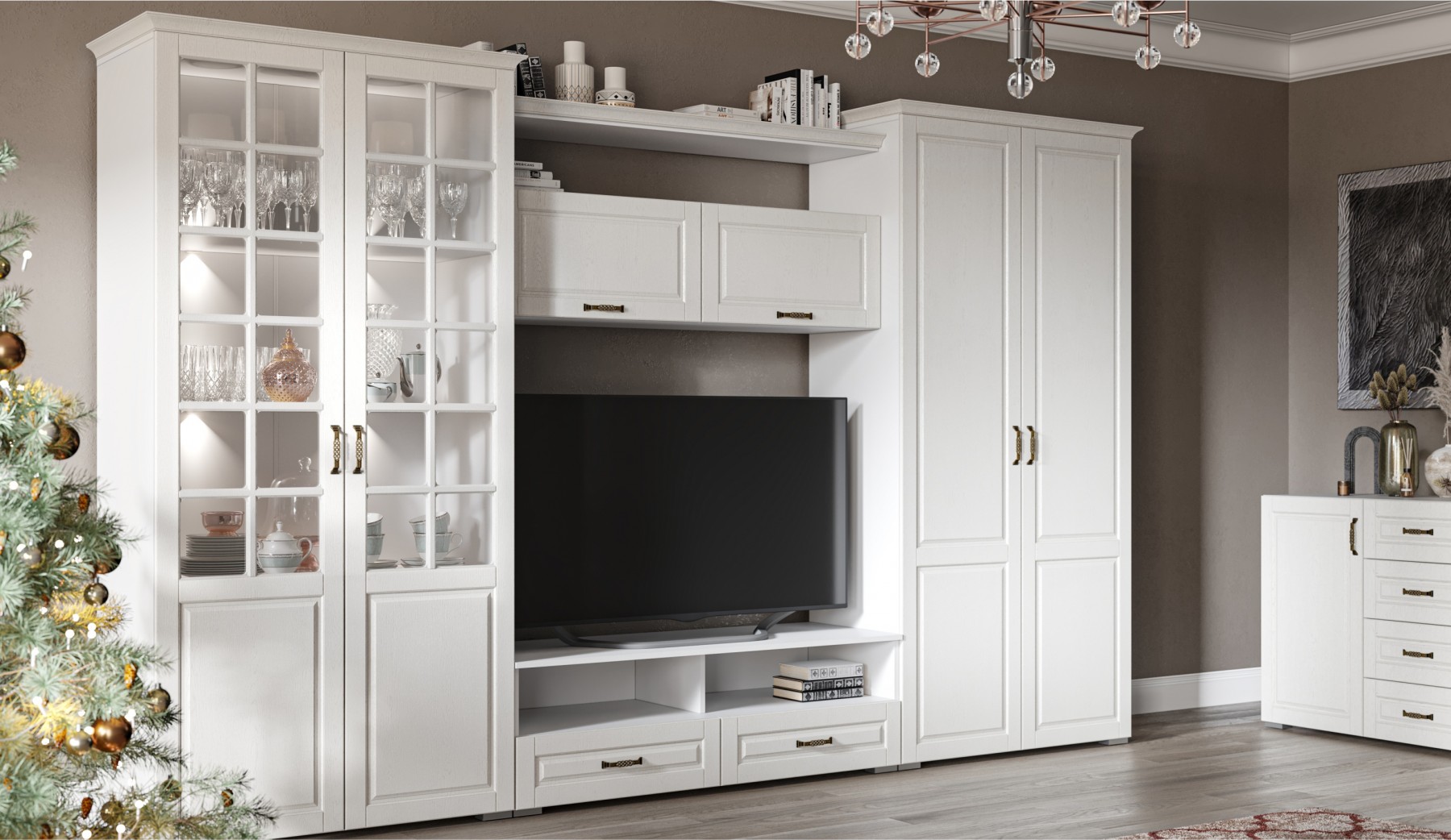 Изысканная стенка Лацио, выполненная в стиле неоклассики, является идеальным выбором для тех, кто ценит эстетику и функциональность. Элегантные фасады из МДФ, имитирующие текстуру натурального дерева, придают дизайну теплоту и уникальность, а белоснежный цвет декора визуально расширяет пространство, создавая ощущение легкости и свежести. Ручки и фигурный карниз, дополняют образ, делая его гармоничным и цельным. Вариантивность модулей позволяет выбрать оптимальный вариант для вашего пространства.