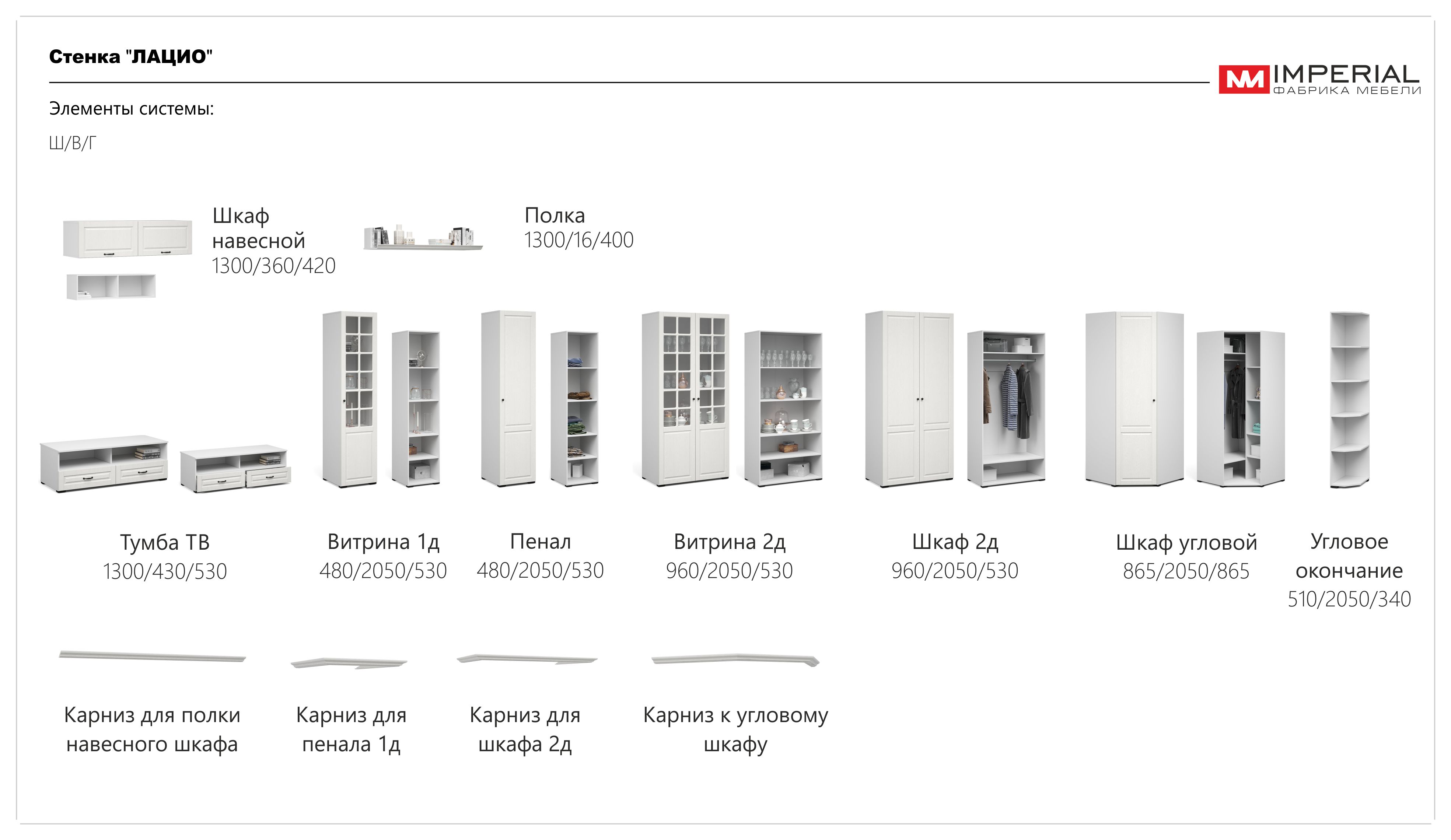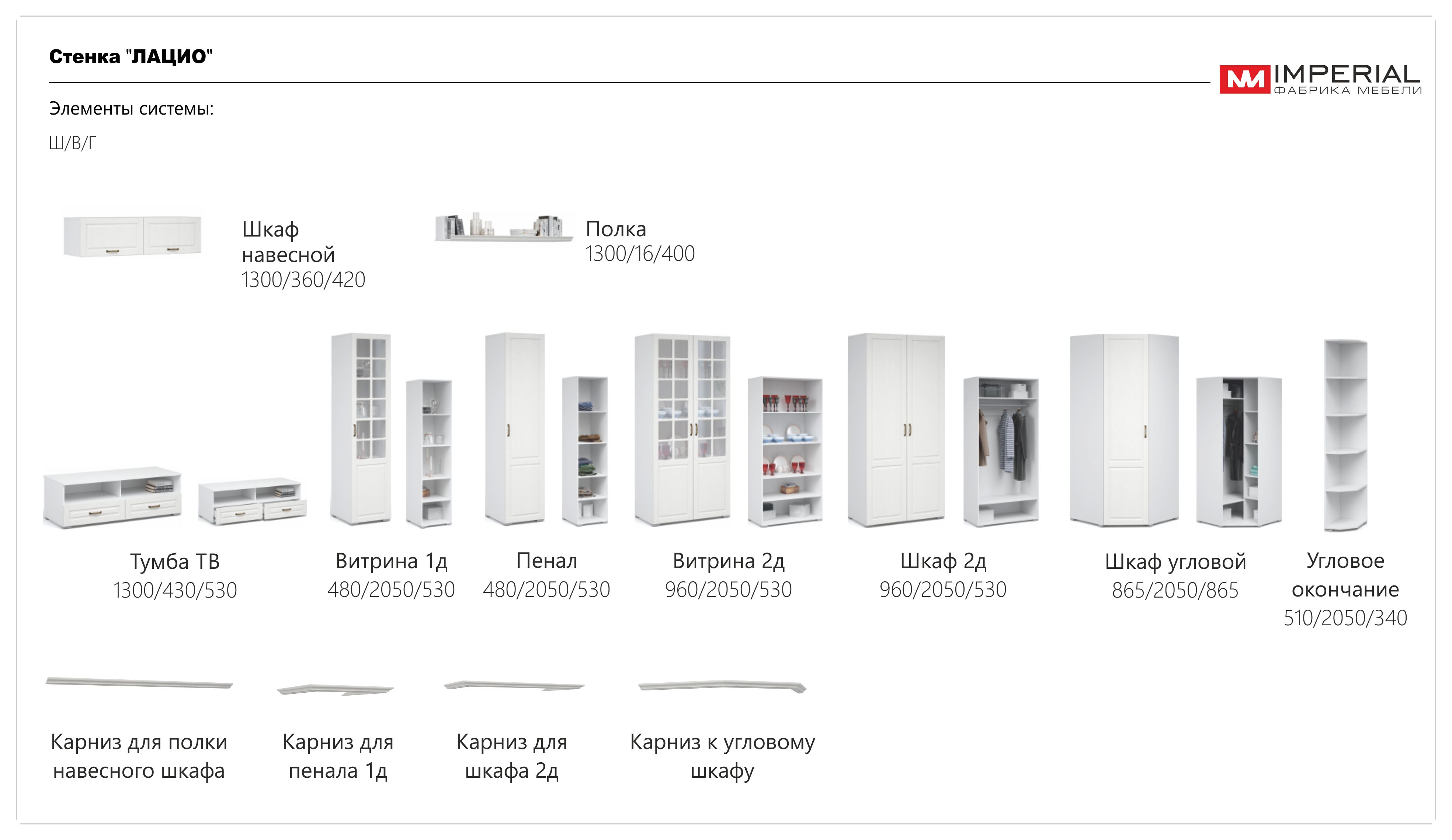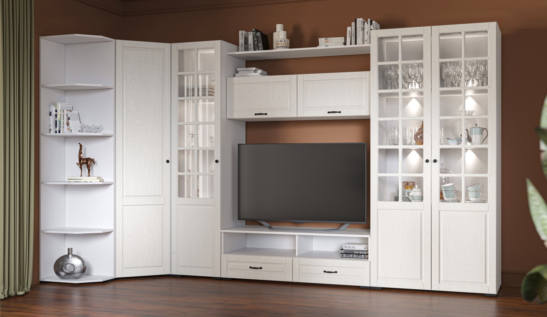 Функциональная стенка Лацио создана для тех, кто ценит комфорт, уют и эргономику. Сочетание белоснежного цвета и стеклянных фасадов визуально расширяет пространство, добавляет света и лёгкости. Декоративными элементами стенки служат фрезерованные фасады из МДФ с текстурой дерева и фигурный карниз. В шкафу с прозрачными витринами будет идеально смотреться красивая посуда. Тумба для ТВ с открытыми и закрытыми полками разместит приставки, медиа устройства. Система Лацио состоит из множества отдельных модулей, благодаря чему можно легко подобрать мебель для комнаты любого размера и нужного вам функционала.