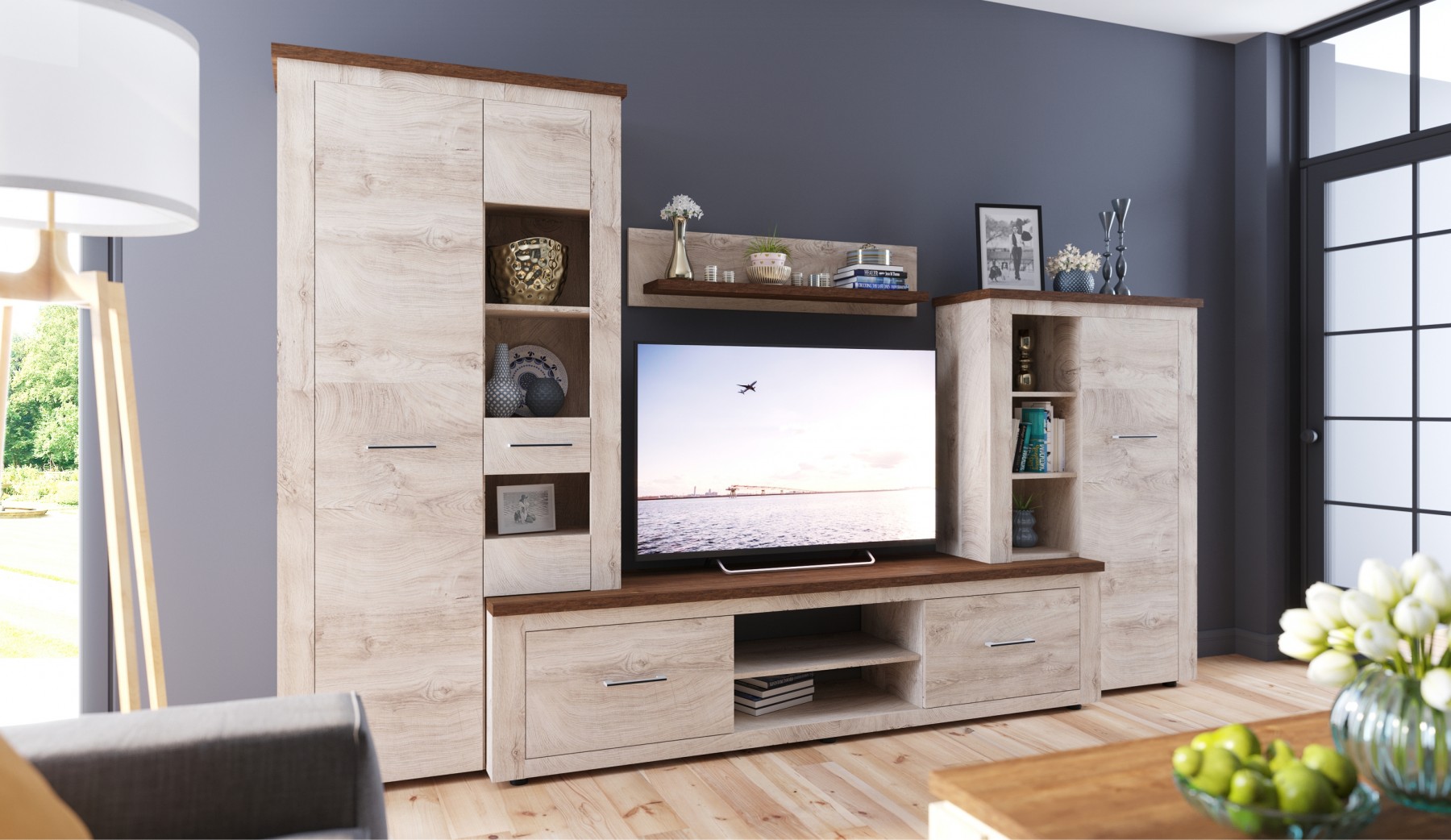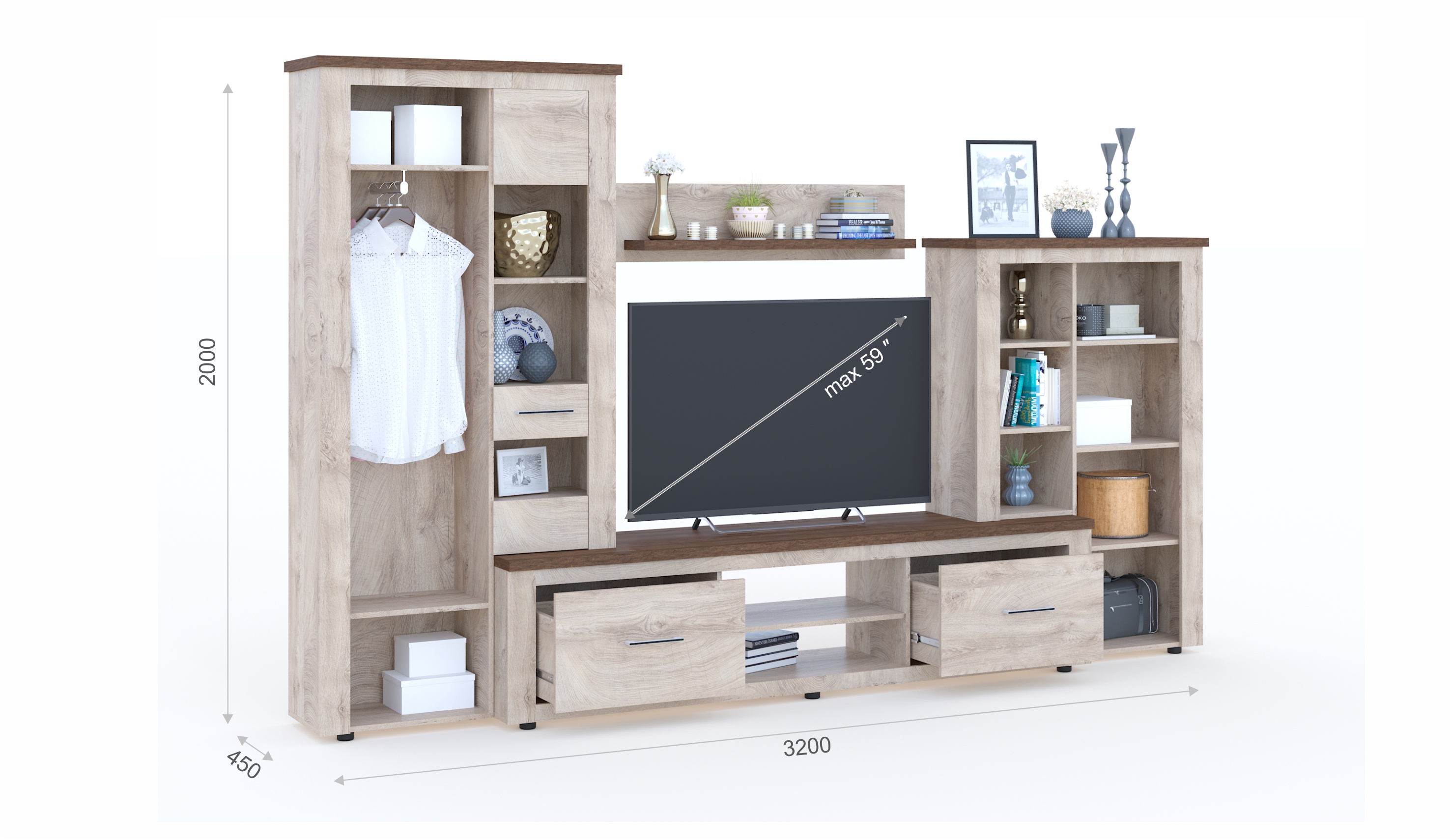 Стенка Медисон — это готовый комплект для гостиной. ЭКОшпон создает иллюзию настоящей древесины, делая интерьер более естественным. Верхние элементы — ТВ- панель, полка и ТОПы шкафов изготовлены из утолщенной плиты с плавными краями, что повышает безопасность и удобство эксплуатации. Модель оснащена закрытыми и открытыми полками, металлической штангой для одежды, а также витринами для книг и аксессуаров. Глубокие ящики с полным выдвижением делают доступ к вещам простым и удобным. Мебель производится из экологически безопасных материалов.