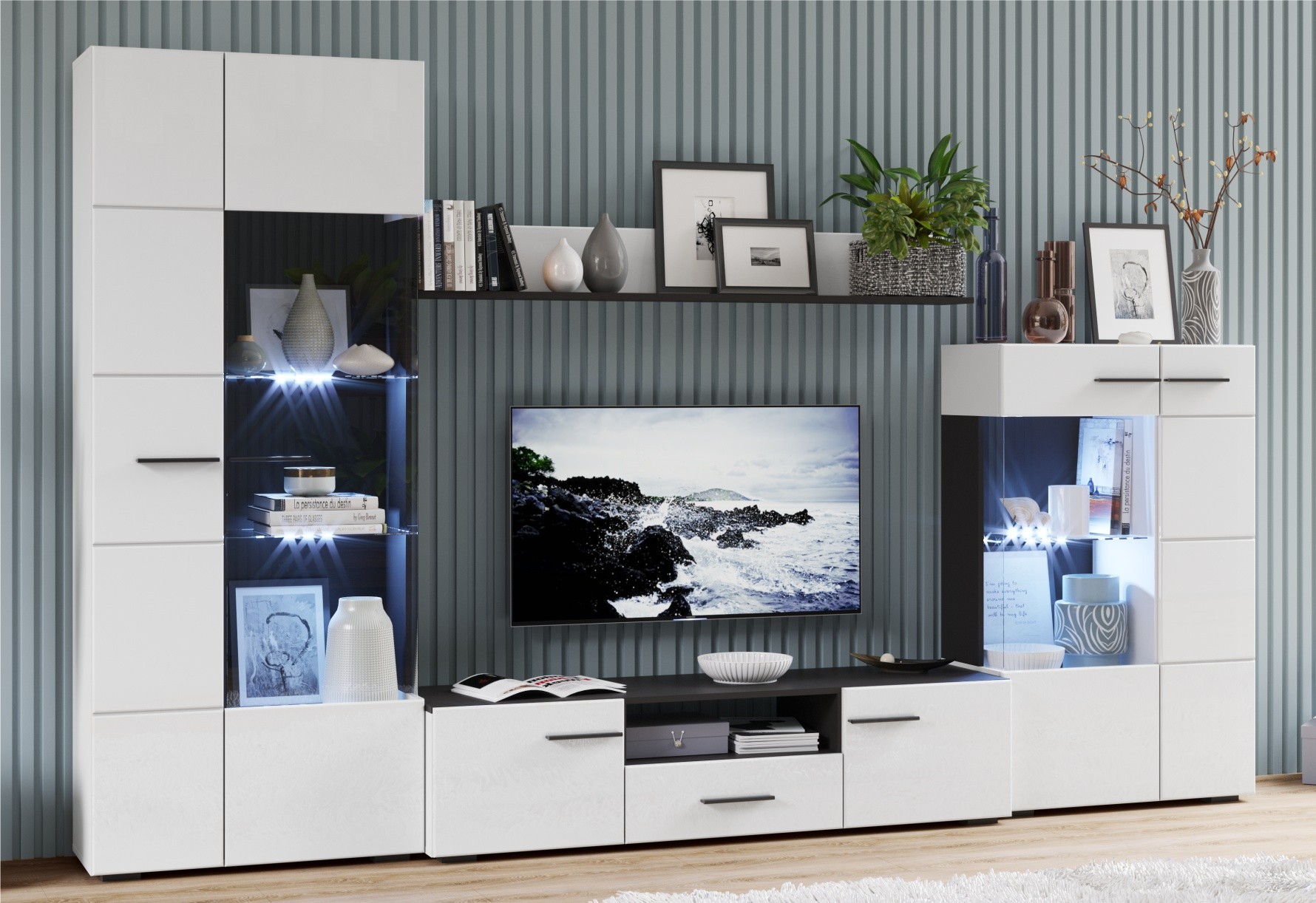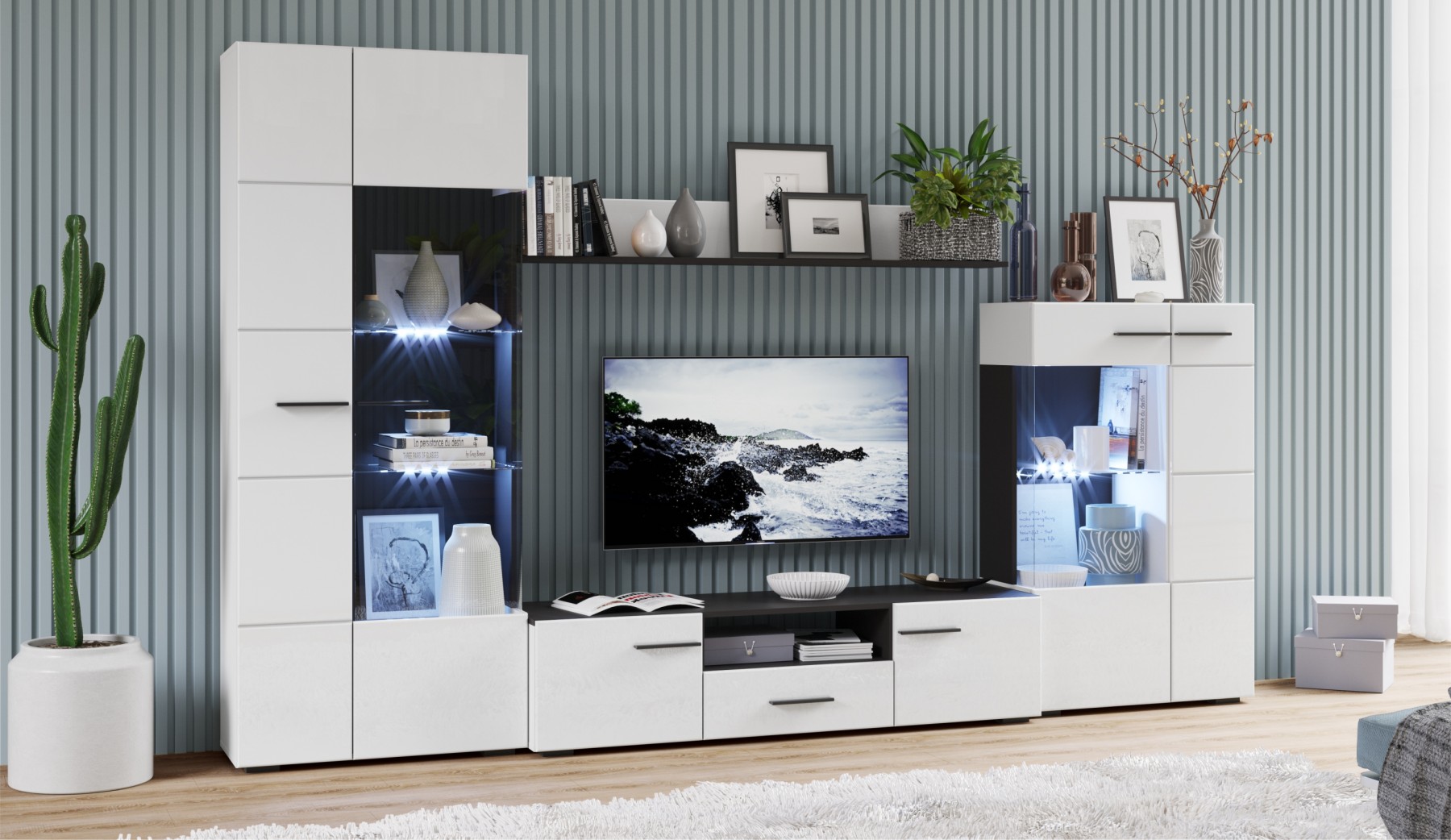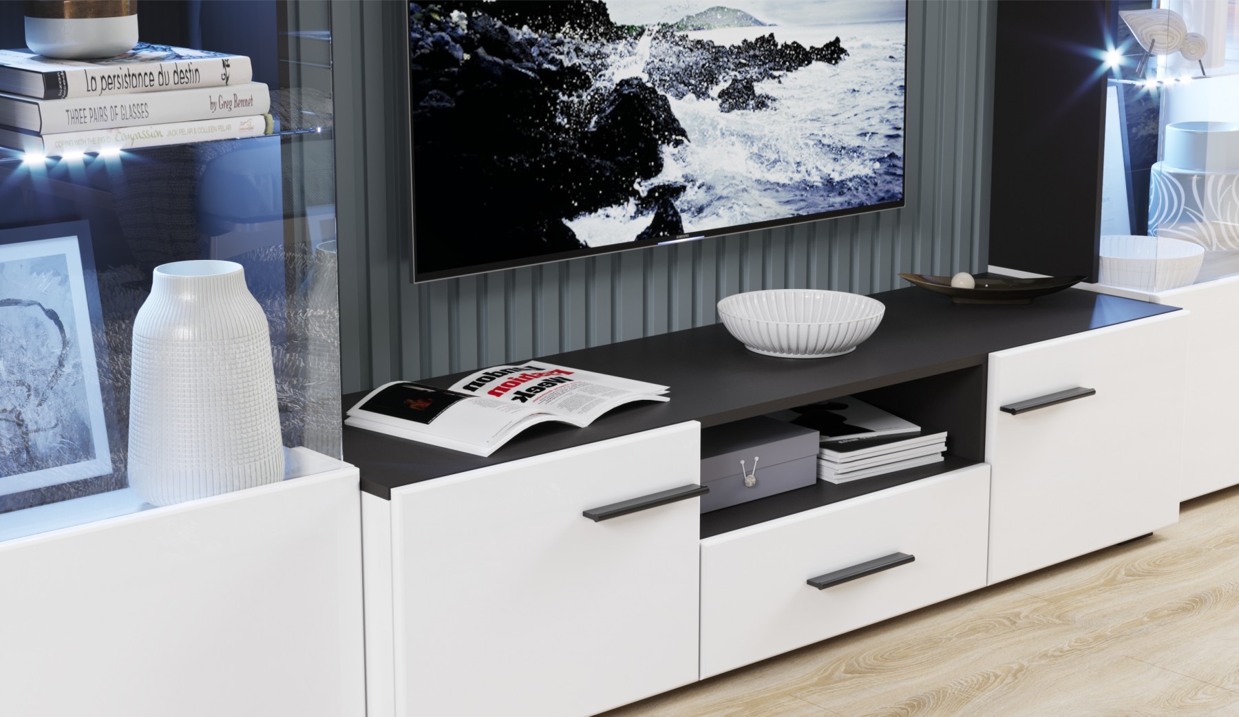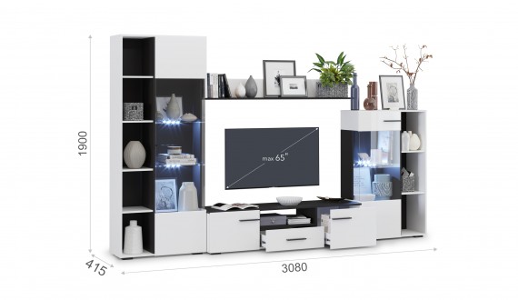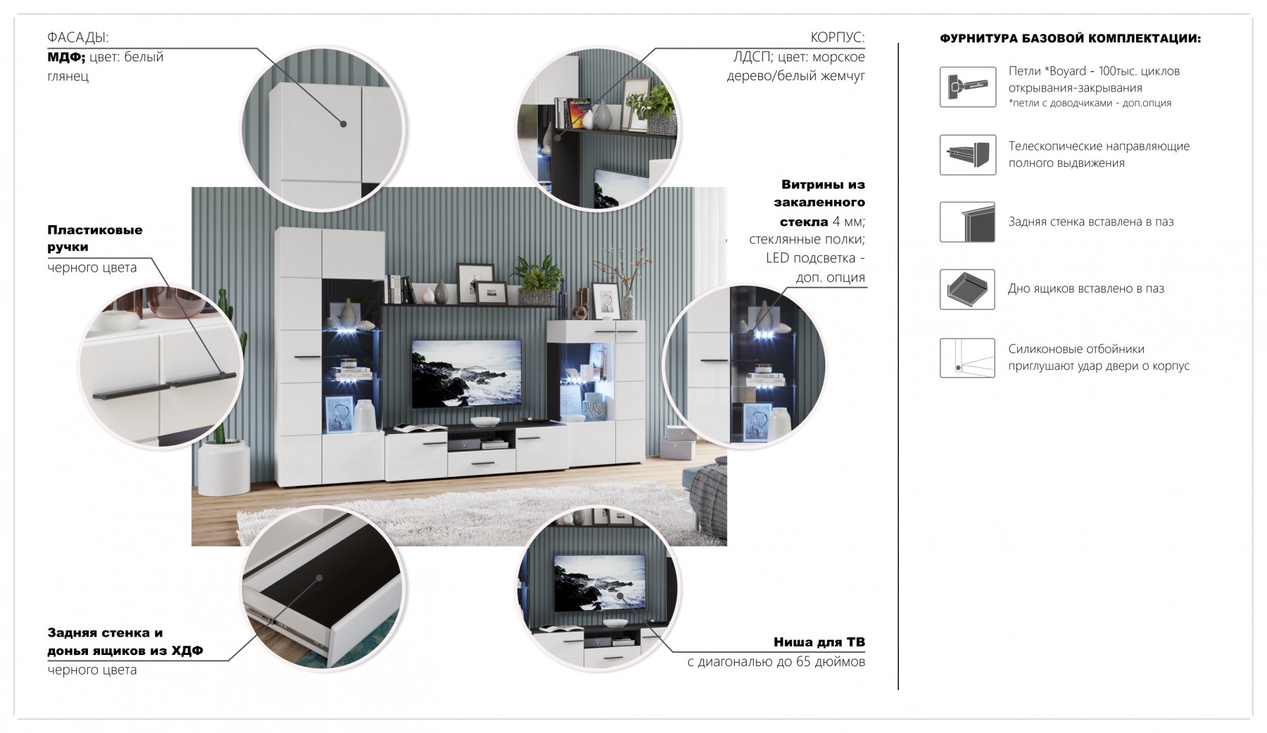 Стенка "Невада" - это популярный набор мебели для оформления интерьера в стилях минимализма, лофта или сканди. Витрины оснащены центральным и боковым остеклением, а дополнительная подсветка эффектно выделяет красивую посуду или декоративные элементы, находящиеся внутри. В сочетании с глянцевым блеском фасадов, стенка визуально расширяет пространство, делая его светлее и просторнее. Черные контрастные ручки и задняя стенка гармонично сочетаются с комбинированным корпусом, подчеркивая строгие линии и создавая уютную обстановку для отдыха. Конструкция изготовлена из экологичных и прочных материалов, долговечных и безопасных в использовании.
