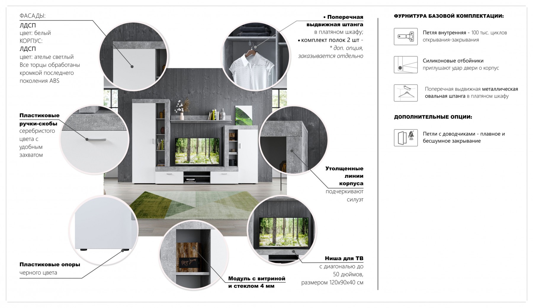 Стенка "Орфей" выполнена в стиле минимализма. Утолщенные линии силуэта подчеркивает строгость и выразительность форм, светлые оттенки визуально расширяют пространство, делая его более воздушным и уютным. В стенке предусмотрены секции для открытого и закрытого хранения различных предметов, электроники и телевизора. Композицию дополняет вместительный шкаф с функциональной выдвижной штангой, который предоставляет возможность увеличить вместимость за счет установки дополнительных полок. Экологичные материалы используемые в производстве стенки помогут создать здоровое пространство для отдыха и творческой деятельности.