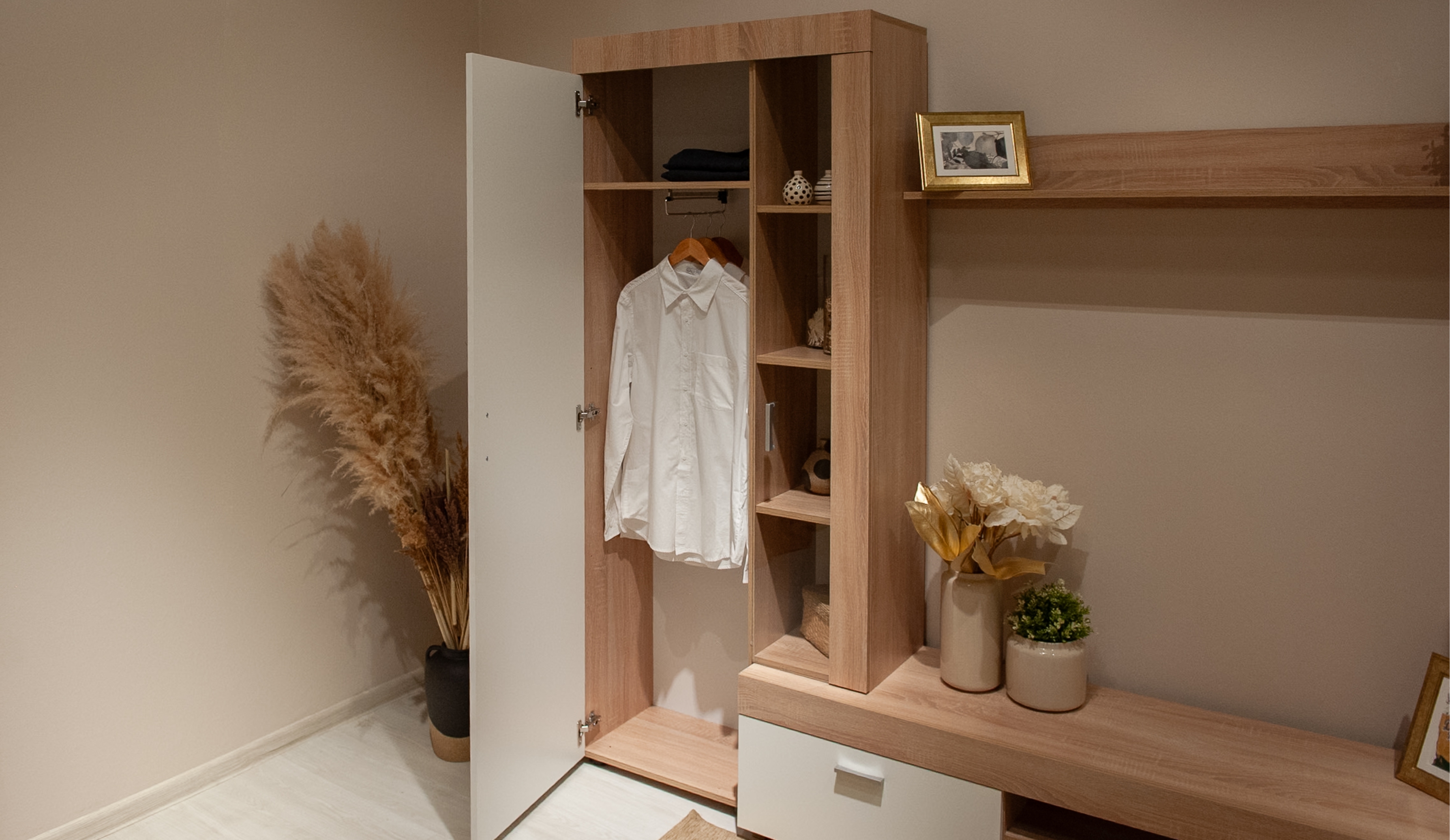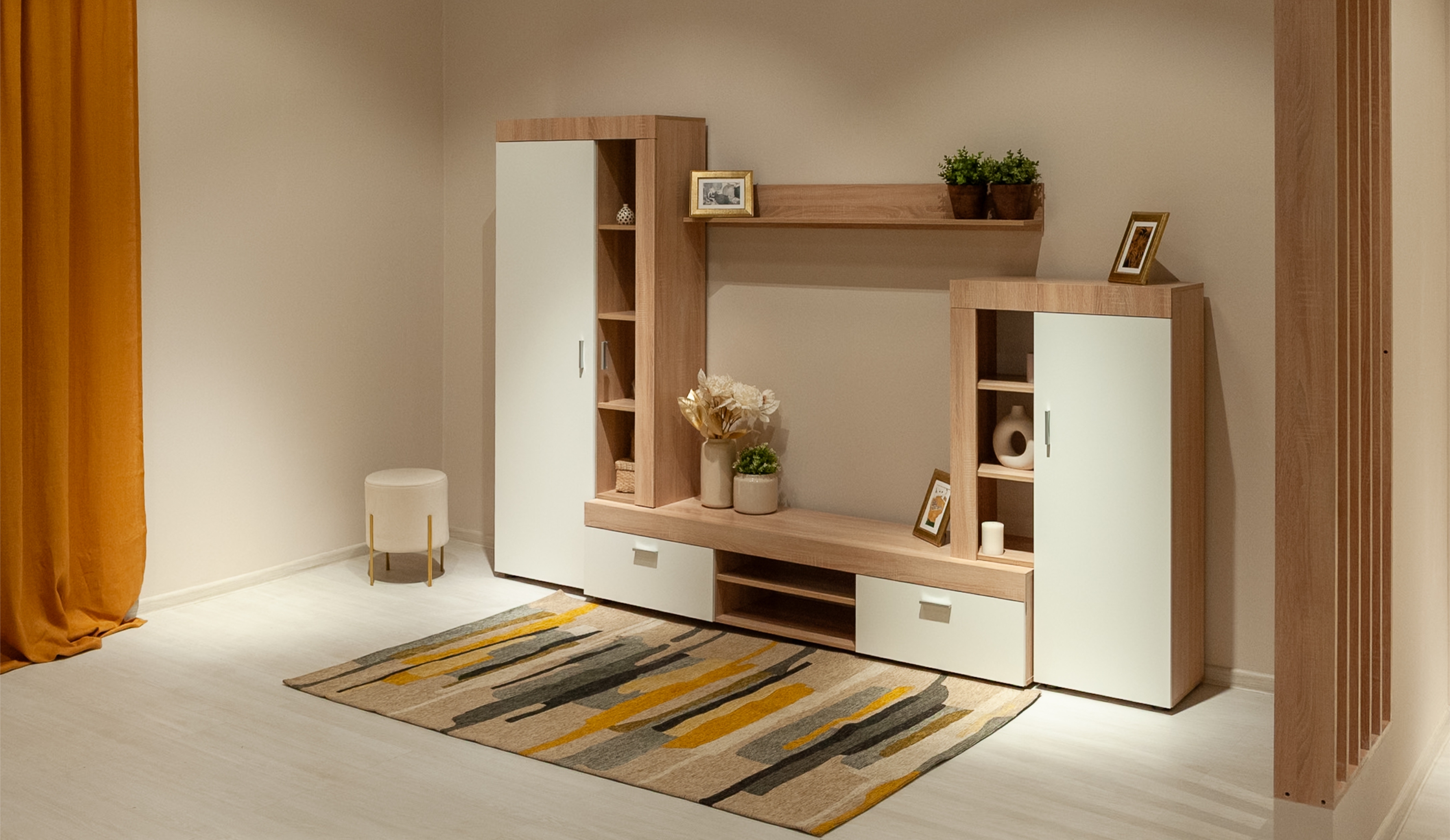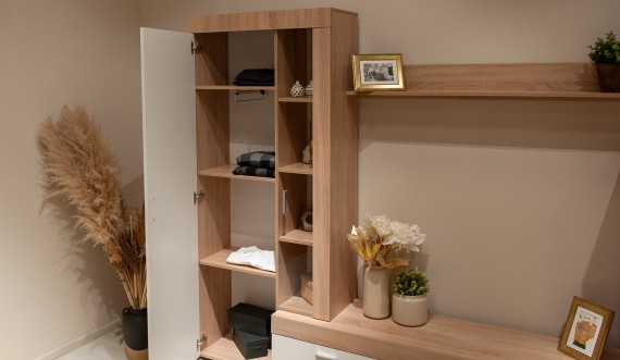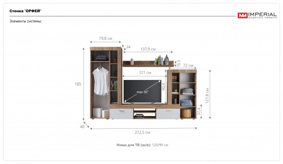 Стенка "Орфей" выполнена в стиле минимализма. Утолщенные линии силуэта подчеркивает строгость и выразительность форм, светлые оттенки визуально расширяют пространство, делая его более воздушным и уютным. В стенке предусмотрены секции для открытого и закрытого хранения различных предметов, электроники и телевизора. Композицию дополняет вместительный шкаф с функциональной выдвижной штангой, который предоставляет возможность увеличить вместимость за счет установки дополнительных полок. Экологичные материалы используемые в производстве стенки помогут создать здоровое пространство для отдыха и творческой деятельности.