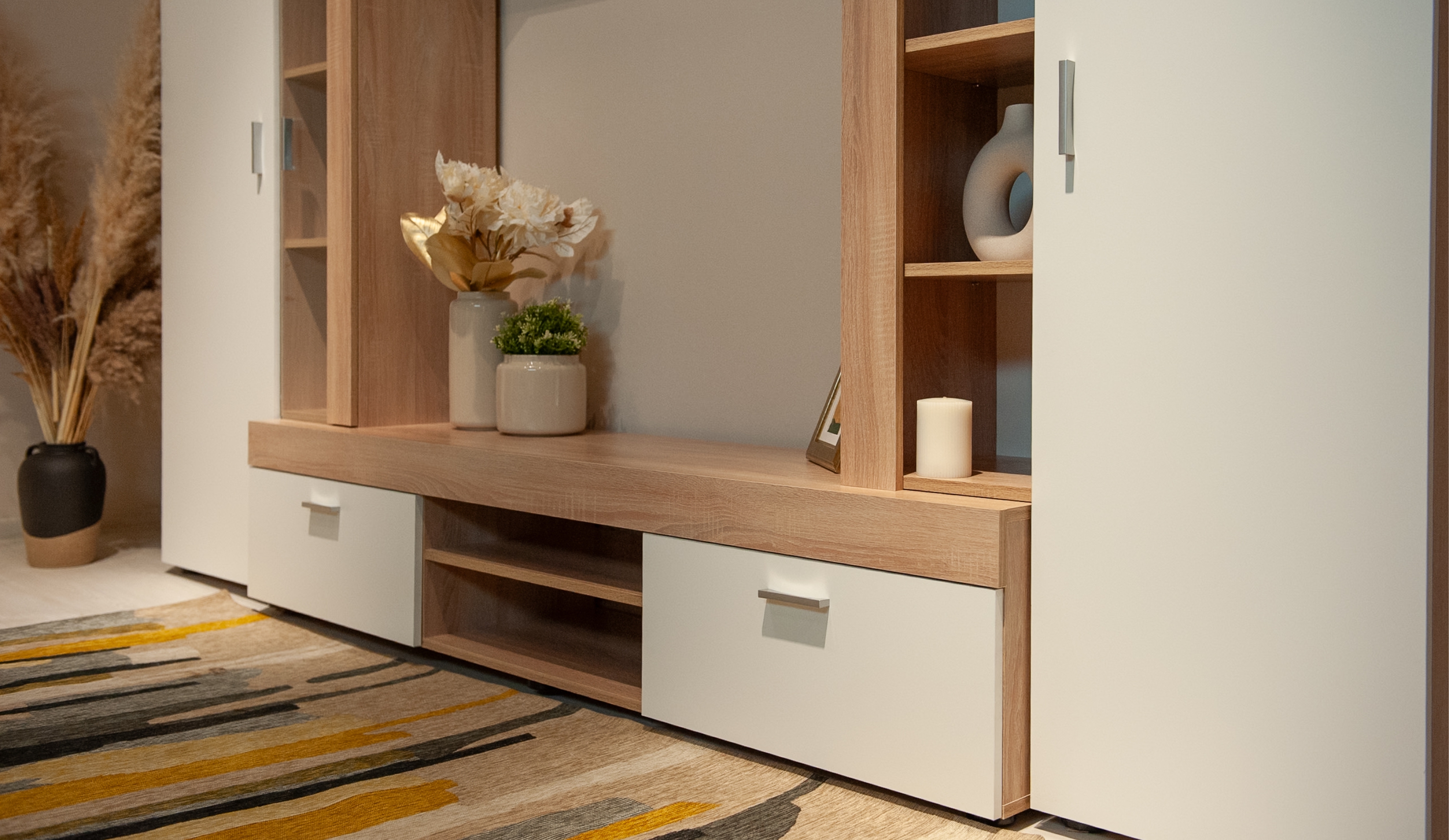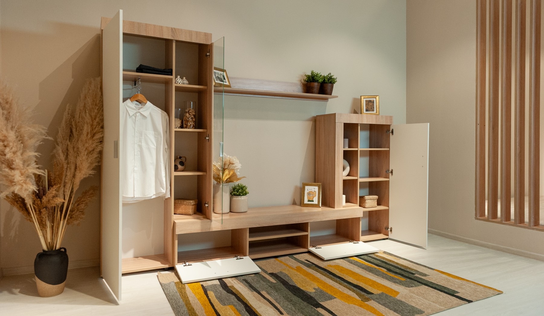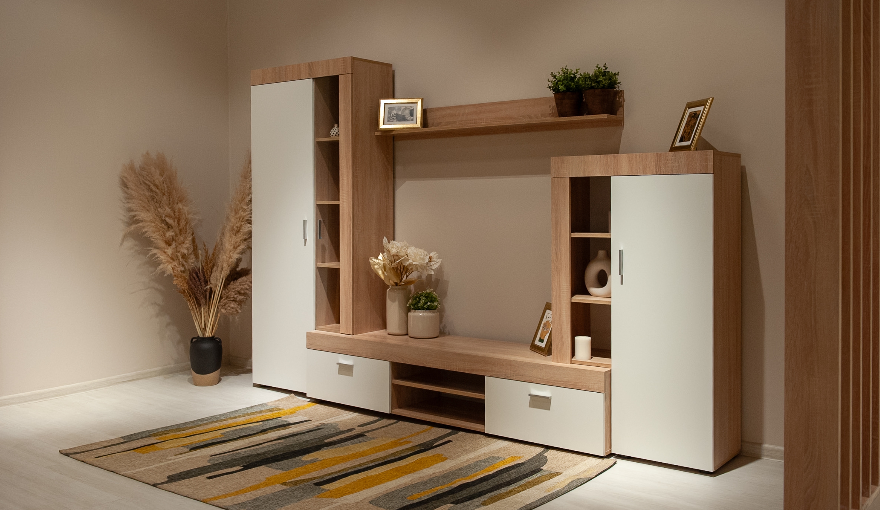 Стенка "Орфей" выполнена в стиле минимализма. Утолщенные линии силуэта подчеркивает строгость и выразительность форм, светлые оттенки визуально расширяют пространство, делая его более воздушным и уютным. В стенке предусмотрены секции для открытого и закрытого хранения различных предметов, электроники и телевизора. Композицию дополняет вместительный шкаф с функциональной выдвижной штангой, который предоставляет возможность увеличить вместимость за счет установки дополнительных полок. Экологичные материалы используемые в производстве стенки помогут создать здоровое пространство для отдыха и творческой деятельности.
