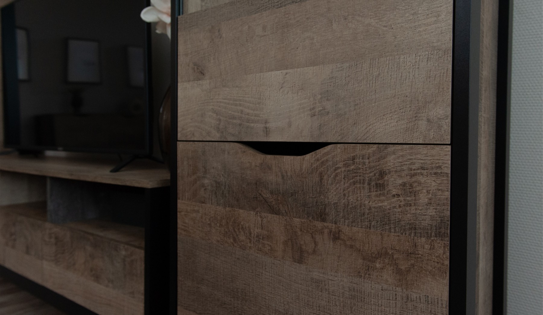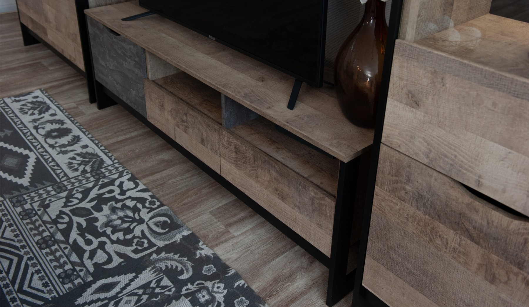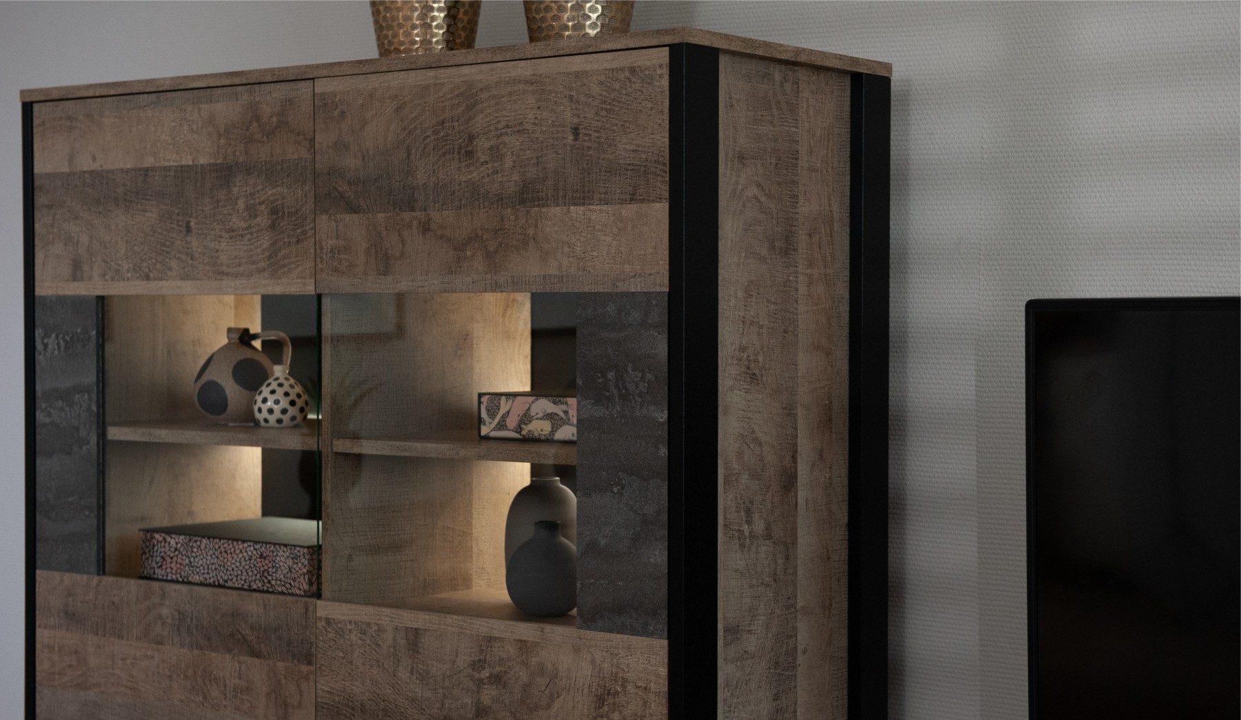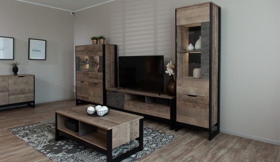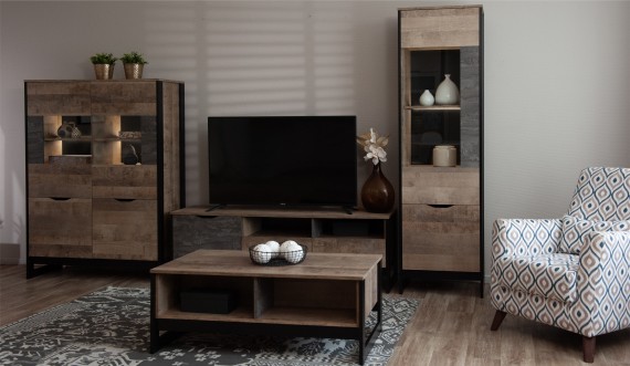 Современная стенка Стокгольм — это стильный выбор для гостиной в духе лофта. Декоративные элементы, имитирующие состаренную штукатурку, металлическую патину и деревянную текстуру, соответствуют новым тенденциям современного городского интерьера. Ножки-опоры из черного МДФ профиля подчеркивают минималистичную эстетику стенки. Витрины со стеклянными фасадами, оборудованные подсветкой, облегчают общий вид стенки и выигрышно демонстрируют декор, посуду или книги.
