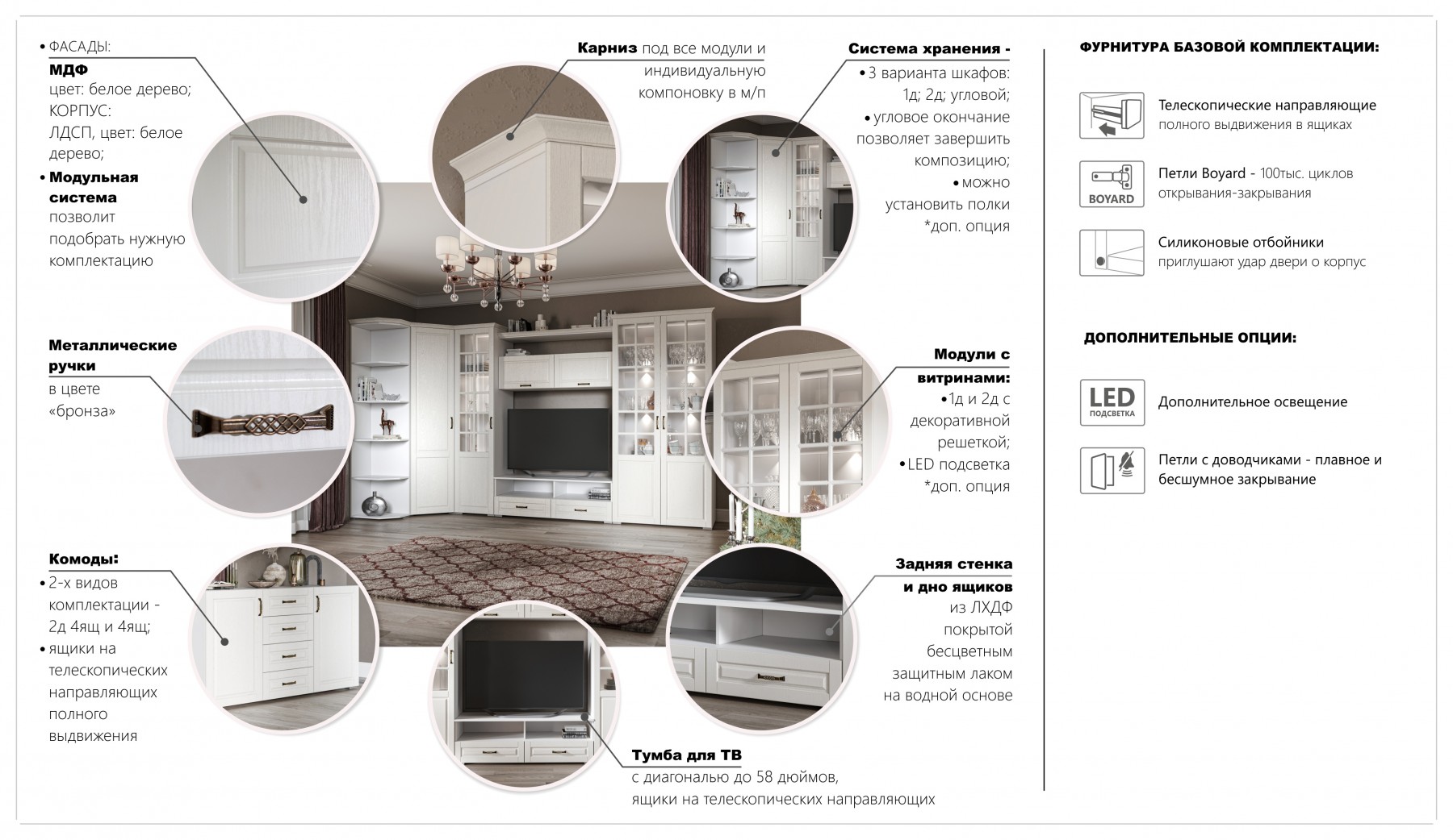 • Декоративными элементами стенки являются изысканные фасады из МДФ с утонченной классической фрезеровкой