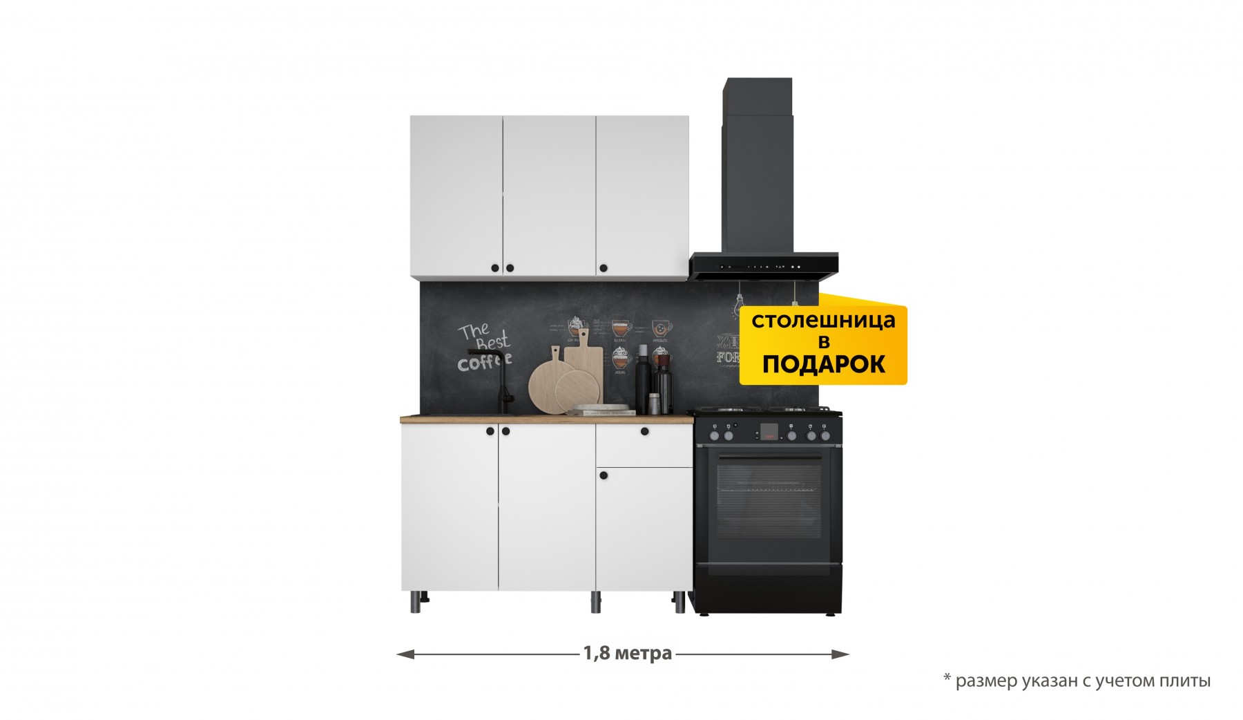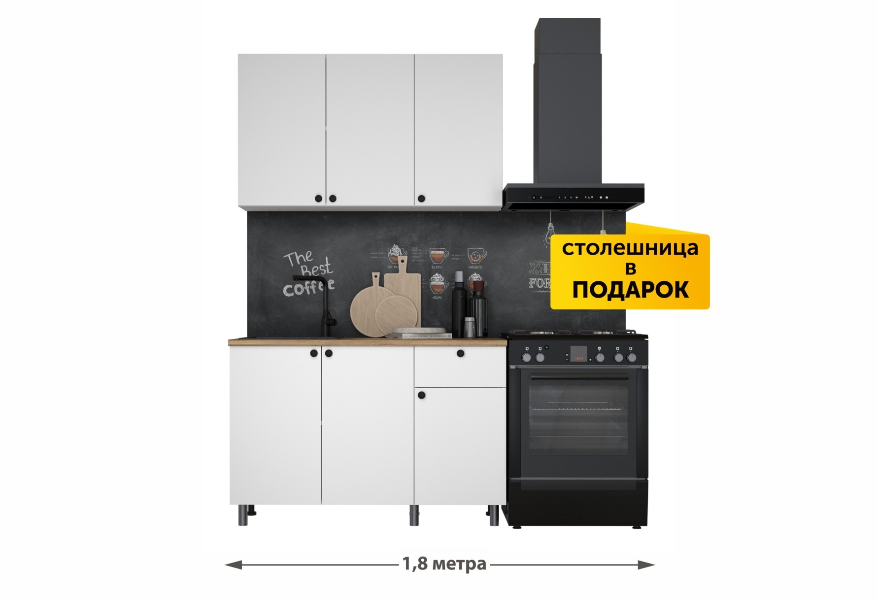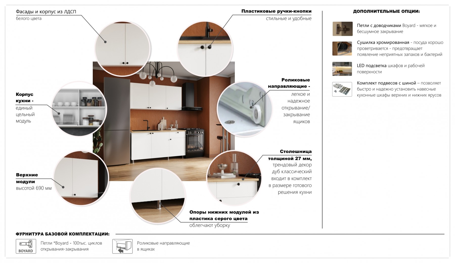 Функциональный готовый комплект кухни в едином корпусе с оптимальным набором модулей для небольших помещений. Лаконичные фасады ЛДСП белого цвета зрительно увеличивают помещение, черные ручки-кнопки с бархатистой поверхностью покрытия Soft-touch подчеркивают минимализм дизайна, пластиковые опоры серого цвета делают кухню легче и невесомей. Столешница в трендовом декоре «Дуб классический» с реалистичным крупным рисунком и оттенком древесной текстуры, входит в комплект в размере готового решения кухни.