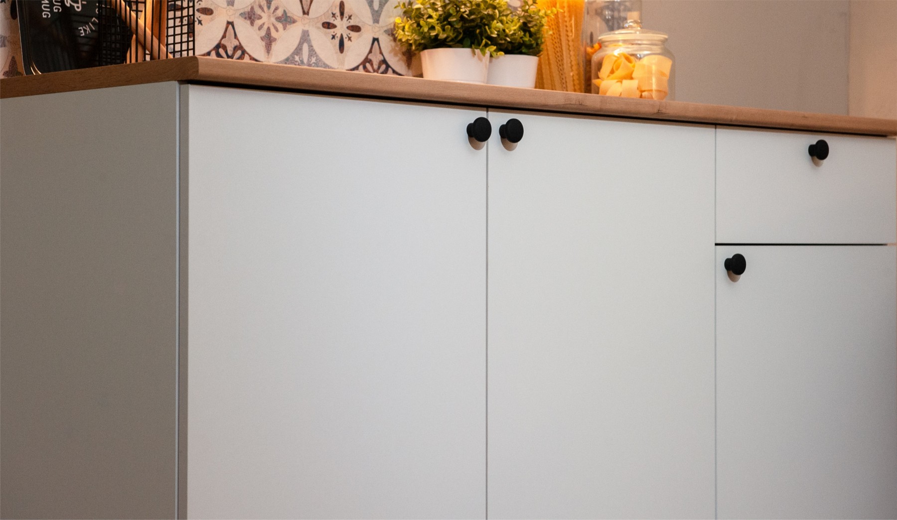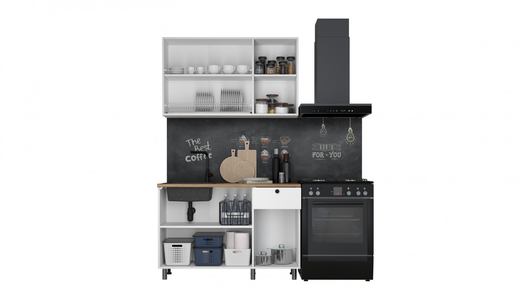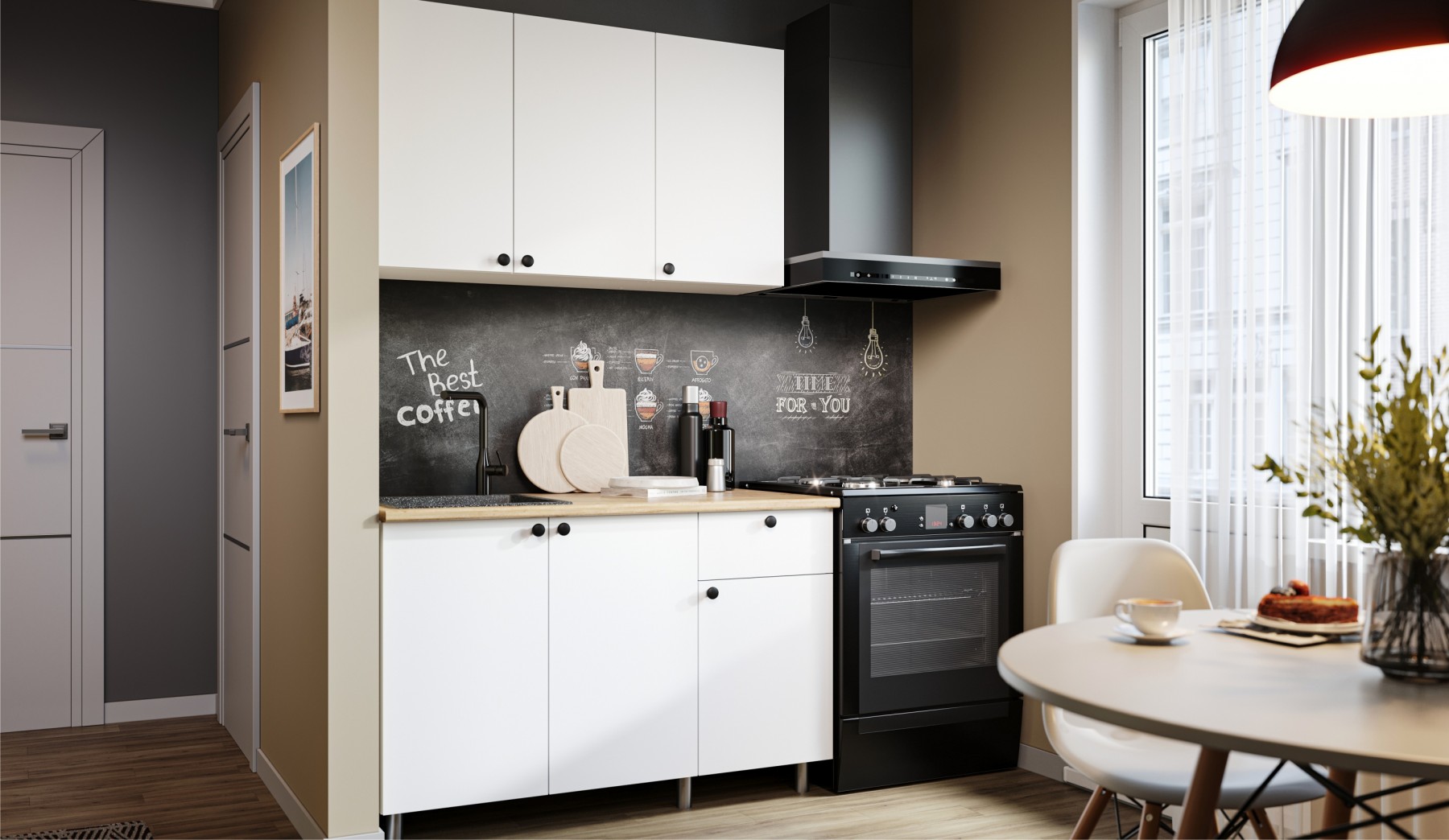 Функциональный готовый комплект кухни в едином корпусе с оптимальным набором модулей для небольших помещений. Лаконичные фасады ЛДСП белого цвета зрительно увеличивают помещение, черные ручки-кнопки с бархатистой поверхностью покрытия Soft-touch подчеркивают минимализм дизайна, пластиковые опоры серого цвета делают кухню легче и невесомей. Столешница в трендовом декоре «Дуб классический» с реалистичным крупным рисунком и оттенком древесной текстуры, входит в комплект в размере готового решения кухни.