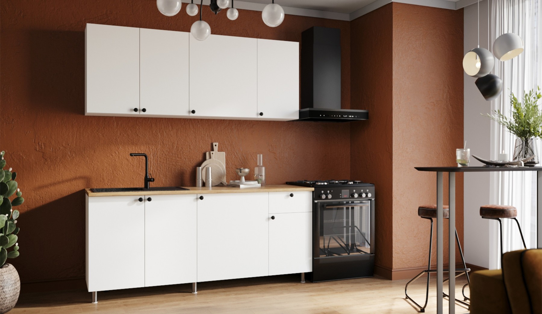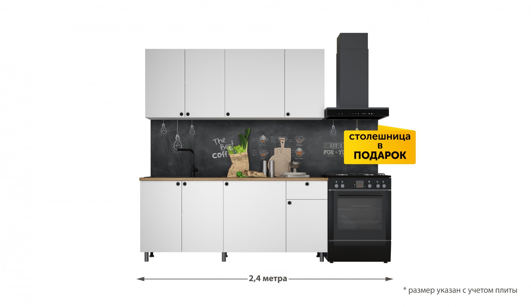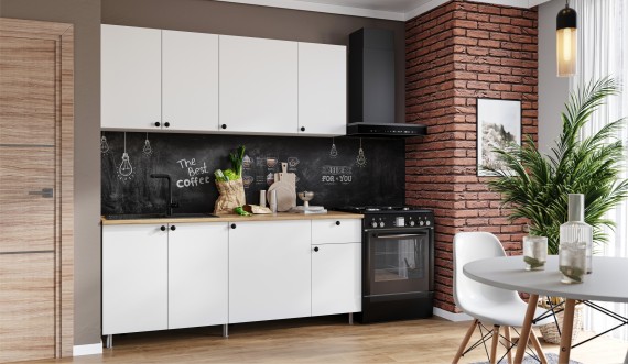 Функциональный готовый комплект кухни в едином корпусе с оптимальным набором модулей для небольших помещений. Лаконичные фасады ЛДСП белого цвета зрительно увеличивают помещение, черные ручки-кнопки с бархатистой поверхностью покрытия Soft-touch подчеркивают минимализм дизайна, пластиковые опоры серого цвета делают кухню легче и невесомей. Столешница в трендовом декоре «Дуб классический» с реалистичным крупным рисунком и оттенком древесной текстуры, входит в комплект в размере готового решения кухни.