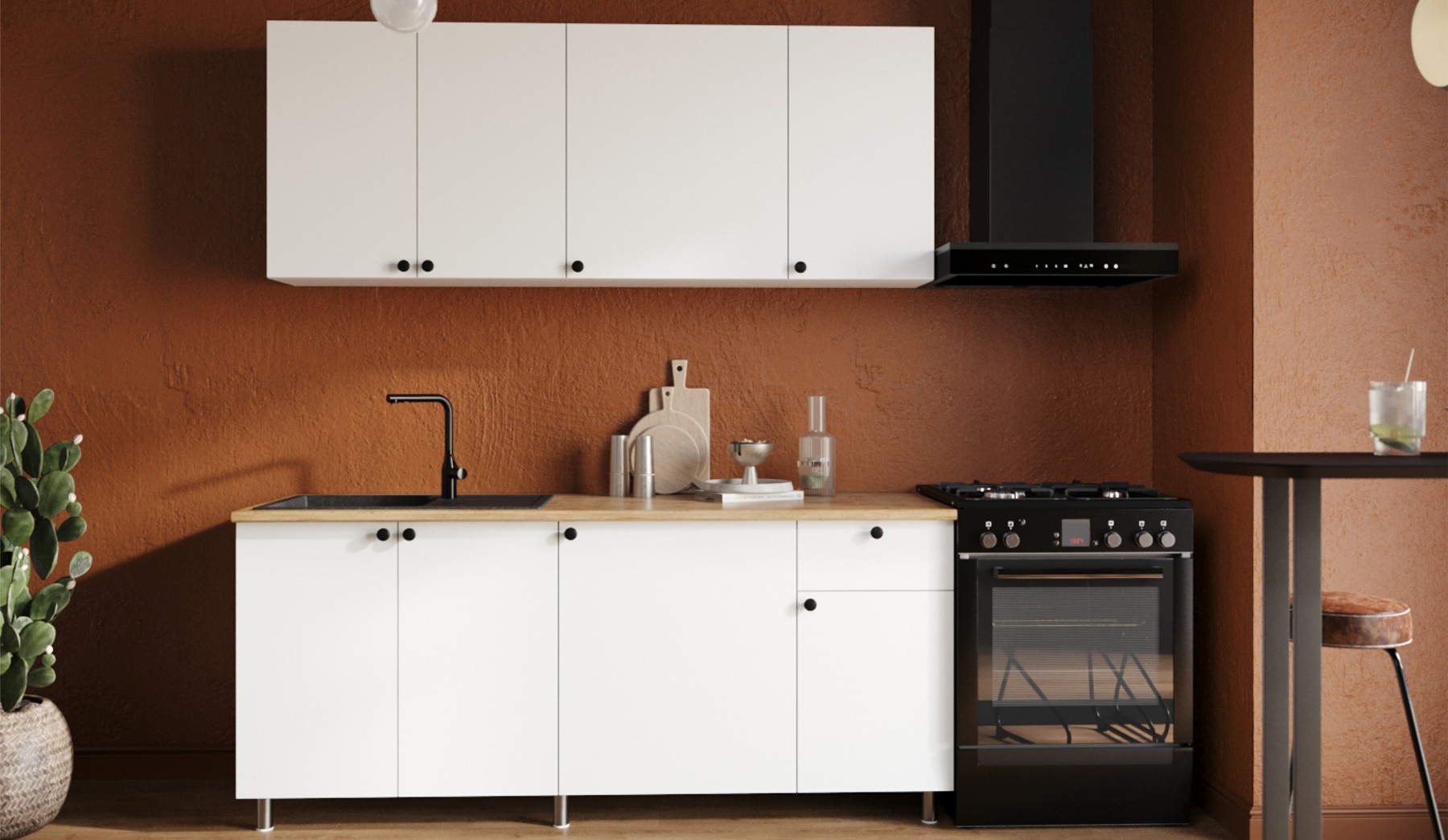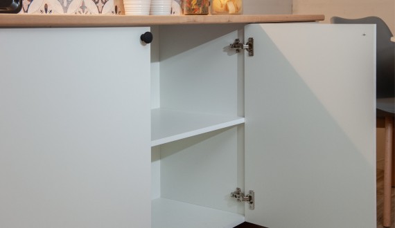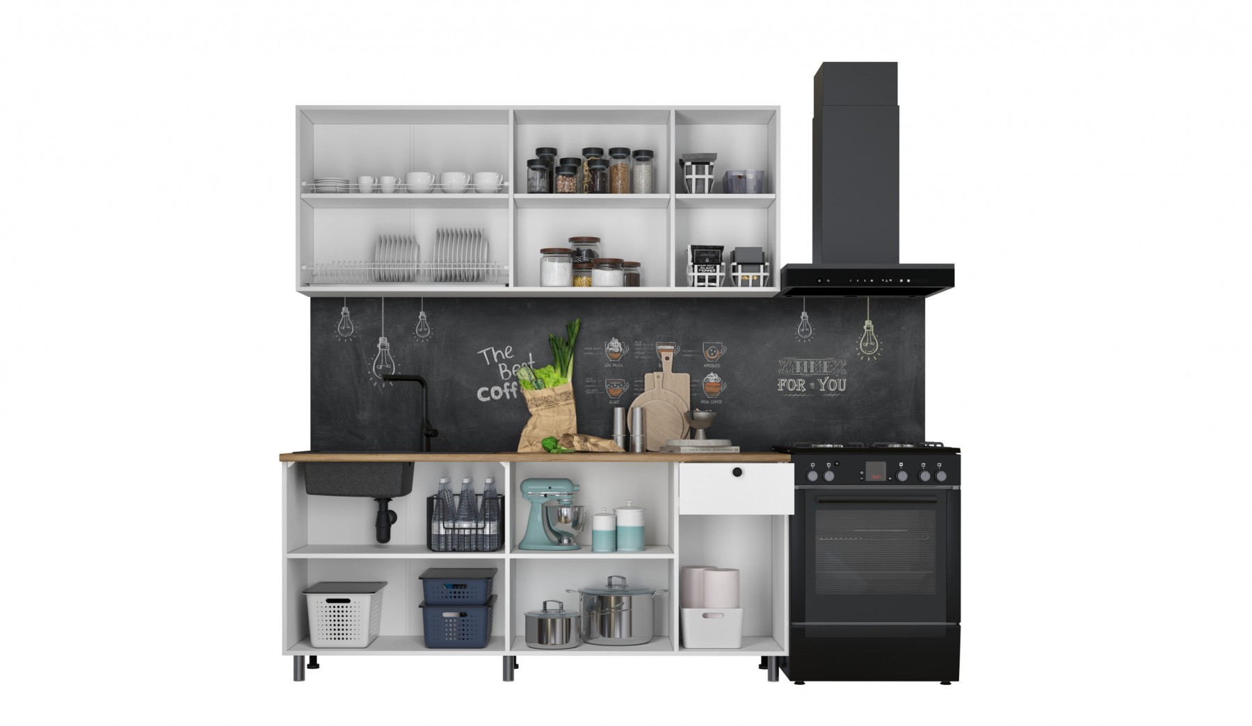 • Полноценные шкафы высотой 69см для хранения посуды, выдвижной ящик для хранения столовых приборов и цельная столешница в комплекте