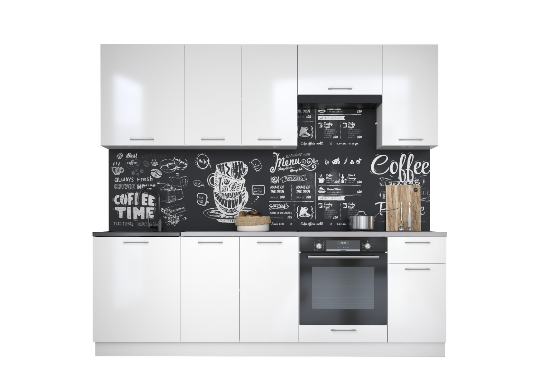 Готовый функциональный комплект кухни «Ника Глосс» – отличное решение для небольших помещений. Современные глянцевые фасады белого цвета подойдут для создания различных стилей интерьера. Зеркальный блеск создает иллюзию увеличенного пространства, придает легкости и воздушности. Изящные ручки-скобы серебристого цвета подчеркивают глубину и блеск фасадов. Кухню при необходимости можно доукомплектовать модулями под вытяжку и духовку. Столешница не входит в комплект и приобретается отдельно.
