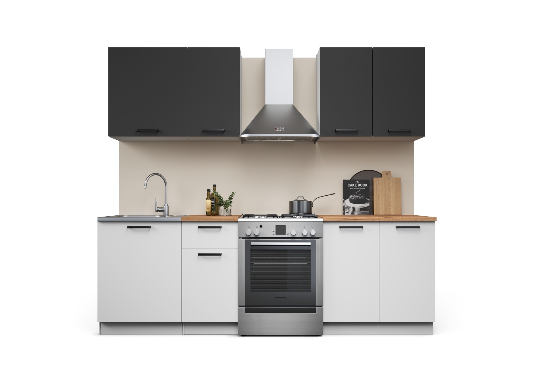 Ника Нео - это функциональная и современная кухня, которая легко адаптируется под ваши потребности и особенности помещения. Антрацитовый цвет добавляет глубину и серьезность, а белый - легкость и воздушность. Такое сочетание создает контраст, который привлекает внимание и подчеркивает чистоту линий. Черные ручки с покрытием soft-touch визуально дополняют образ и обеспечивают комфорт при использовании. В комплект входит столешница с декором под классический дуб, добавляя мебели природные акценты и гармонию.