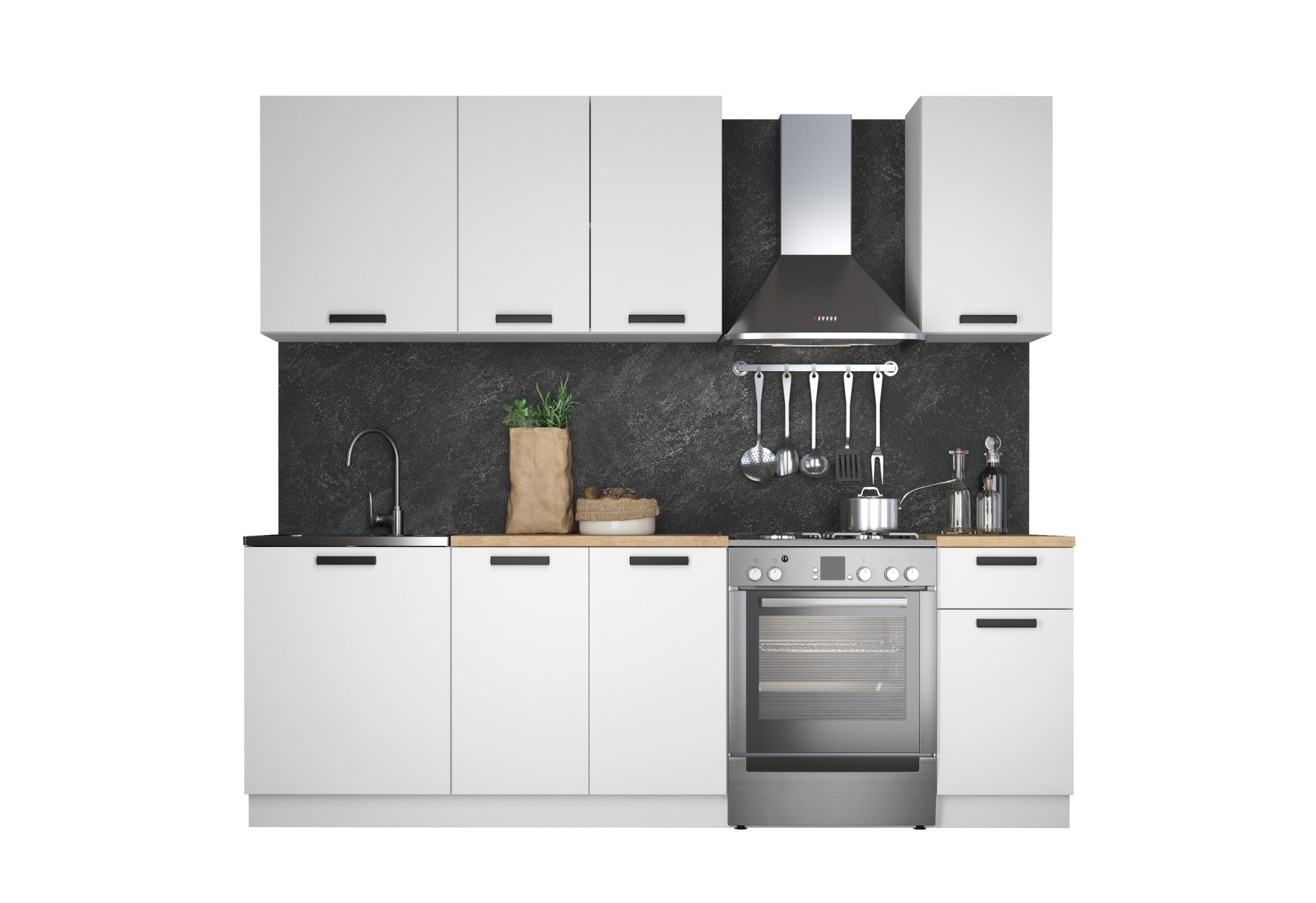 Функциональный готовый комплект модулей «Ника» подойдет для небольшой кухни в стиле сканди, лофт, экоминимализм. Лаконичные фасады ЛДСП в актуальных декорах природных оттенков в сочетании с классическим белым цветом создают спокойную гармоничную атмосферу, зрительно увеличивают пространство. Широкие черные ручки-скобы с бархатистым покрытием Soft-touch удобны в использовании и придают своеобразный колорит и характер кухне. Кухню при необходимости можно доукомплектовать модулями под вытяжку и духовку. Столешница в комплект не входит.