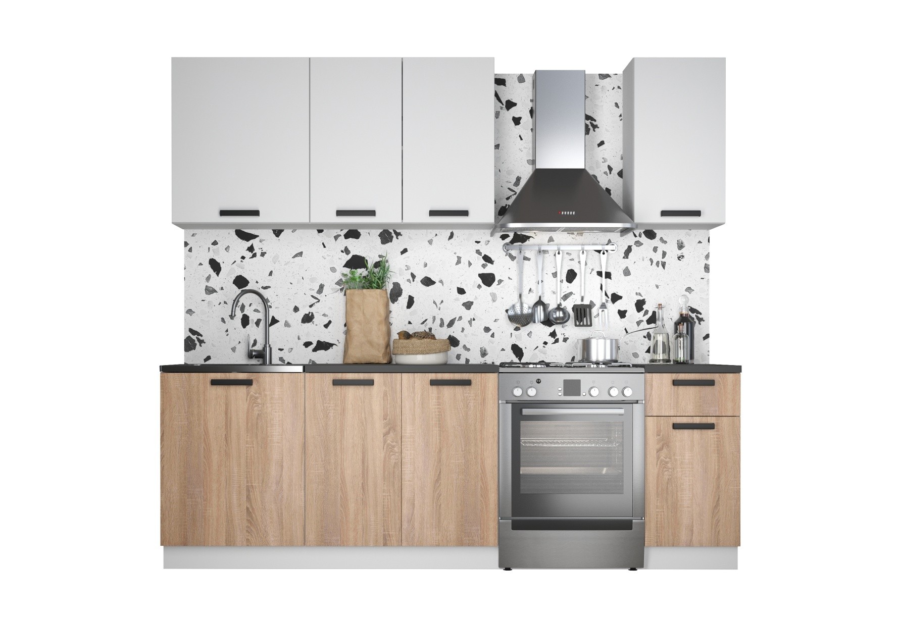 Функциональный готовый комплект модулей «Ника» подойдет для небольшой кухни в стиле сканди, лофт, экоминимализм. Лаконичные фасады ЛДСП в актуальных декорах природных оттенков в сочетании с классическим белым цветом создают спокойную гармоничную атмосферу, зрительно увеличивают пространство. Широкие черные ручки-скобы с бархатистым покрытием Soft-touch удобны в использовании и придают своеобразный колорит и характер кухне. Кухню при необходимости можно доукомплектовать модулями под вытяжку и духовку. Столешница в комплект не входит.