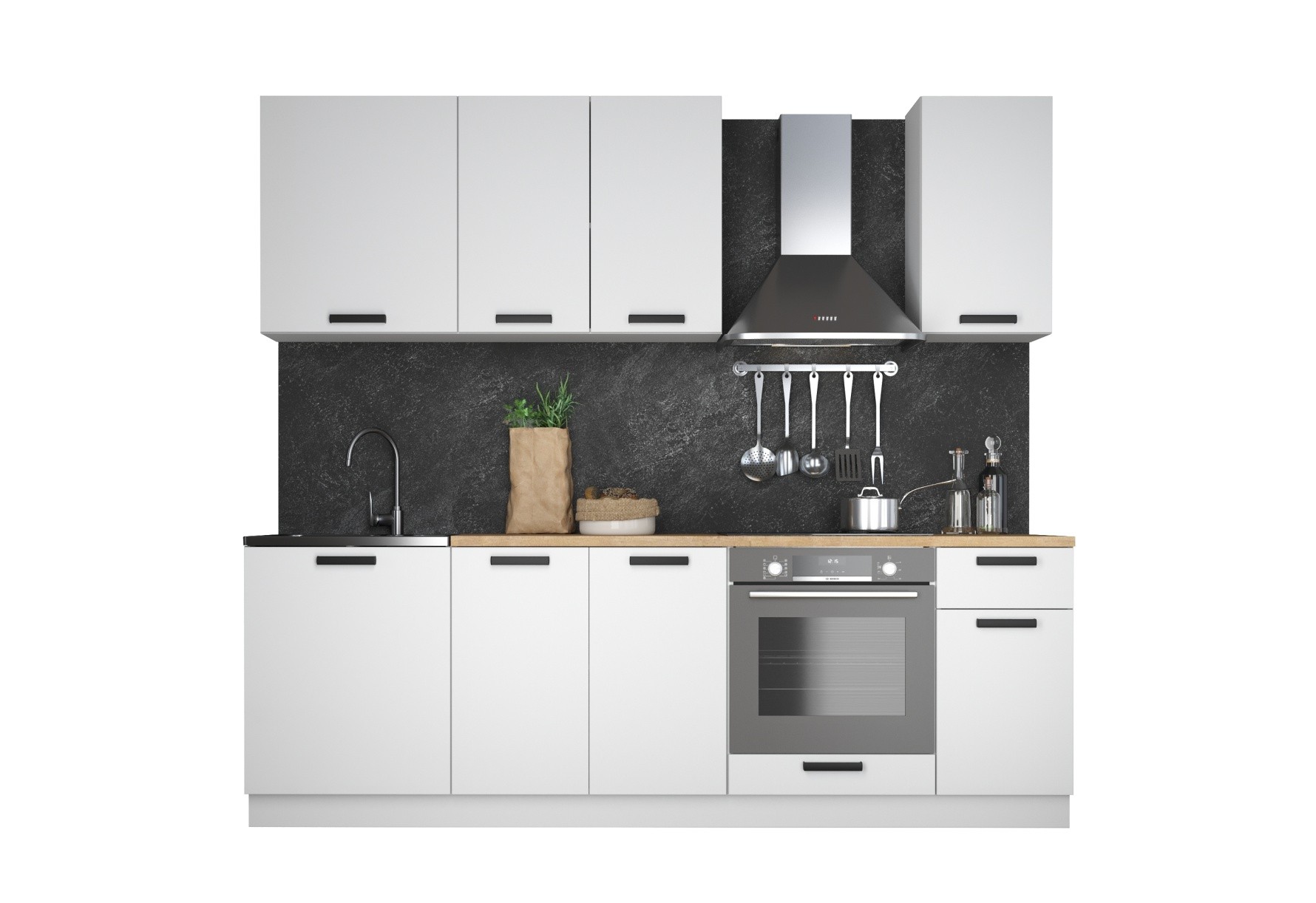 Функциональный готовый комплект модулей «Ника» подойдет для небольшой кухни в стиле сканди, лофт, экоминимализм. Лаконичные фасады ЛДСП в актуальных декорах природных оттенков в сочетании с классическим белым цветом создают спокойную гармоничную атмосферу, зрительно увеличивают пространство. Широкие черные ручки-скобы с бархатистым покрытием Soft-touch удобны в использовании и придают своеобразный колорит и характер кухне. Кухню при необходимости можно доукомплектовать модулями под вытяжку и духовку. Столешница в комплект не входит.