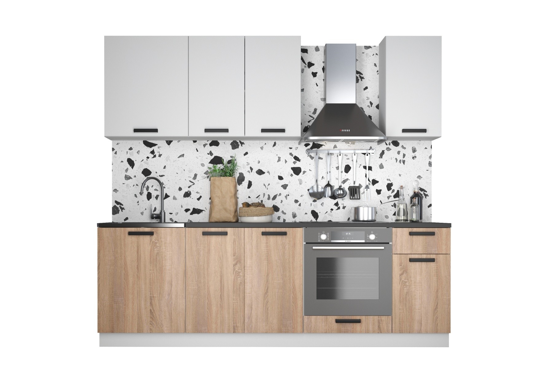 Функциональный готовый комплект модулей «Ника» подойдет для небольшой кухни в стиле сканди, лофт, экоминимализм. Лаконичные фасады ЛДСП в актуальных декорах природных оттенков в сочетании с классическим белым цветом создают спокойную гармоничную атмосферу, зрительно увеличивают пространство. Широкие черные ручки-скобы с бархатистым покрытием Soft-touch удобны в использовании и придают своеобразный колорит и характер кухне. Кухню при необходимости можно доукомплектовать модулями под вытяжку и духовку. Столешница в комплект не входит.
