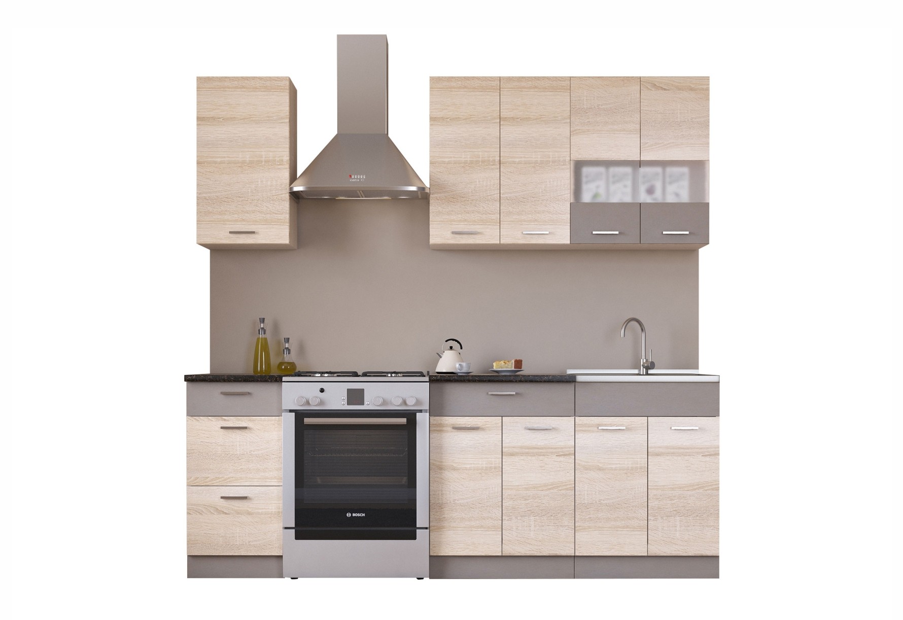 Кухня Николь специально разрабатывалась для создания интерьера студий (объединенное жилое и кухонное пространство) или для кухонь, совмещенных с гостиными. Поэтому и выбран один из самых распространенных сегодня цветов в мебели для жилых комнат - дуб сонома. Эта кухня гармонично впишется в пространство с другой жилой мебелью - шкафами, стеллажами, тумбами, столами и т.д. Широкий выбор сегментов модели Николь позволяет и вписать ее в небольшое помещение, и создать проект большой функциональной кухни. Дополнительную функциональность кухне придает то, что почти во всех нижних модулях есть выдвижные ящики. Наличие дополнительных опций дает возможность создать даже с небольшим бюджетом дизайнерский интерьер. Несмотря на невысокую стоимость, в этой кухне сохранены все экологические стандарты и использована качественная фурнитура. Столешница в комплект не входит, можно заказать у нас в размер Вашей кухни.