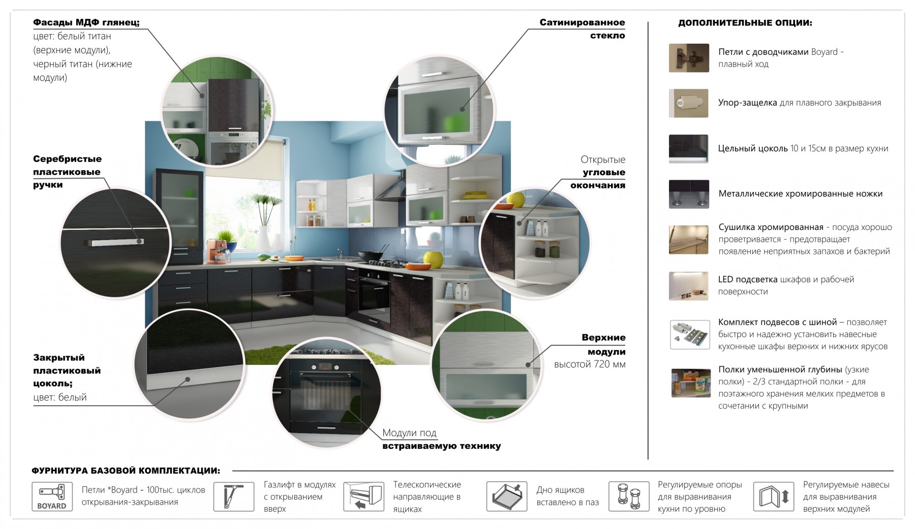• В базовую комплектацию кухни входят регулируемые ножки с закрытым белым цоколем высотой 10см, которые улучшают внешний вид кухни и облегчает процесс уборки