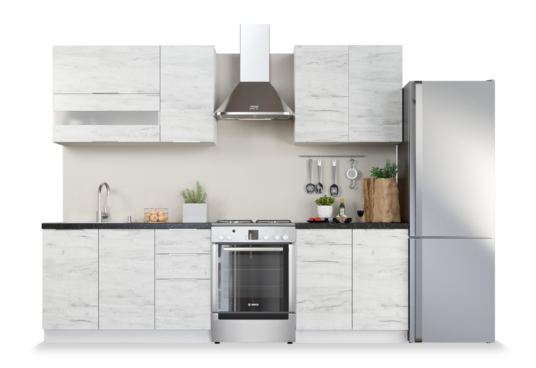 Равенна Тренд – кухня в современном стиле, создана для ценителей природных мотивов и спокойных тонов в интерьере. Верхние и нижние фасады из ЛДСП с модным декором «Крафт белый», невероятно реалистично имитирующим рисунок и текстуру натурального дерева, создают ощущение свежести и чистоты, зрительно раздвигают пространство, добавляют свет – это особенно актуально для помещений, расположенных на северной стороне. Торцевые металлические ручки подчеркивают минимализм модулей и обезопасят от травм, за кухней легко ухаживать. Столешница в комплект не входит, можно заказать у нас в размер Вашей кухни.