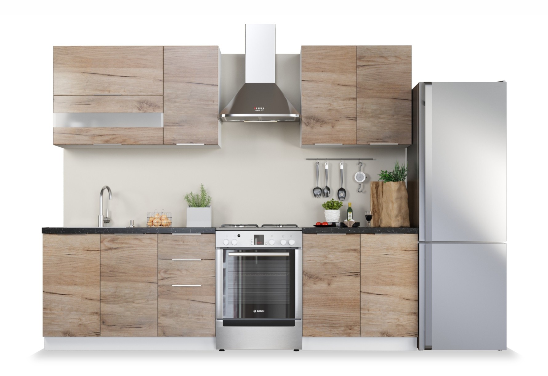 Равенна Тренд – кухня в современном стиле, создана для ценителей природных мотивов и спокойных тонов в интерьере. Верхние и нижние фасады из ЛДСП с модным декором «Крафт белый», невероятно реалистично имитирующим рисунок и текстуру натурального дерева, создают ощущение свежести и чистоты, зрительно раздвигают пространство, добавляют свет – это особенно актуально для помещений, расположенных на северной стороне. Торцевые металлические ручки подчеркивают минимализм модулей и обезопасят от травм, за кухней легко ухаживать. Столешница в комплект не входит, можно заказать у нас в размер Вашей кухни.