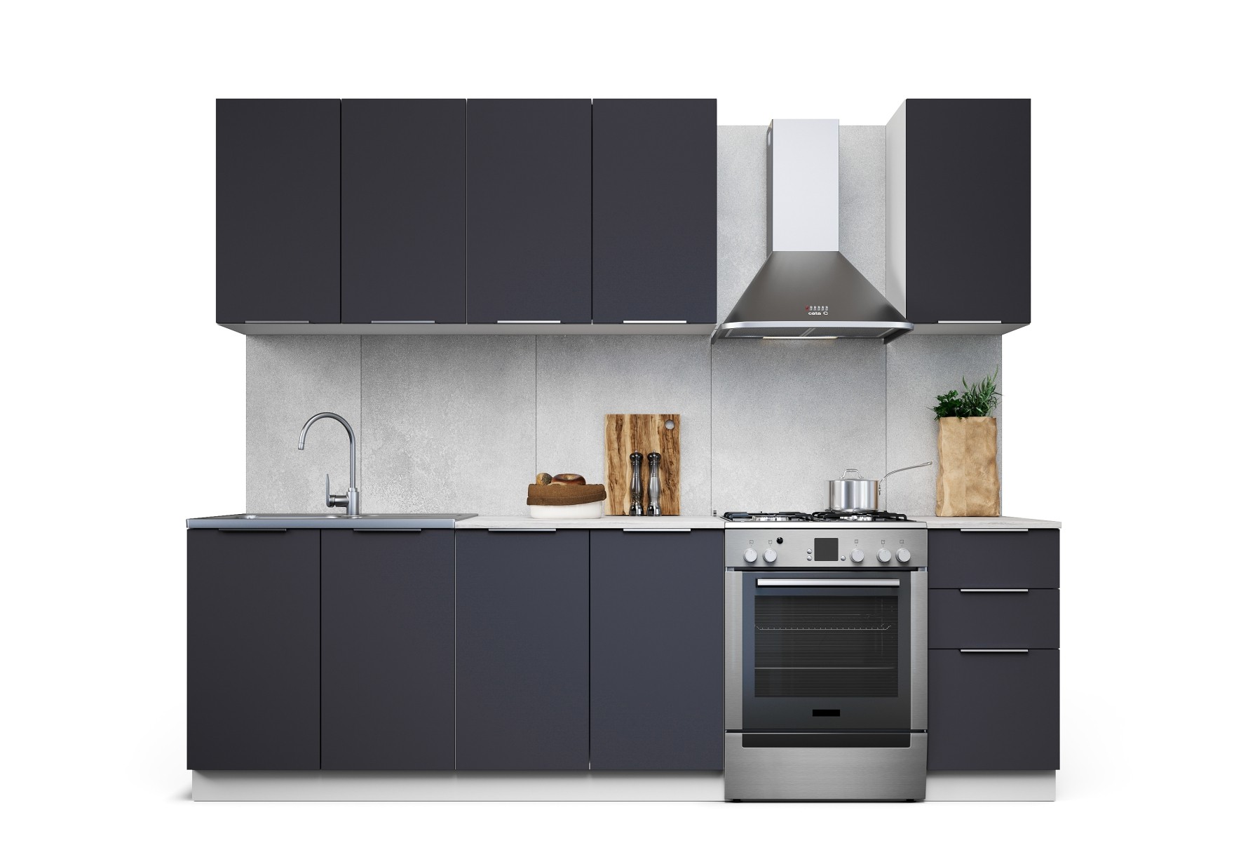 Функциональная кухня Равенна Тренд Софт выполнена в спокойных природных тонах и великолепно смотрится в современных интерьерах. Цвет декора «Монте» на фасадах из МДФ с красивым рисунком под мрамор – эффектный акцент, создает безупречное сочетание с декором цвета темной морской волны Маренго. Инновационное покрытие Soft-touch с матовым, тактильно приятным бархатистым эффектом придает кухне премиальный вид. Покрытие устойчиво к влаге и мелким царапинам, не оставляет следов от пальцев, долго сохраняет цвет и яркость. Торцевые металлические ручки подчеркивают минимализм модулей, обезопасят от травм. Столешница в комплект не входит, можно заказать у нас в размер Вашей кухни.
