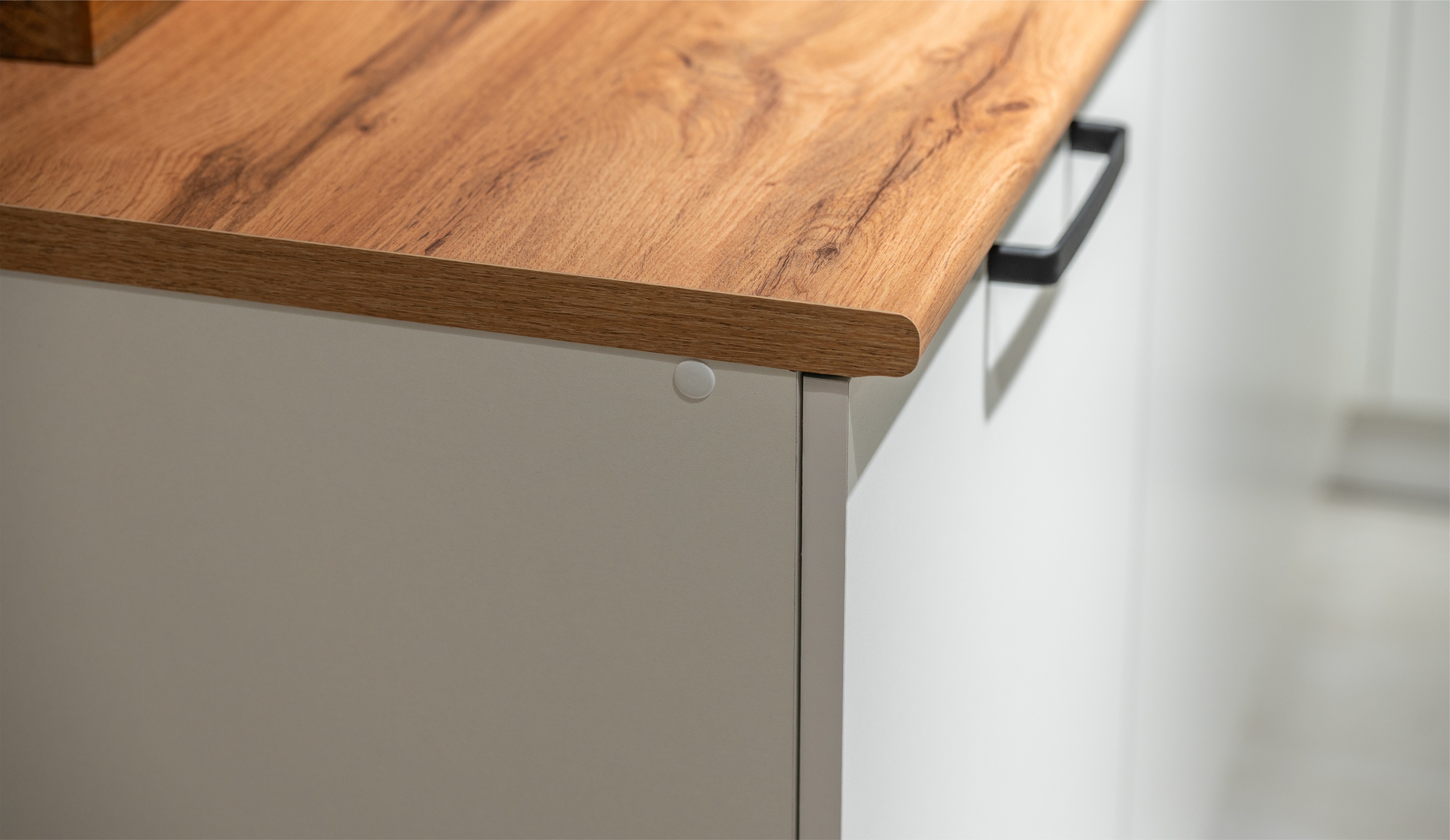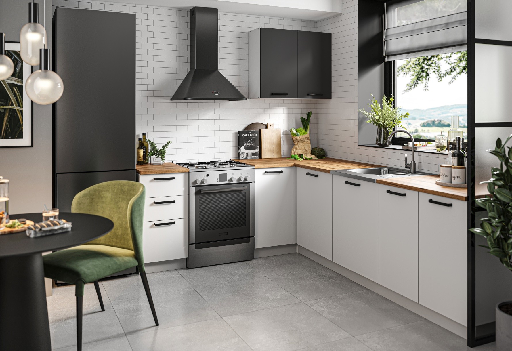 Кухонный гарнитур Ника Нео сочетает в себе элегантность и функциональность, подходит для помещений разного размера, позволяя использовать всё полезное пространство. Верхние шкафы выполнены в насыщенном антрацитовом цвете, который сочетается с белыми нижними модулями, создавая легкий и свежий вид. Четкая игра контрастов делает кухню визуально привлекательной и оригинальной. Ручки черного цвета с мягким покрытием soft-touch выглядят стильно, комфортны в использовании. Столешница, имитирующая текстуру дуба, добавляет тепла и уюта, завершая гармоничный облик кухни.