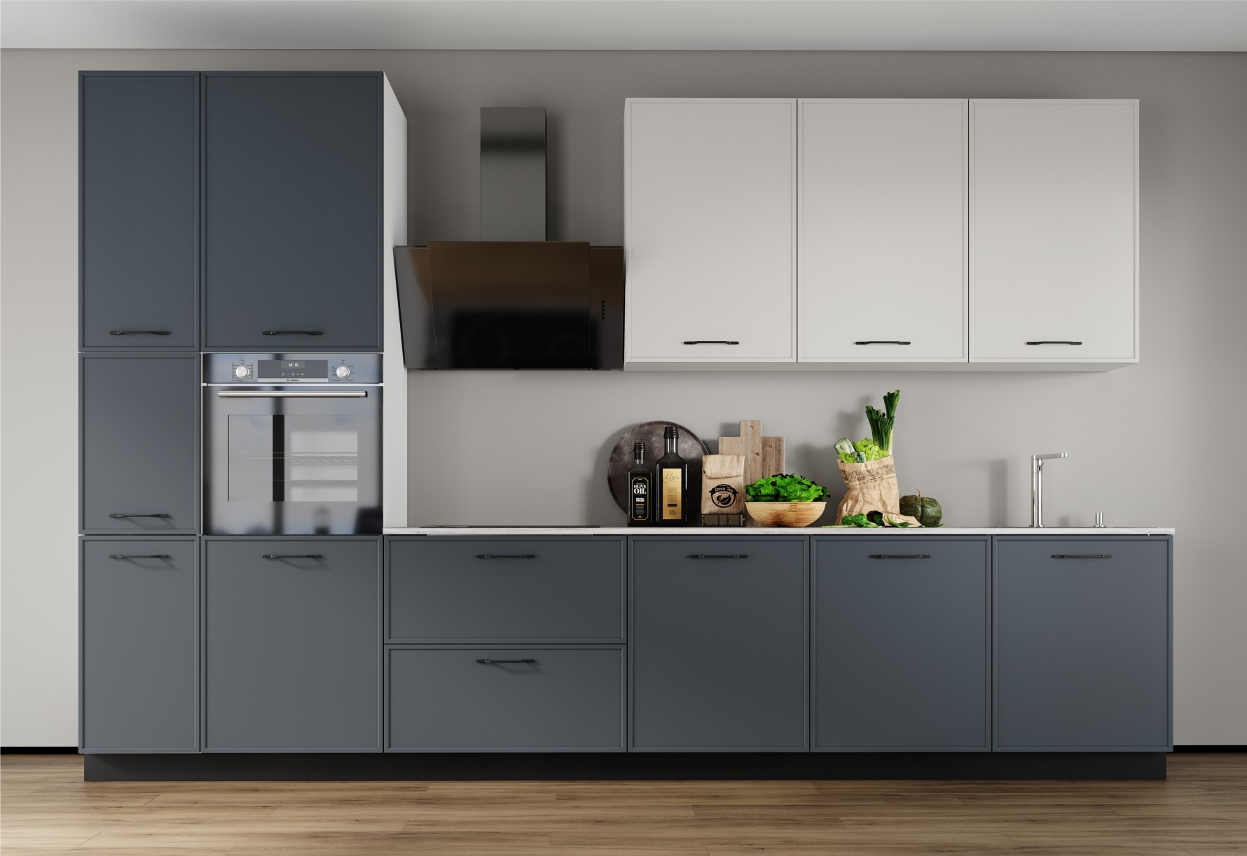Современная элегантная кухня с шелковистыми матовыми фасадами Soft-touch, обрамленными тонкой фрезерованной рамкой, гармонично впишется и украсит любой интерьер. Акцентные тонкие металлические ручки черного цвета подчеркивают легкость и лаконичность образа. Декоры фасадов отвечают новейшим направлениям в дизайне мебели – это и терракот, цвета красноватой обожженной глины, теплые и холодные оттенки серого, благородный бордо и природный бетон краколет, сочетающий в себе текстуру камня и дерева.