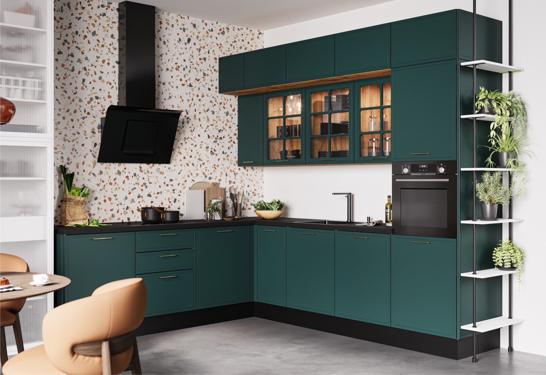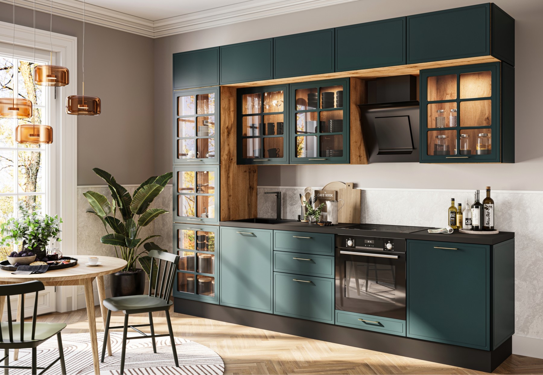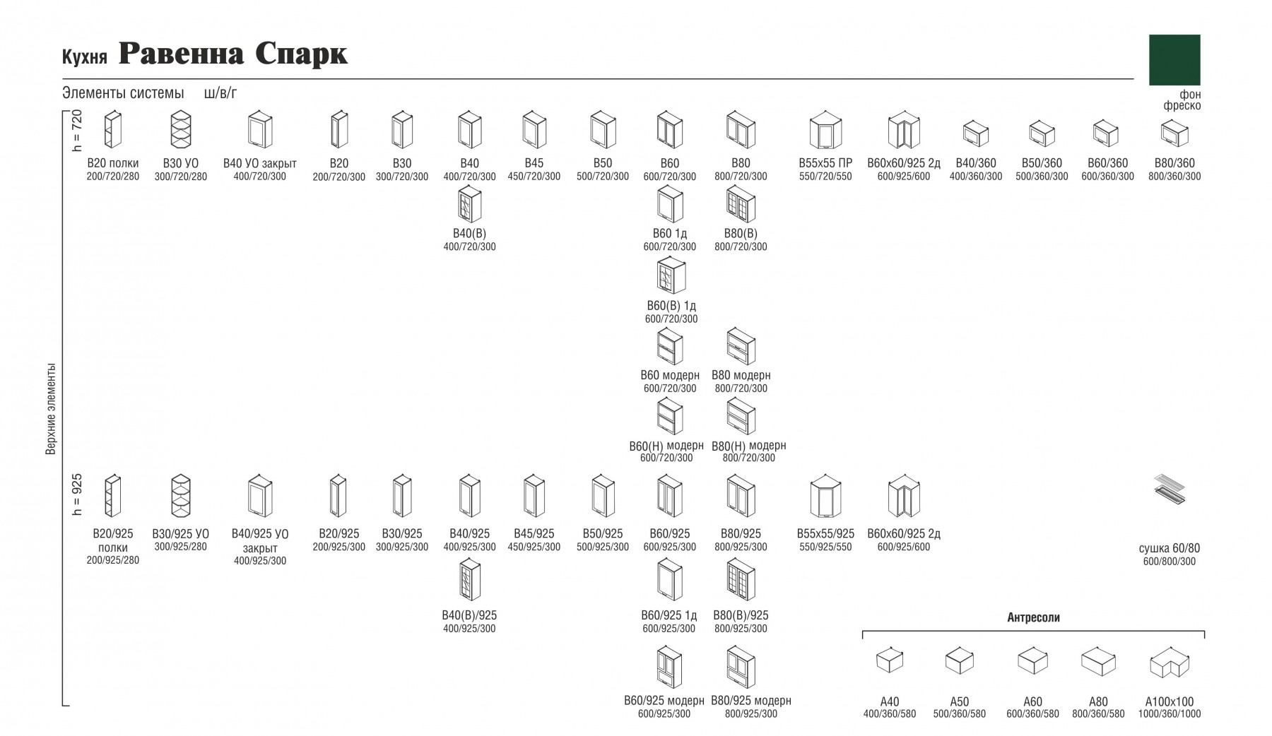 Модульная кухня Равенна Спарк является истинным произведением искусства и воплощает современный подход к классическому стилю. Приглушенный темно-зеленый цвет "Фон Фреско" на фасадах из МДФ придает кухне глубину и характер. Утонченная фрезеровка и металлические матовые ручки в цвете благородного "Брашированного золота" с легкой текстурой добавляют изысканности и эксклюзивности. Теплый древесный цвет корпуса витрин и антресолей Дуб Вотан великолепно гармонирует с общим дизайном. Задняя стенка из ХДФ в витринах в едином цвете с корпусом завершает этот стильный образ. Система модулей Равенна Спарк предлагает широкий выбор вариантов для организации пространства, включая пенал с витринами, в котором будет великолепно смотреться красивая посуда и декор.