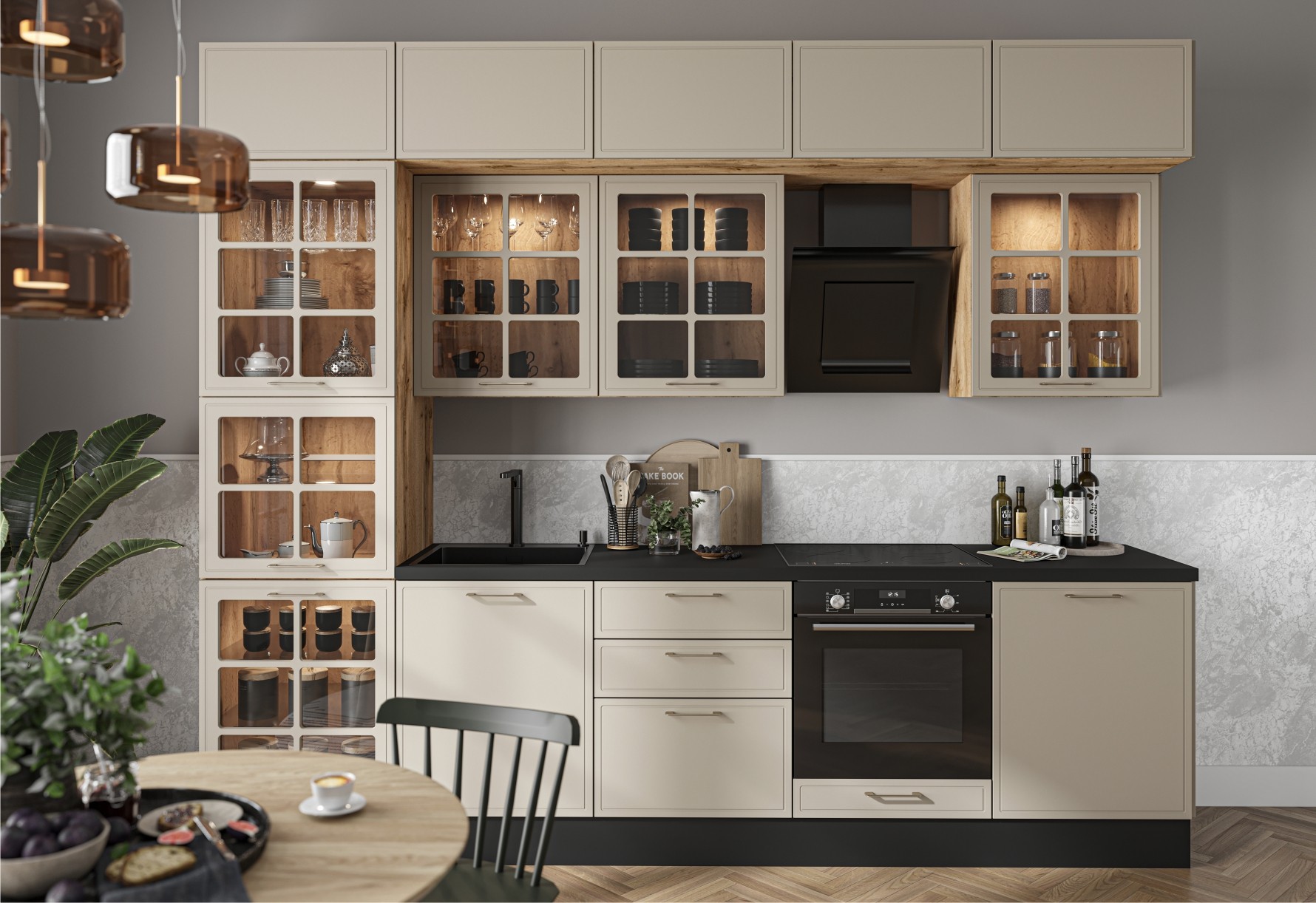 Модульная кухня «Равенна Спарк» — стильное сочетание классики и современности. Элегантные фасады в цвете «Сфинкс» гармонируют с тёплым древесным декором «Дуб Вотан», создавая уютную и благородную атмосферу. Металлические ручки в оттенке «Брашированное золото» и утончённая фрезеровка придают кухне изысканный вид. Корпуса витрин и антресолей выполнены в едином тоне с задними стенками, что подчёркивает целостность дизайна. Модульная система предлагает множество решений для удобной организации пространства — например, пенал с витринами, идеально подходящий для красивой посуды и декора.