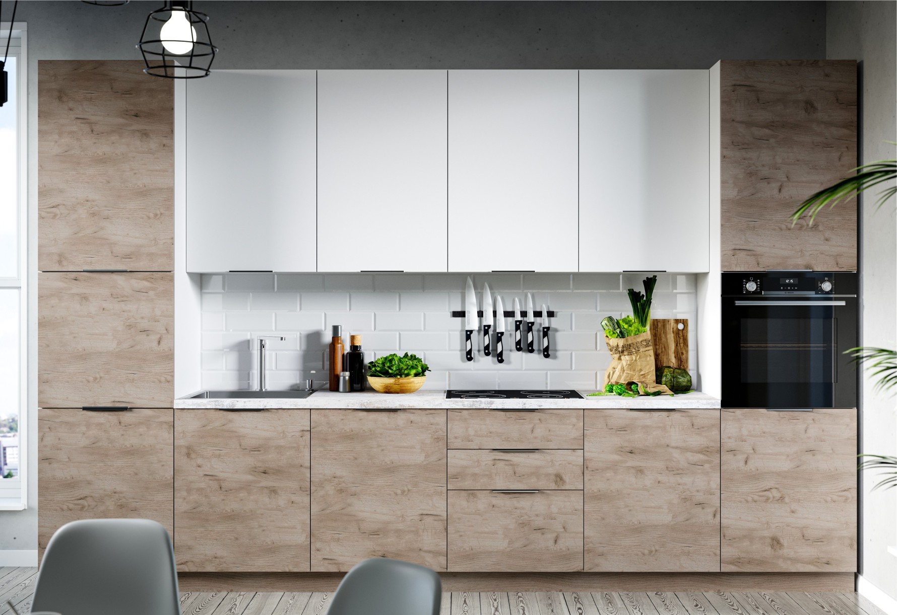 Равенна Тренд создана для ценителей природных мотивов и спокойных тонов в кухонном интерьере и никогда не выйдет из моды. Светлые тона древесины, невероятно реалистично имитирующие рисунок и фактуру натурального дерева на фасадах из ЛДСП, естественно гармонируют с бархатистой поверхностью белых матовых фасадов Силк Сноу линейки Софт, новинкой на российском мебельном рынке. Мягкие и приятные, они оставляют настолько необычные тактильные ощущения, что прикасаться к фасадам хочется еще и еще. Торцевые металлические ручки подчеркивают минимализм модулей и обезопасят от травм, за кухней легко ухаживать. Столешница в комплект не входит, можно заказать у нас в размер Вашей кухни.