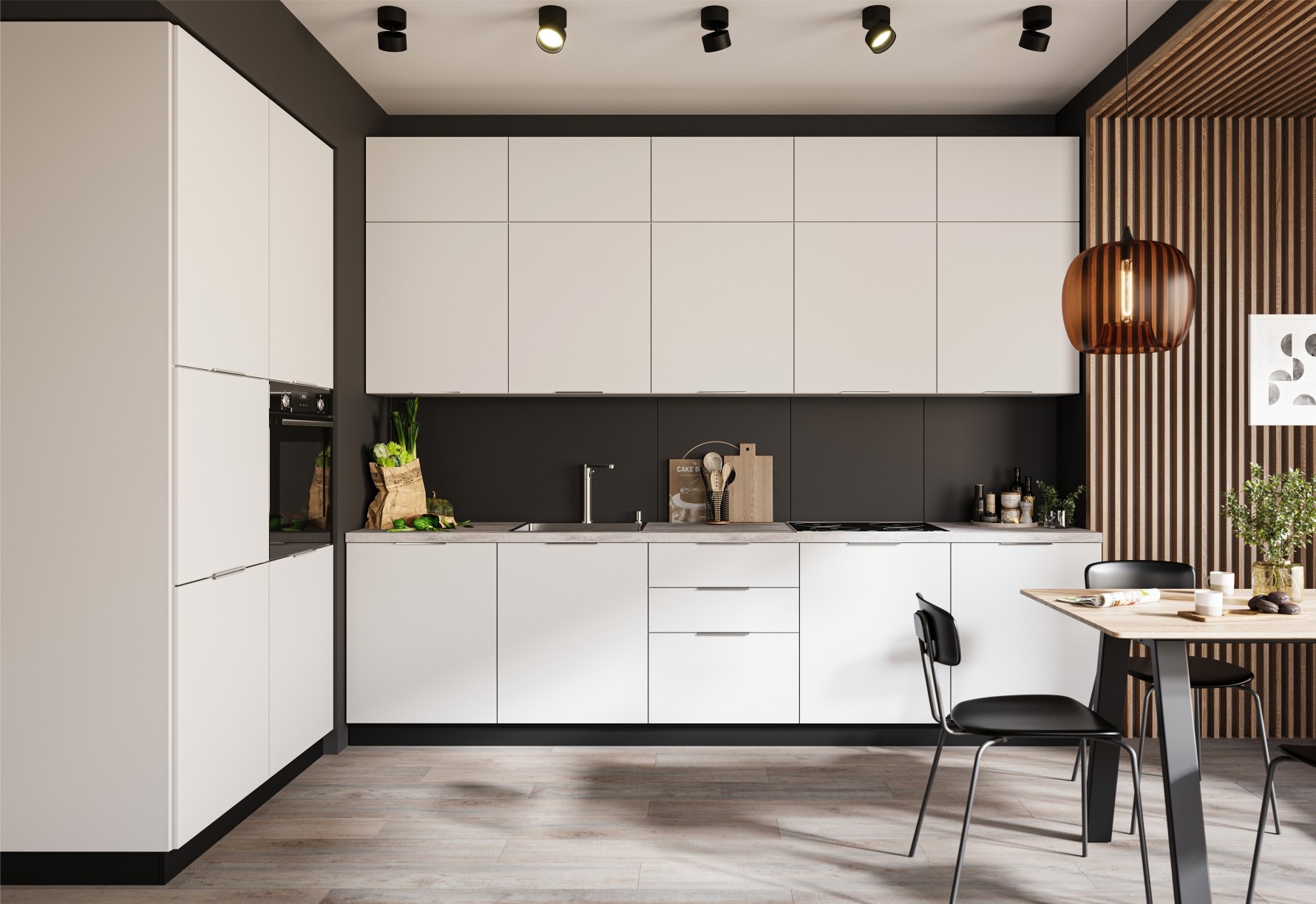 Функциональная кухня Равенна Тренд Софт выполнена в спокойных природных тонах и великолепно смотрится в современных интерьерах. Цвет декора «Монте» на фасадах из МДФ с красивым рисунком под мрамор – эффектный акцент, создает безупречное сочетание с декором цвета темной морской волны Маренго. Инновационное покрытие Soft-touch с матовым, тактильно приятным бархатистым эффектом придает кухне премиальный вид. Покрытие устойчиво к влаге и мелким царапинам, не оставляет следов от пальцев, долго сохраняет цвет и яркость. Торцевые металлические ручки подчеркивают минимализм модулей, обезопасят от травм. Столешница в комплект не входит, можно заказать у нас в размер Вашей кухни.