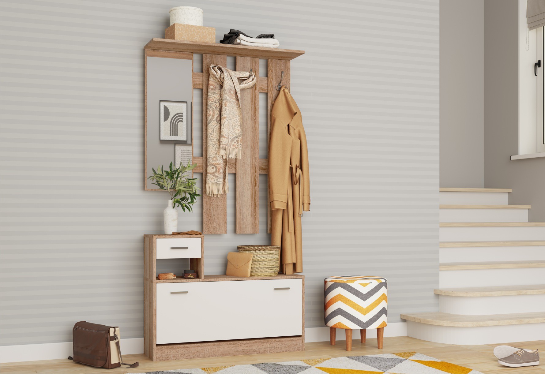 Интер – современная прихожая в стиле минимализм - минимум декора, максимум функционала. Компактная и вместительная, с небольшой глубиной – она поможет правильно организовать пространство в небольшом помещении. Прихожая включает в себя необходимые модули: вешалка с крючками, вместительные обувницы, выдвижные ящики для мелочей, зеркало. Модное сочетание нейтральных цветов дуба сономы и белого наполнит комнату теплым и мягким светом, визуально увеличит пространство. Прихожая подойдет тем, кто любит практичность и разумность. Хорошо сочетается с модулями системы Стелс.