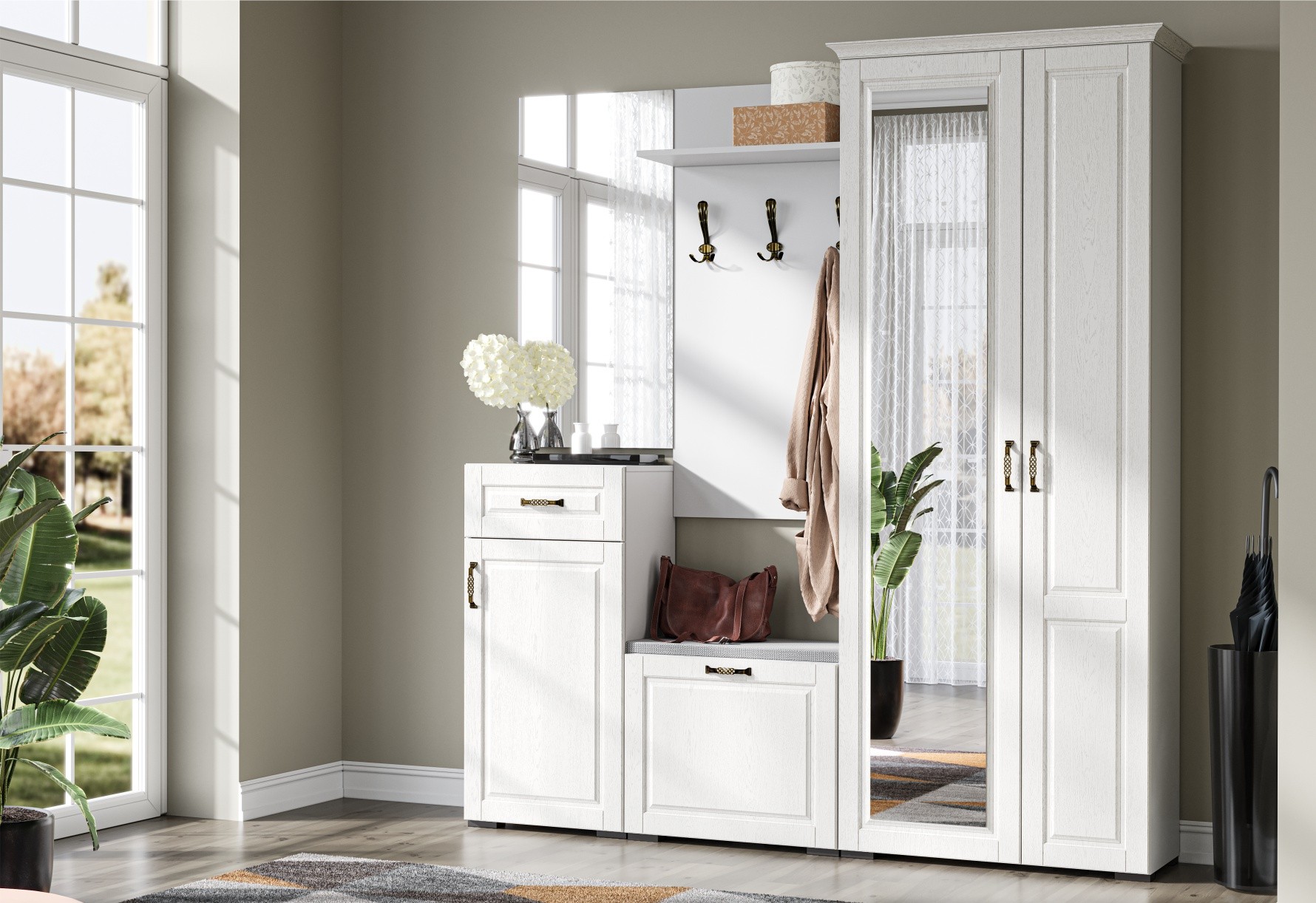 Прихожая Лацио в стиле неоклассики, обладающая высокой функциональностью, соответствует самым актуальным тенденциям в дизайне мебели. Фасады из МДФ с фрезерованной рамкой и имитацией текстуры дерева в сочетании с металлическими ручками добавляют ей изысканности и выразительности. Благодаря белоснежному цвету декора, прихожая визуально расширяет пространство. Большой ассортимент модулей позволяет выстроить систему хранения даже в ограниченном пространстве. Мебель выполнена из качественных материалов, гарантирующих долговечность и безопасность: корпус из экологичного ЛДСП класса эмиссии Е1, петли выдерживают 100 тыс. циклов открывания-закрывания (по ГОСТу достаточно 20 тыс. циклов), задняя стенка и дно ящиков из ламинированной плиты ХДФ, в ящиках комодов телескопические направляющие полного выдвижения.