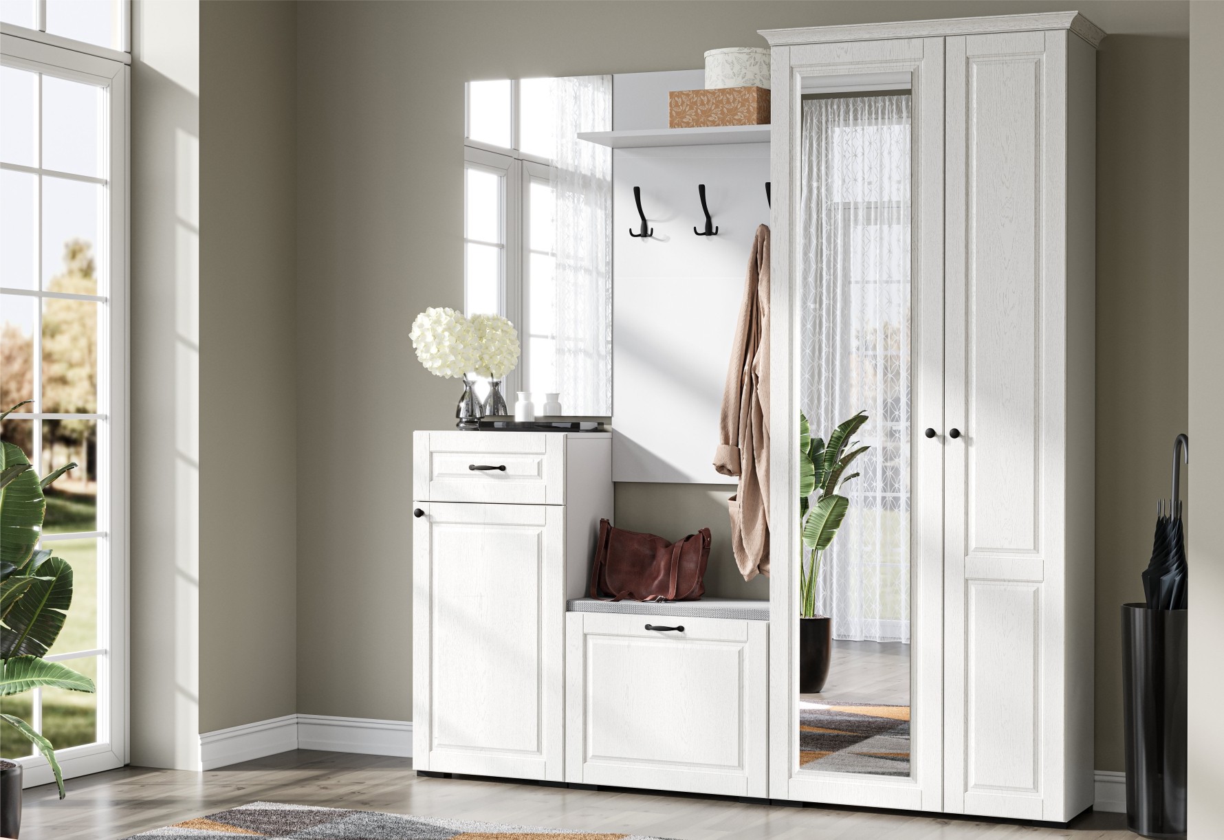 Прихожая Лацио в стиле неоклассики, обладающая высокой функциональностью, соответствует самым актуальным тенденциям в дизайне мебели. Фасады из МДФ с фрезерованной рамкой и имитацией текстуры дерева в сочетании с металлическими ручками добавляют ей изысканности и выразительности. Благодаря белоснежному цвету декора, прихожая визуально расширяет пространство. Большой ассортимент модулей позволяет выстроить систему хранения даже в ограниченном пространстве. Мебель выполнена из качественных материалов, гарантирующих долговечность и безопасность: корпус из экологичного ЛДСП класса эмиссии Е1, петли выдерживают 100 тыс. циклов открывания-закрывания (по ГОСТу достаточно 20 тыс. циклов), задняя стенка и дно ящиков из ламинированной плиты ХДФ, в ящиках комодов телескопические направляющие полного выдвижения.