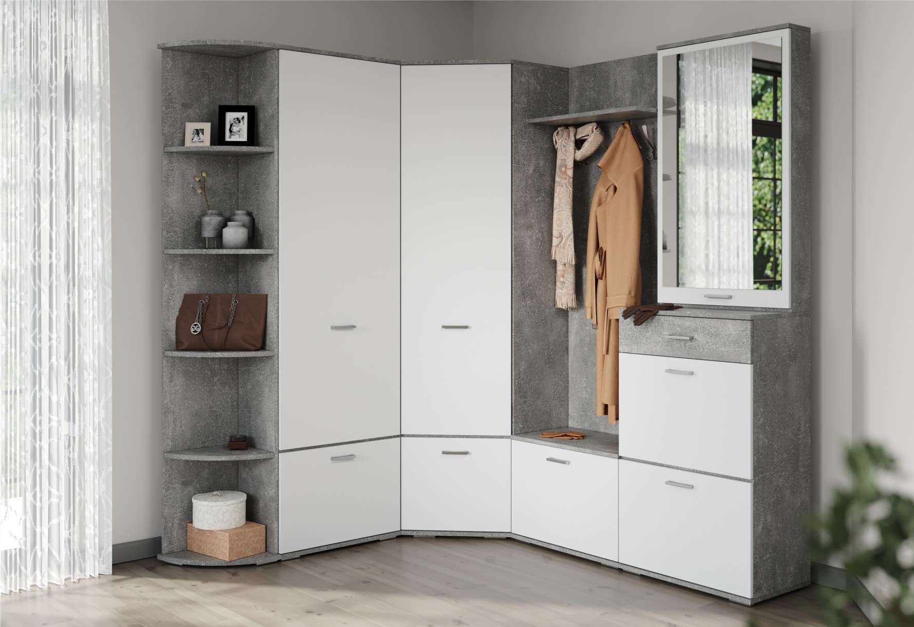 Прихожая "Виола" создаст гостеприимную атмосферу в Вашем доме, а небольшая глубина шкафов и возможность выбора модулей позволит разместить гарнитур в прихожей любых размеров. Удобная тумба с зеркалом, вместительный шкаф со штангой, вешалка для одежды и полки для самых разных вещей. Немного декора, и максимум возможностей!