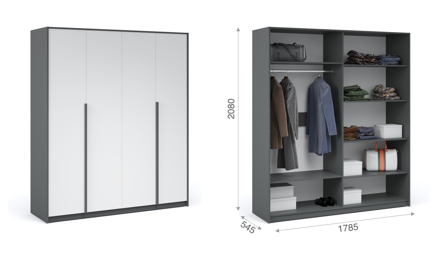 Функциональный распашной шкаф с массивными ручками контрастного цвета включает в себя вместительные полки и отделения со штангой, что позволяет создать систему для хранения вещей различного назначения. Встраиваемая в портал LED подсветка – оригинальное дизайнерское решение и дополнительный источник освещения. Современные цвета декора корпуса и белоснежный фасад добавят в жилое помещение света, уюта и комфорта. Идеально компонуется со всеми модулями системы Мишель.